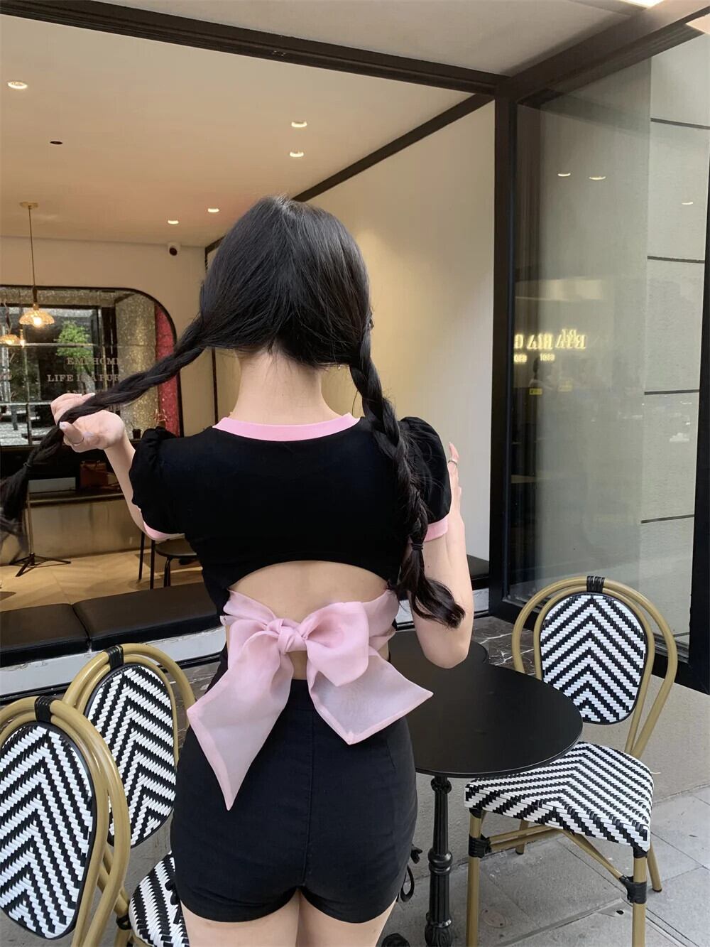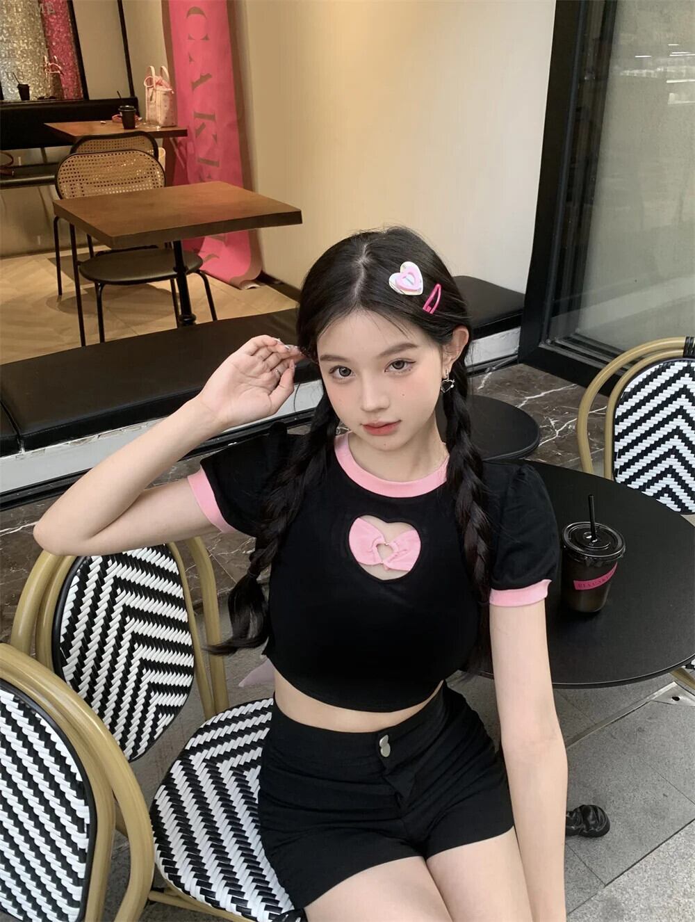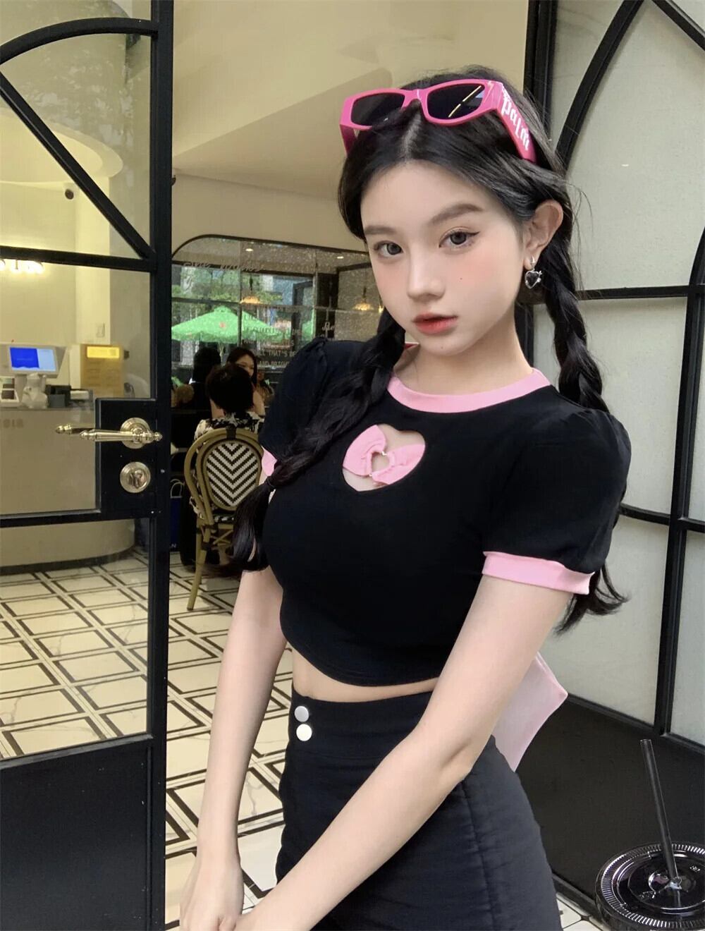 送料無料 Jielur 夏中空アウトコントラストカラーの女性の Tシャツ甘いスリム Tシャツ女性黒シックなストリートトップ ブラック 大人ガーリー スウィート キュート カジュアル サマー 夏物 AE1218878785748276404