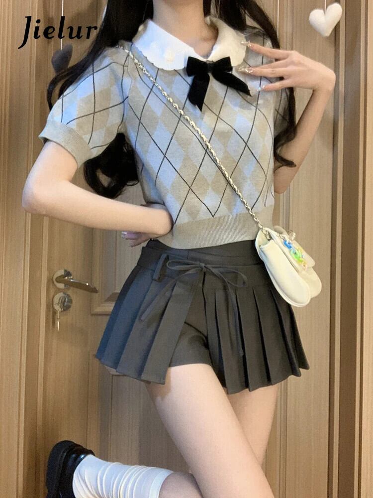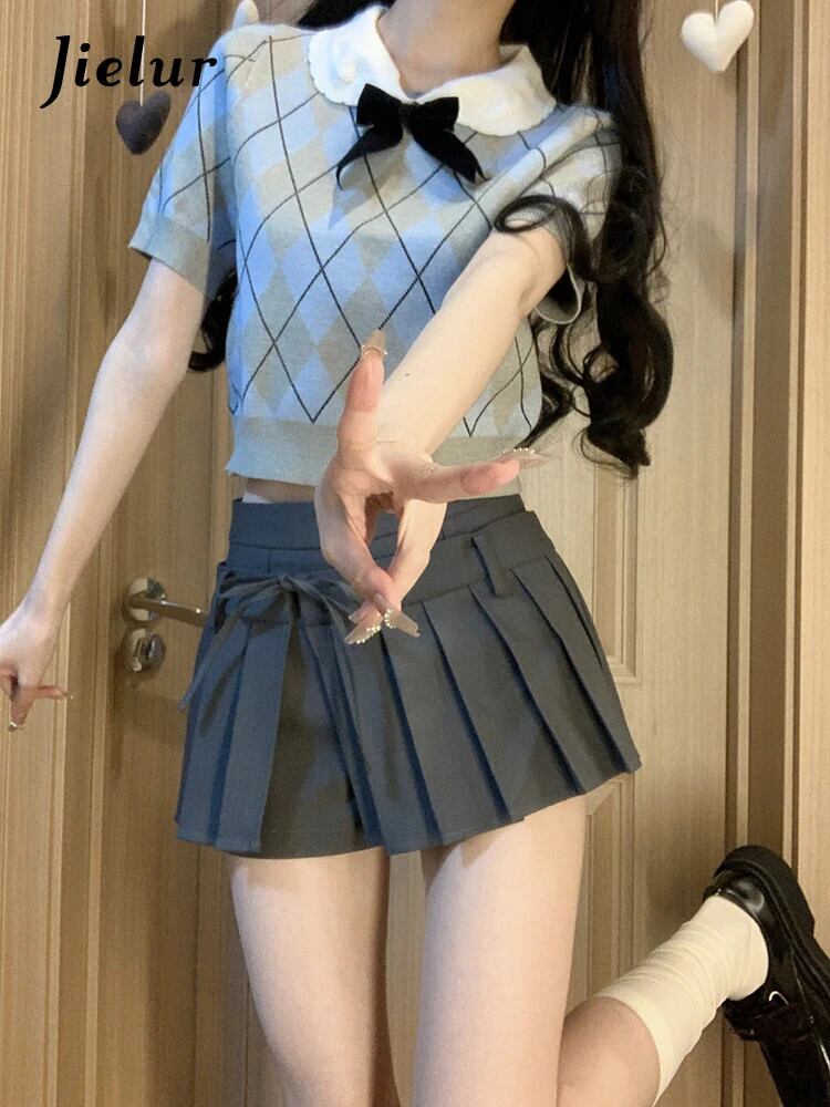 送料無料 Jielur 夏スイート Chicly 女性ブラウスルーズスリム女性ブラウスフレンチニットコントラストカラーボウトップ リボン 大人ガーリー スウィート キュート カジュアル サマー 夏物 AE12188787886157149654