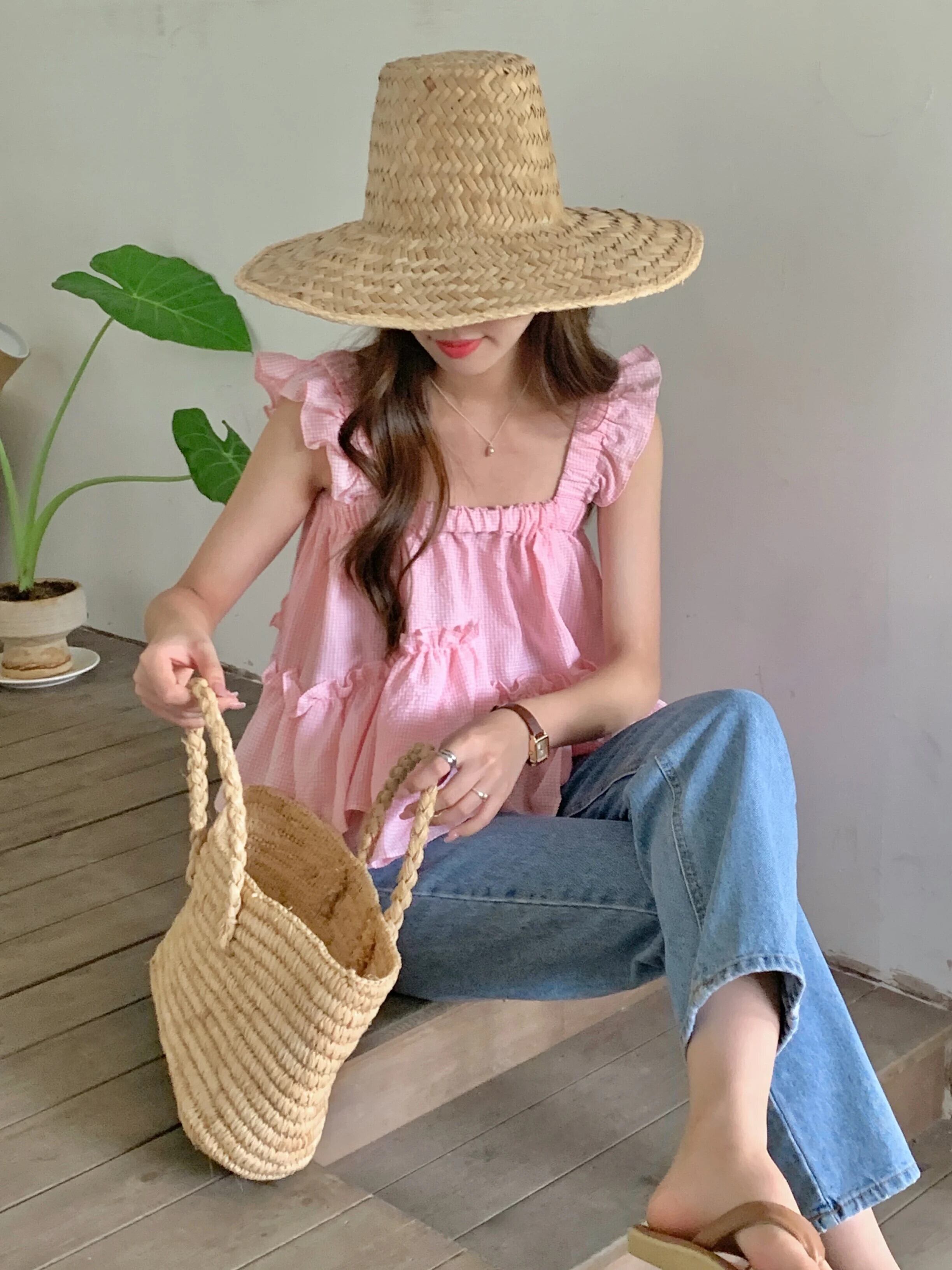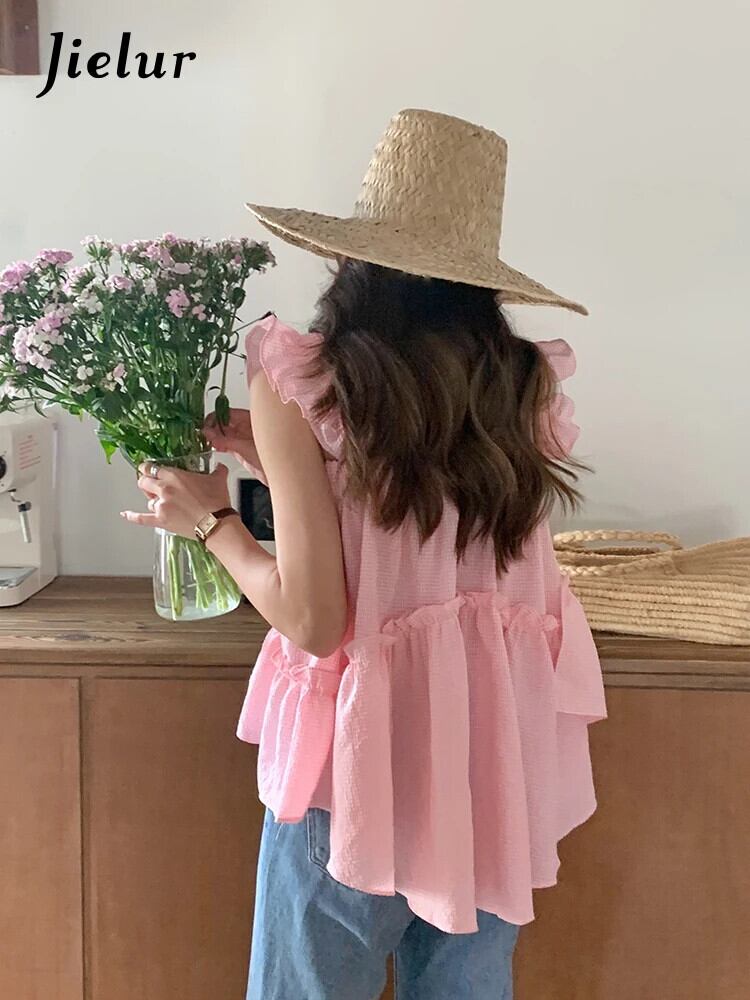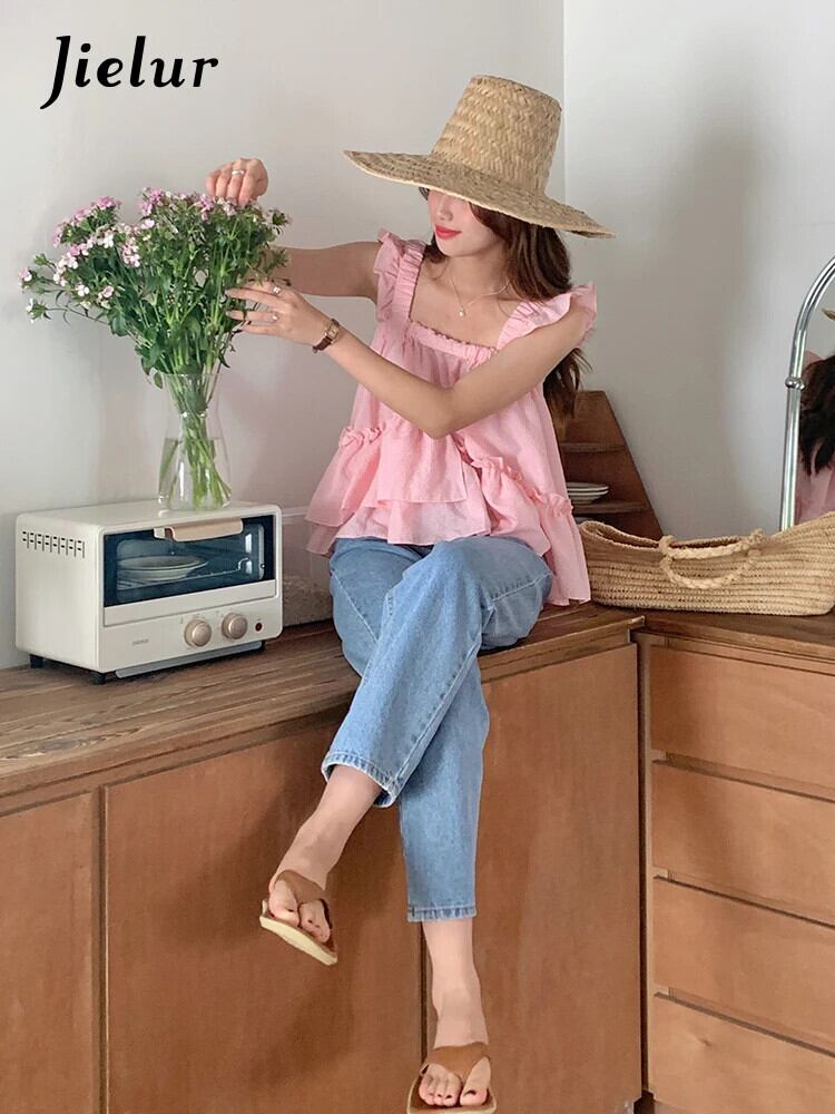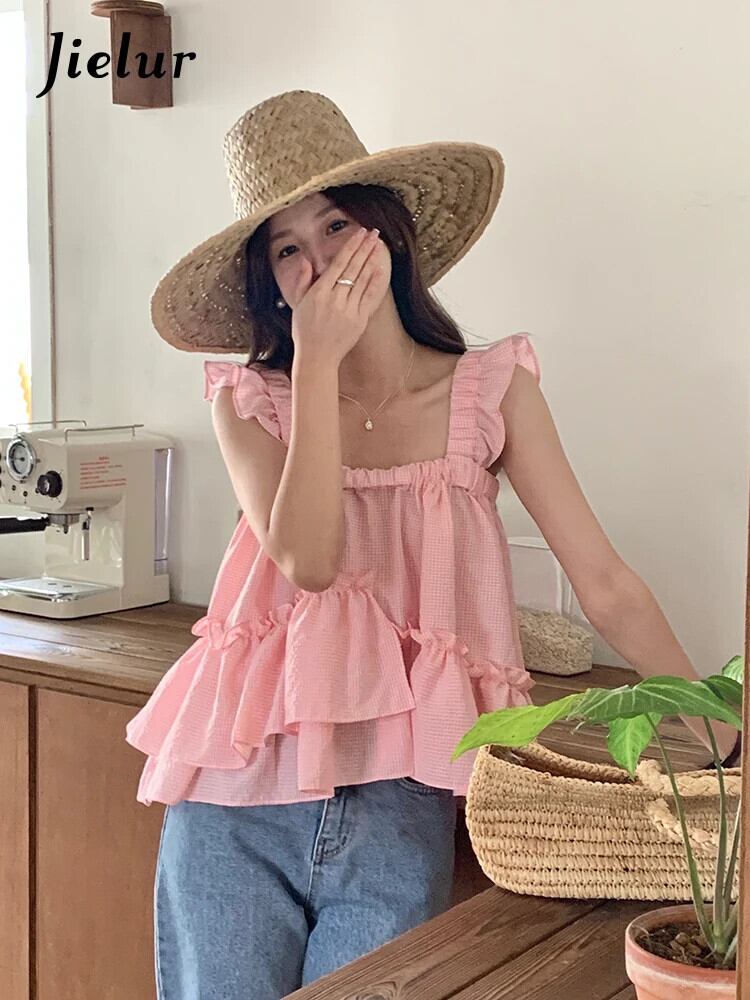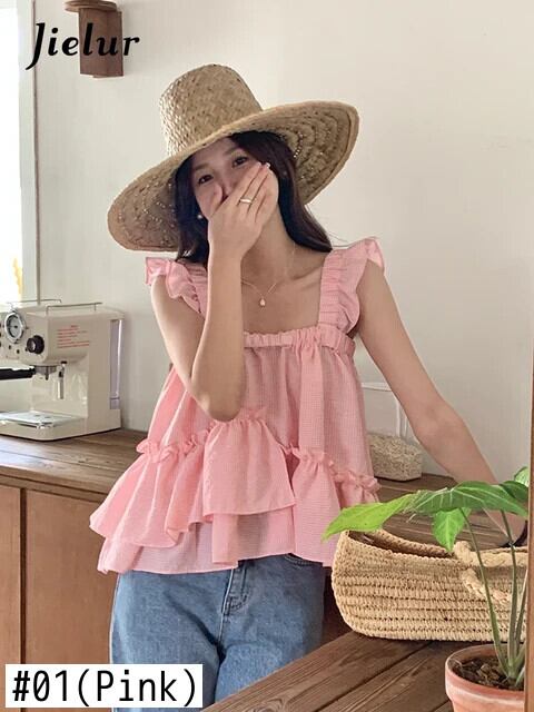 送料無料 Jielur 夏甘い女性タンク無地ルーズストラップレス魅力的なシックなフリルタンク ラッフル 大人ガーリー スウィート キュート カジュアル サマー 夏物 ソリッドカラー AE12188787881487510969