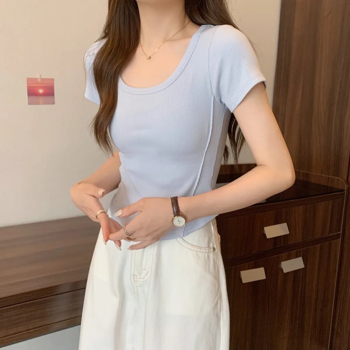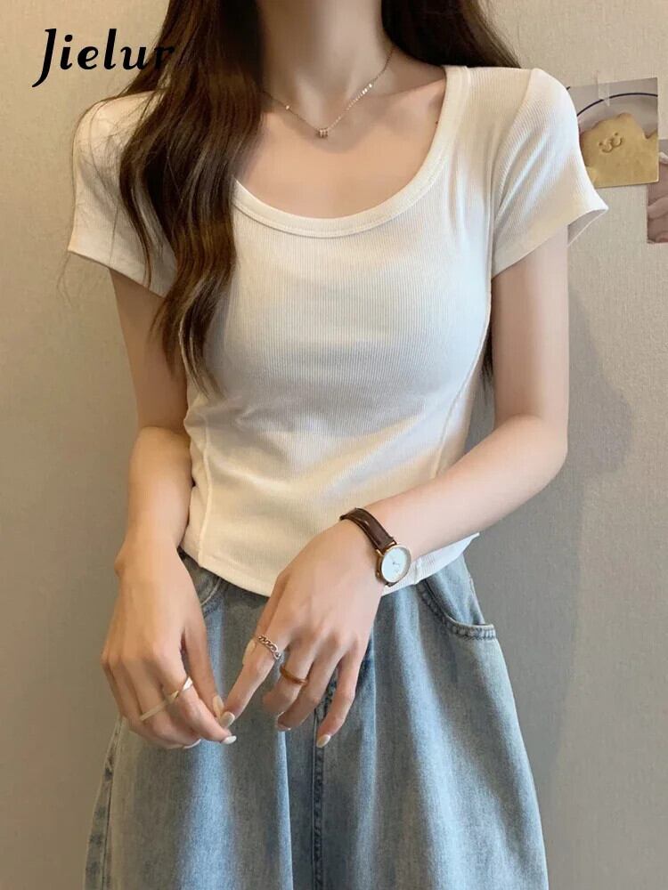 送料無料 Jielur 夏無地スリム女性の Tシャツシンプルなベーシック Tシャツ女性黒、白、青 Chicly トップ ホワイト ブルー ブラック サマー 夏物 ソリッドカラー AE12188787897617501229