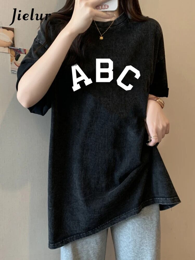 送料無料 Jielur O ネックルーズ半袖 Tシャツ女性シンプルな手紙トップ Tシャツ黒の Tシャツストリート女性の服 ブラック Oネック AE12188787829840640217