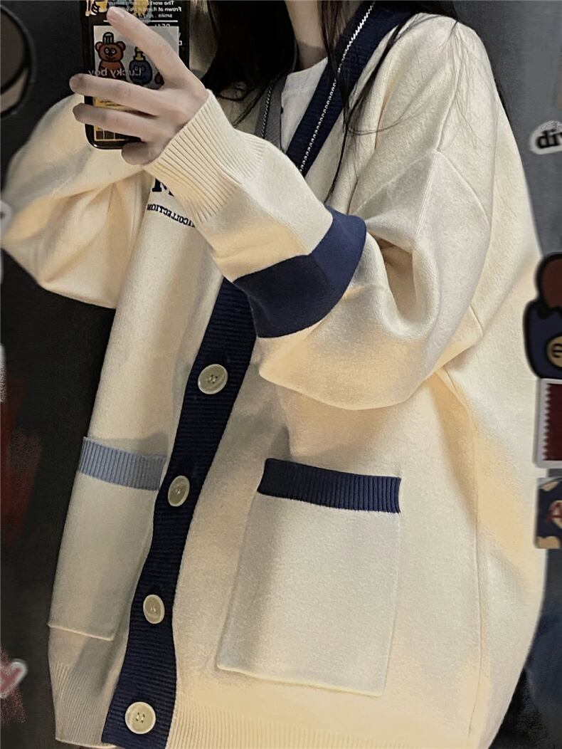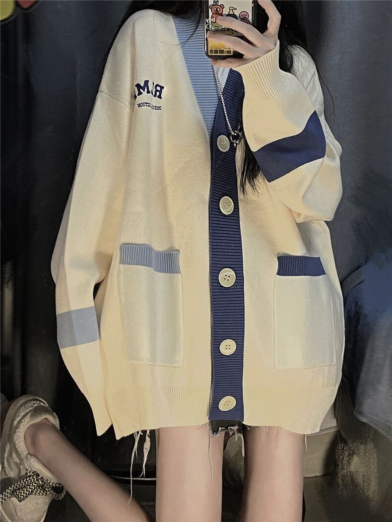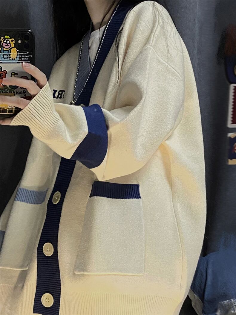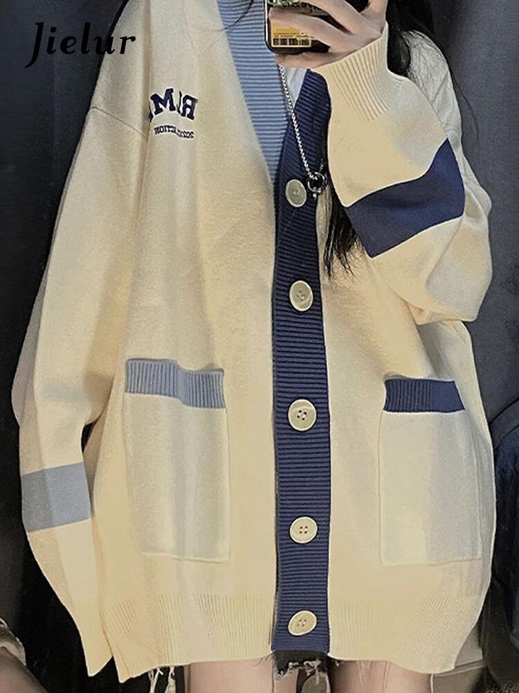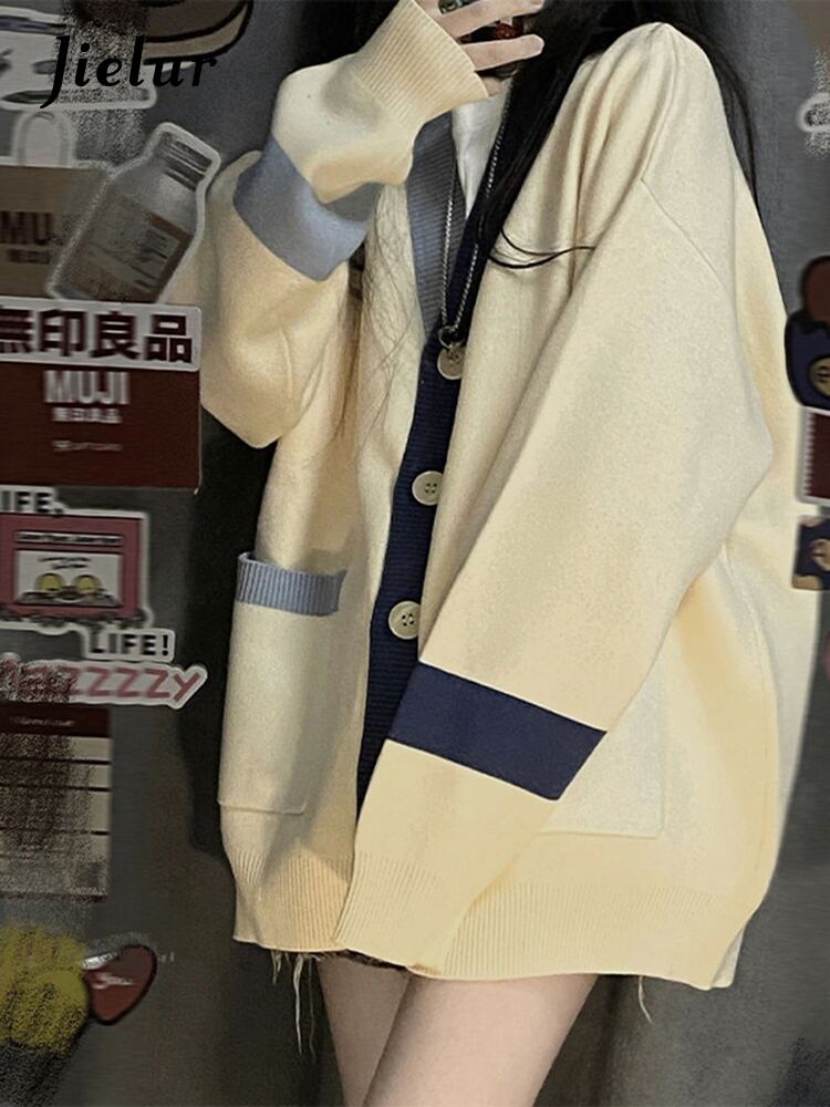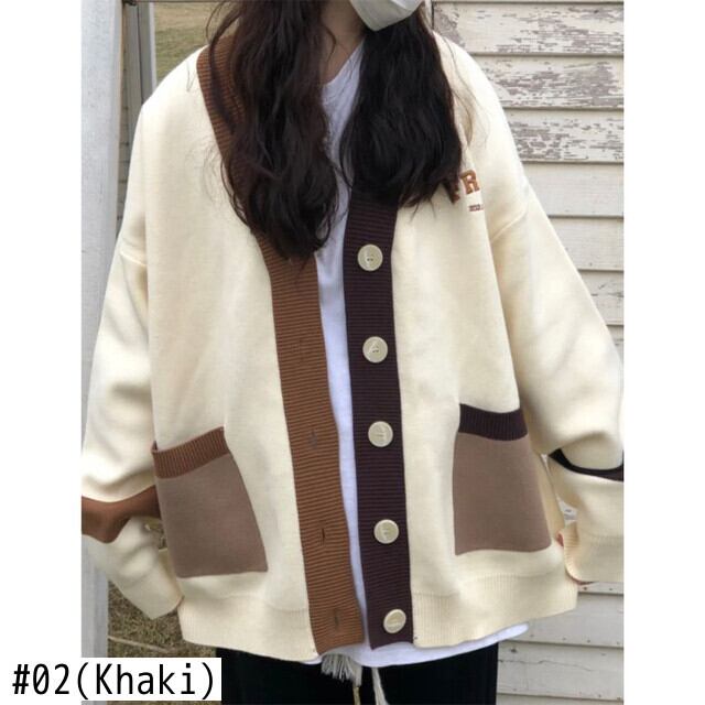 送料無料 Jielur 秋のコントラストカラースリム女性カーディガンヴィンテージルーズ女性カーディガンカーキブルーシックな V ネックニットトップ オータム 秋物 Vネック ビンテージ AE12188787875320944399