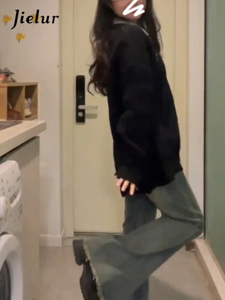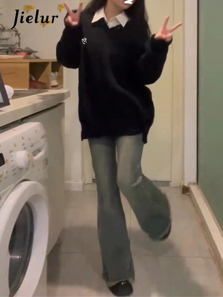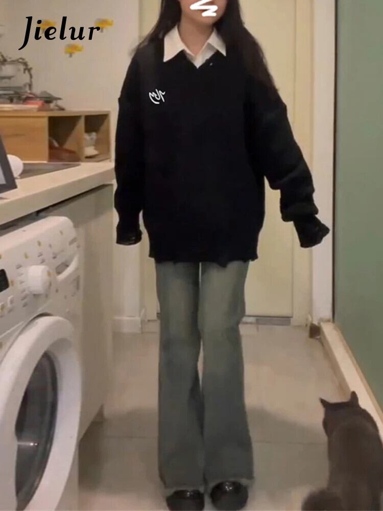 送料無料 Jielur 無地スリム女性プルオーバールーズストリートシンプルなベーシックプルオーバー春黒ニット V ネックトップ ブラック スプリング 春物 Vネック ソリッドカラー AE12188787875063118438