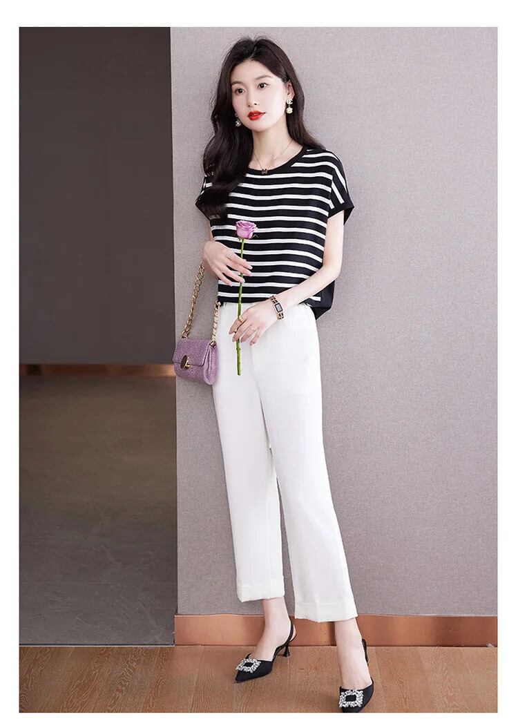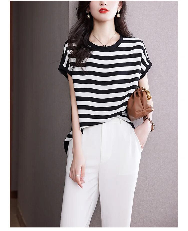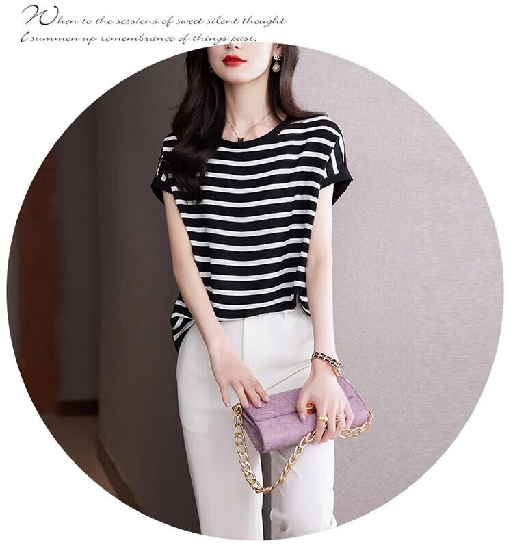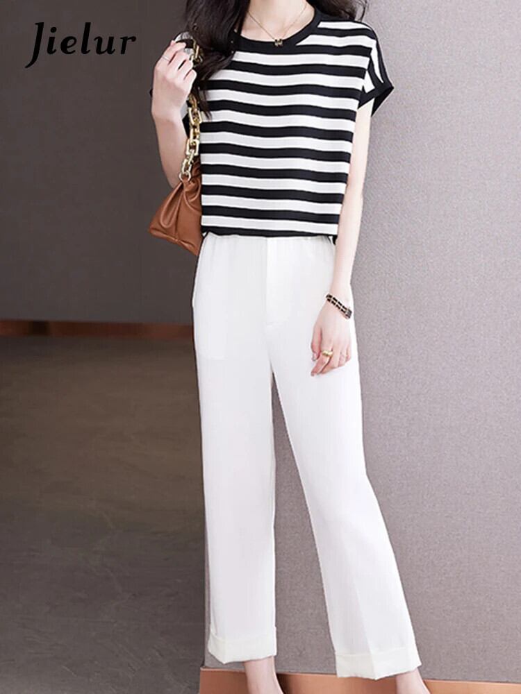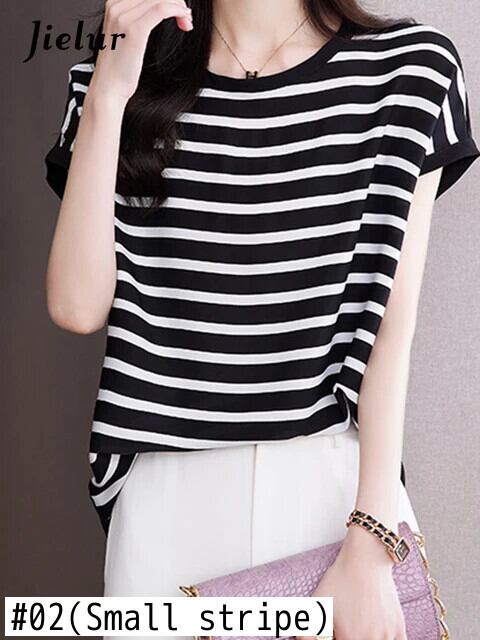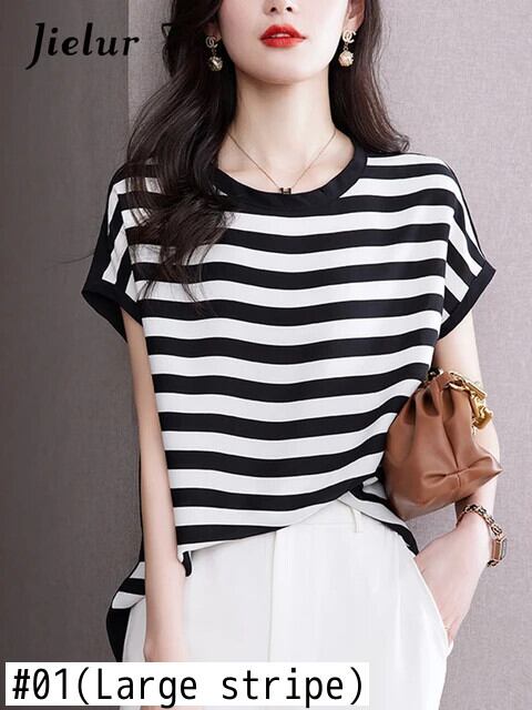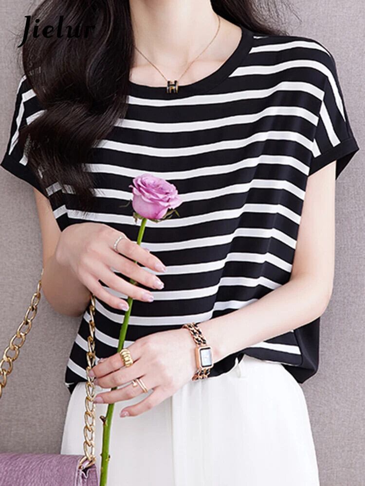 送料無料 Jielur フレンチシンプルなルーズ女性の Tシャツスリムサイドストライプ夏の Tシャツ女性シックなベーシック O ネックトップ サマー 夏物 Oネック AE12188787874457278300
