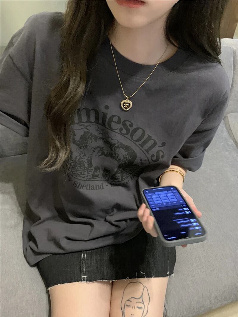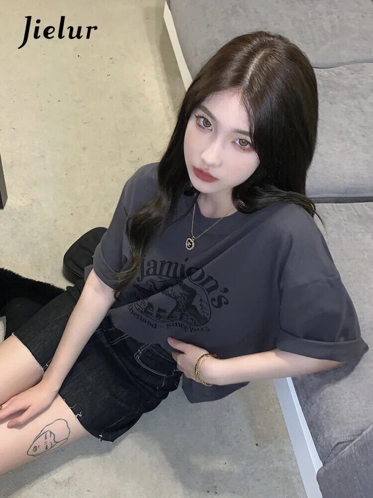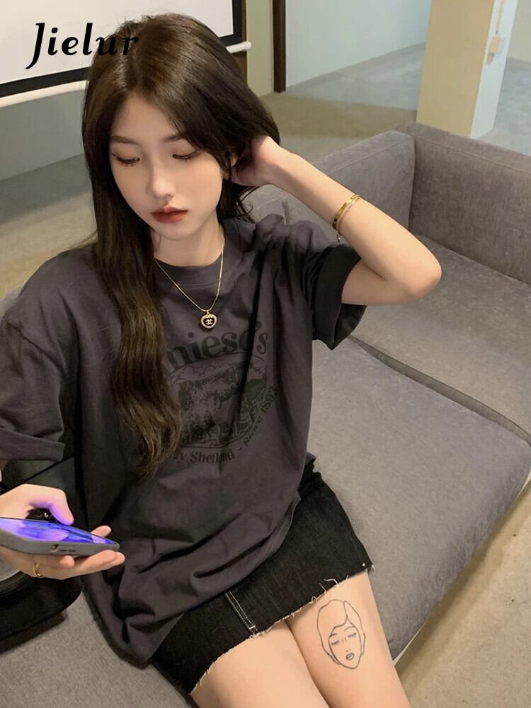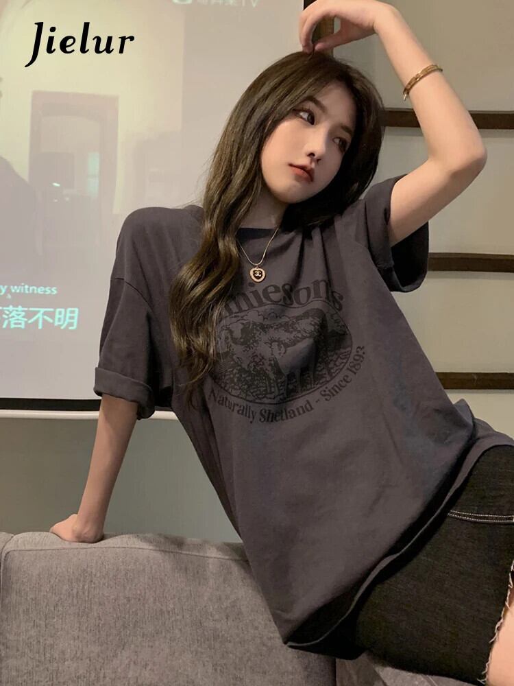 送料無料 Jielur グレー半袖 Tシャツ原宿ストリート Tシャツ夏 O ネック漫画プリント Tシャツ Tシャツ女性 ショート ハーフスリーブ かわいい サマー 夏物 Oネック AE12188787819535985338