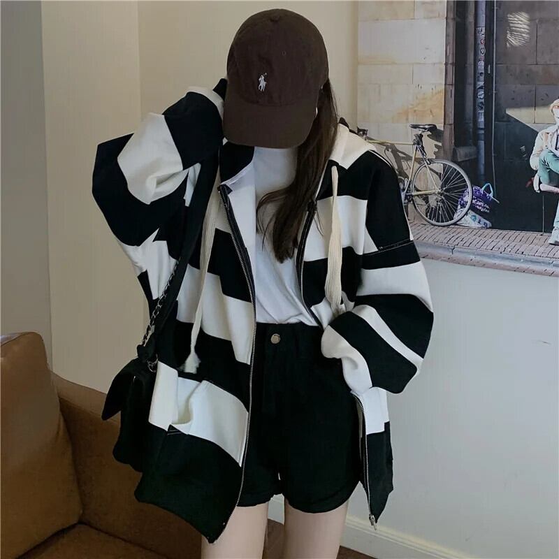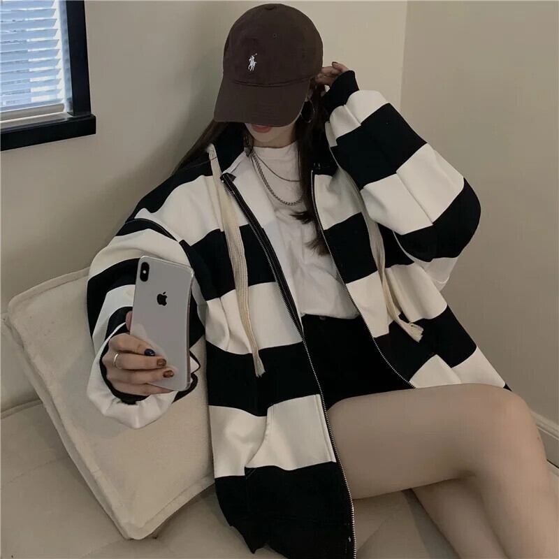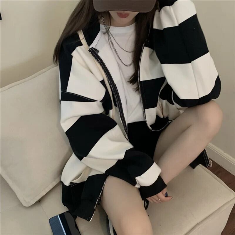 送料無料 Jielur コントラストカラーシックな巾着フード付きストライプパーカージッパーポケットルーズ女性パーカー AE12188787818546724271