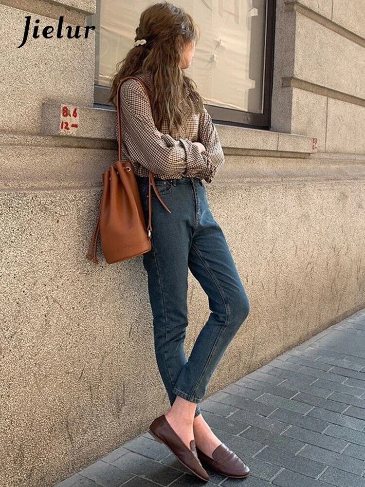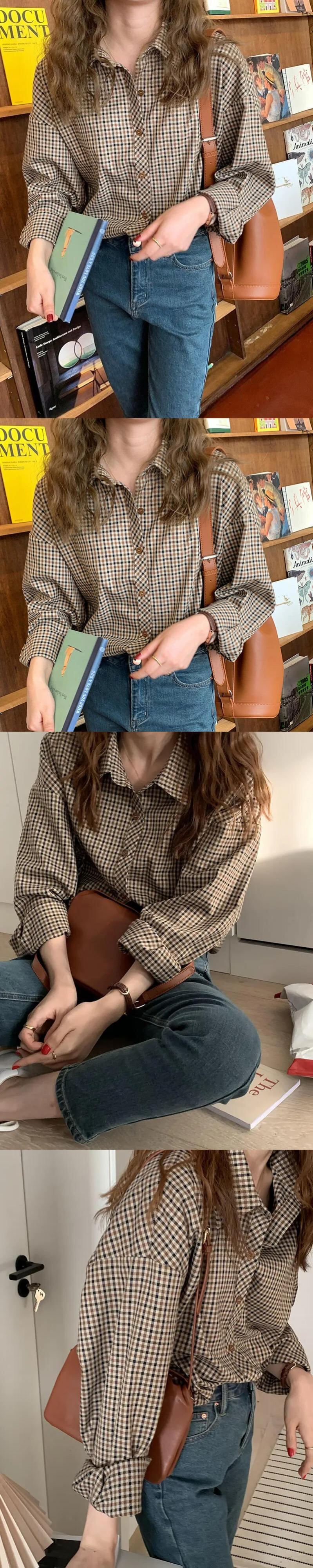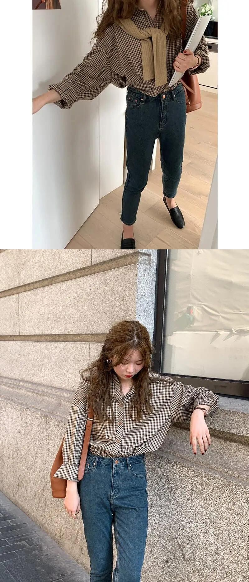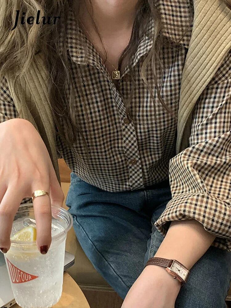 送料無料 Jielur チェック柄シャツ女性の基本的なクリックターンダウン襟レトロルーズオフィスレディスタイル長袖ブラウス ロング 会社 学校 通勤や通学にも AE12188787876916737157