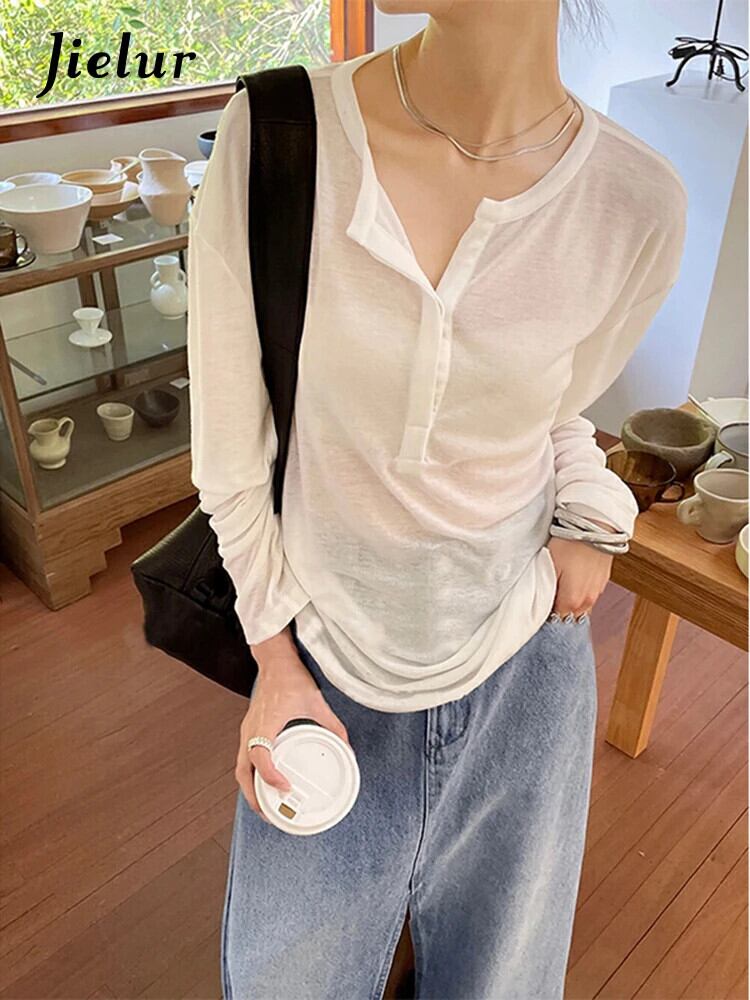送料無料 Jielur 夏スリム長袖女性の Tシャツルーズシンプルなベーシック Tシャツ女性ホワイトストリートシックトップ ロング サマー 夏物 AE12188787877721839010