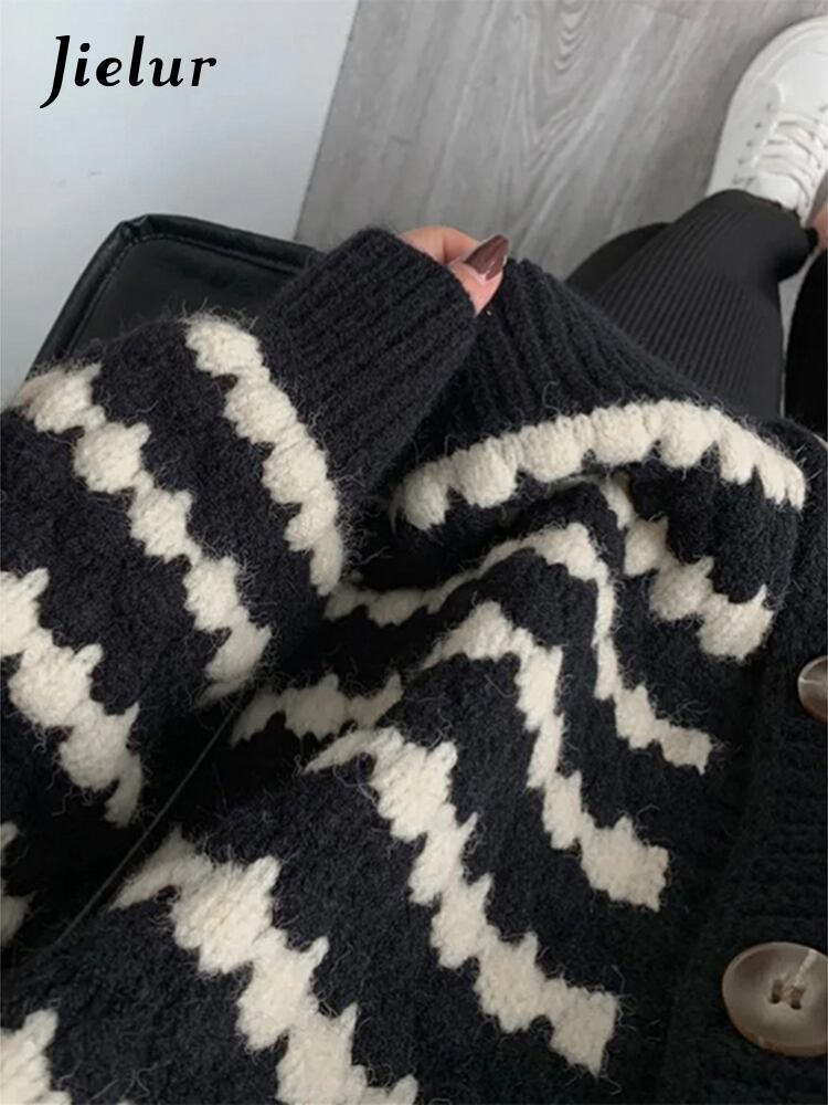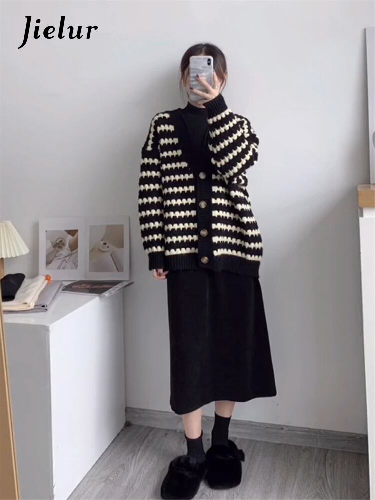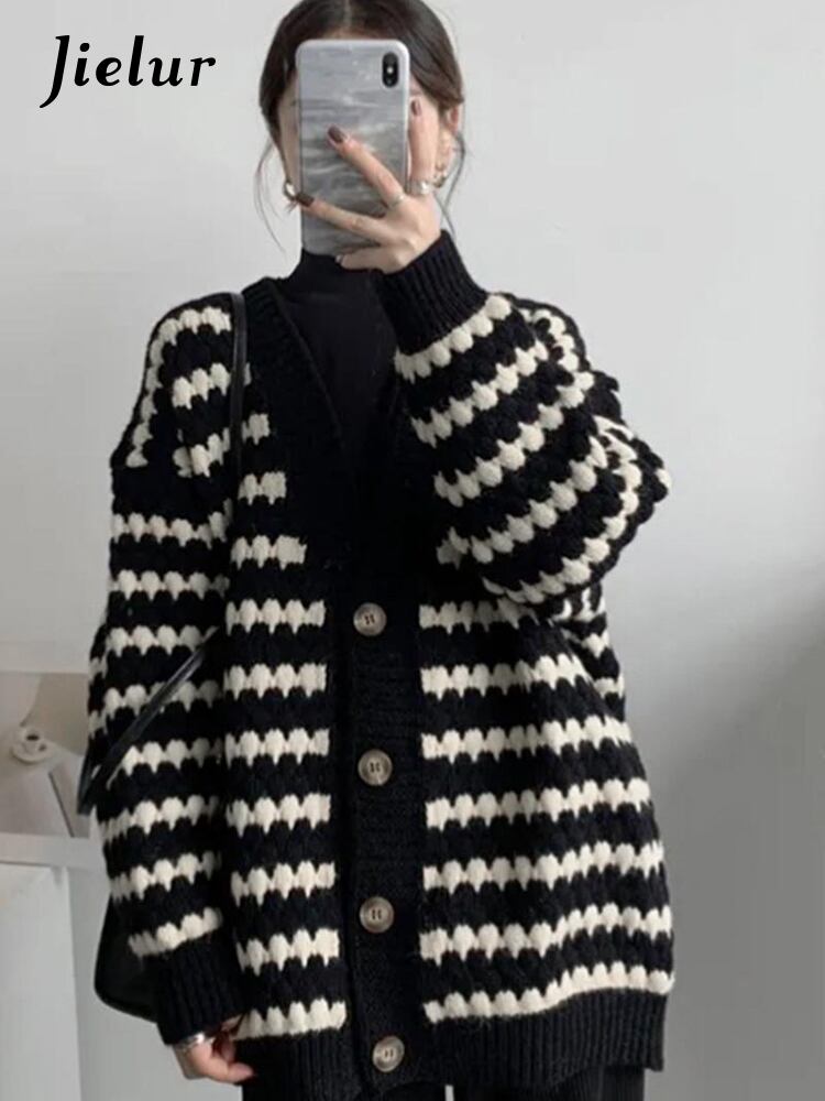 送料無料 Jielur 秋の甘いカーディガン女性ルーズ黒カーディガンストリートストライプニットトップ女性 ブラック 大人ガーリー スウィート キュート カジュアル オータム 秋物 AE12188787834803865661