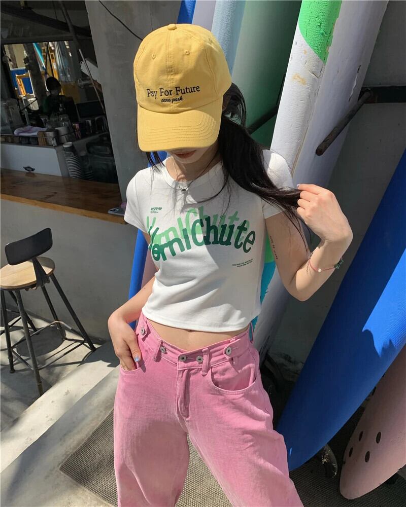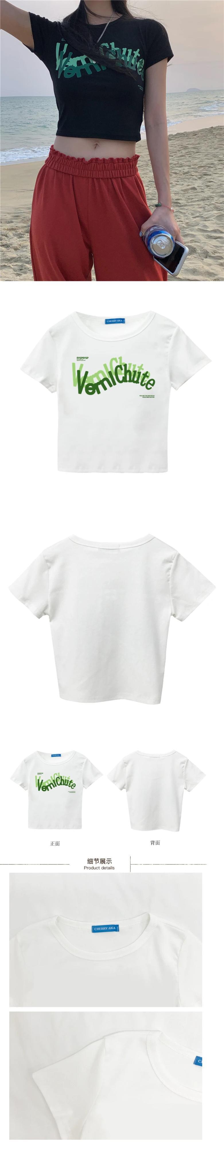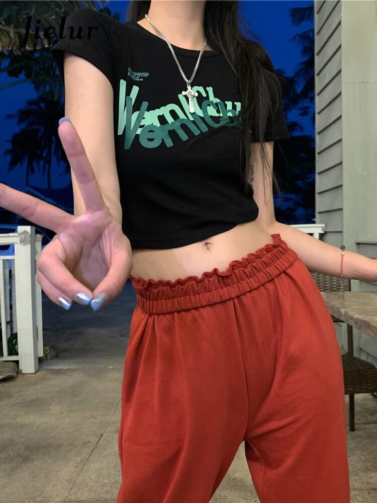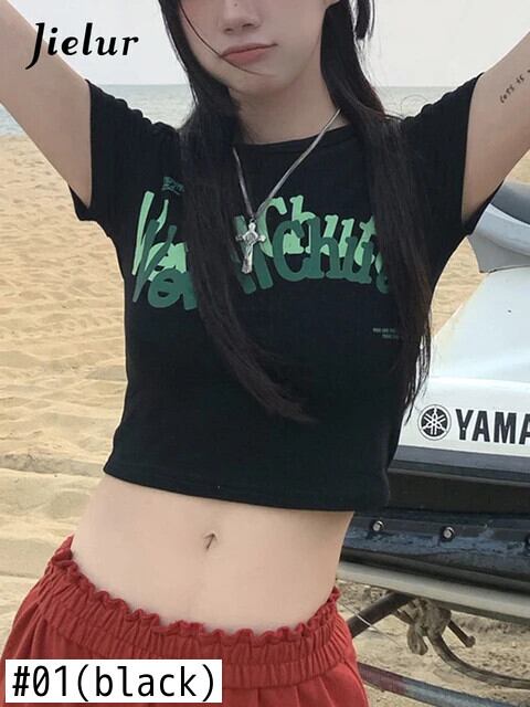 送料無料 Jielur シックなレタープリントクロップトップ半袖スリムブラックホワイトレディース Tシャツ夏ショート Tシャツレトロストリート ハーフスリーブ サマー 夏物 AE1218878783376201374