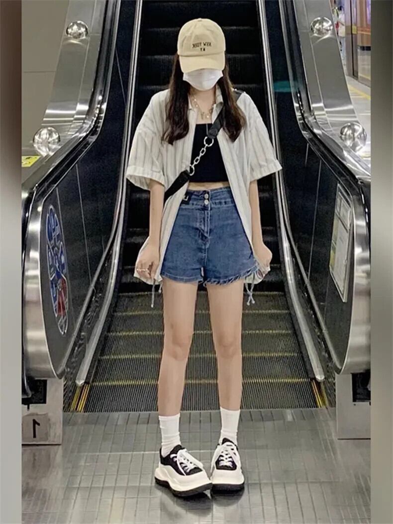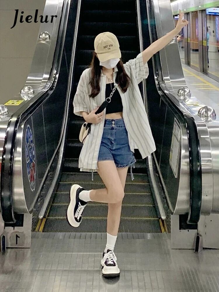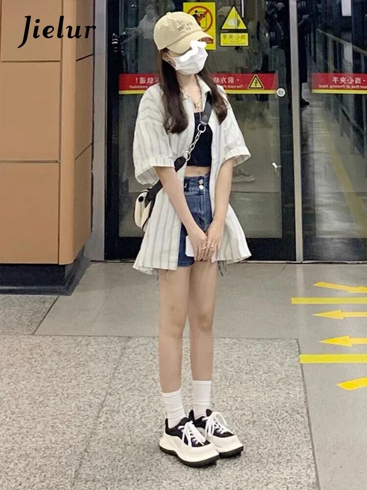 送料無料 Jielur 夏縦ストライプスリム女性シャツ甘いシャツ女性ルーズポロネック半袖トップ女性 ハーフスリーブ 大人ガーリー スウィート キュート カジュアル サマー 夏物 AE12188787855675223337