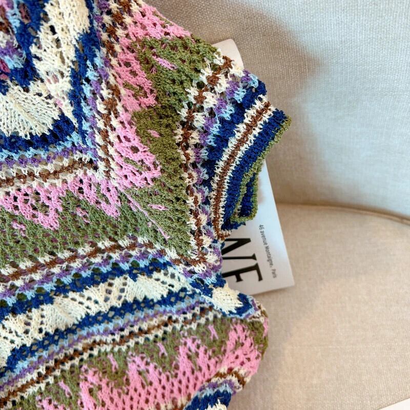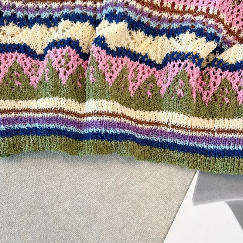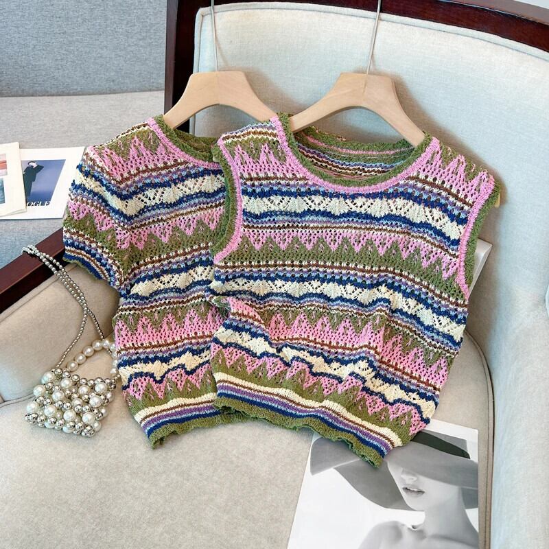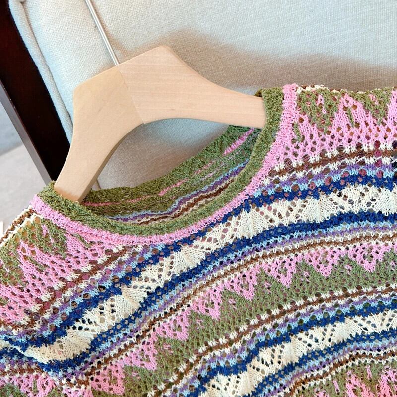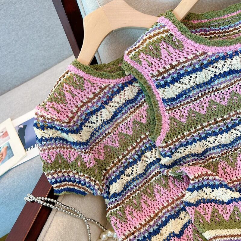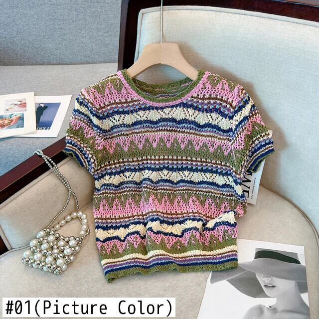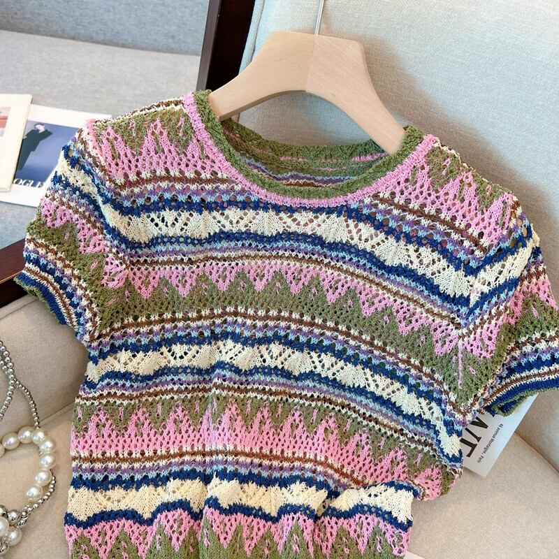 送料無料 Jielur 夏ヴィンテージストライプ中空アウト女性のブラウスシックなスリムニットブラウス女性ルーズトップ サマー 夏物 ビンテージ AE12188787814956024106