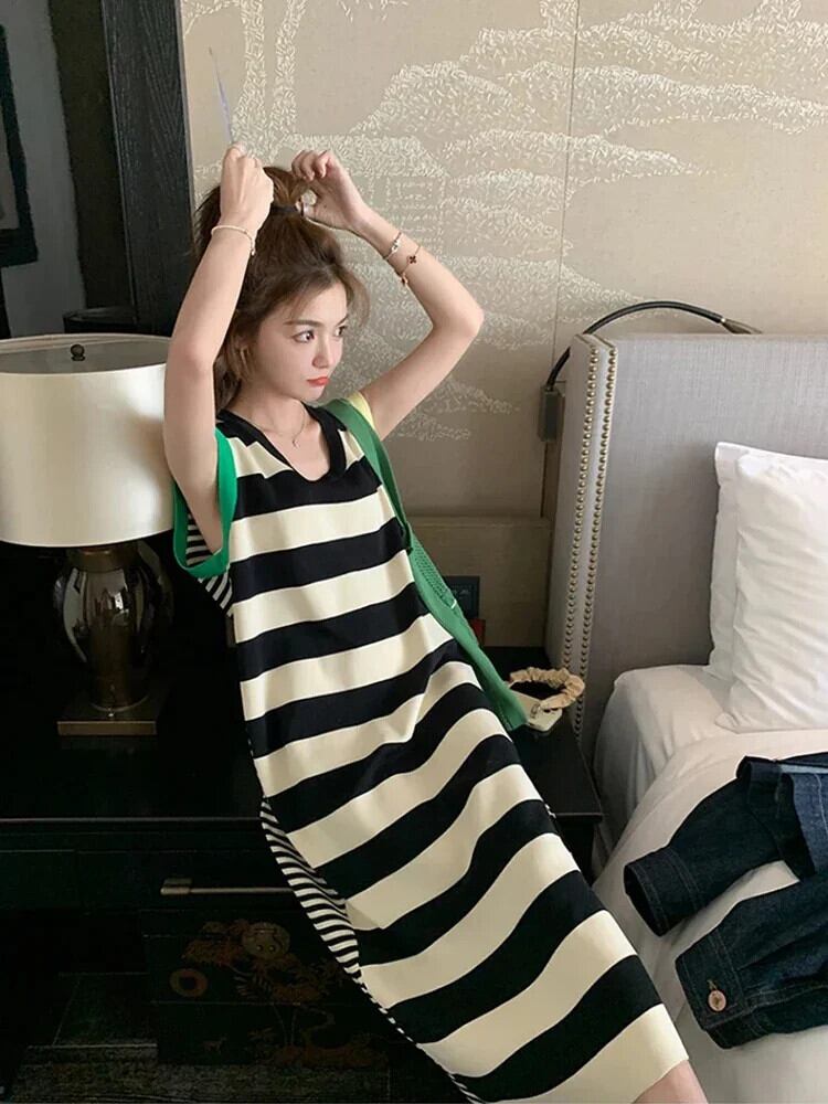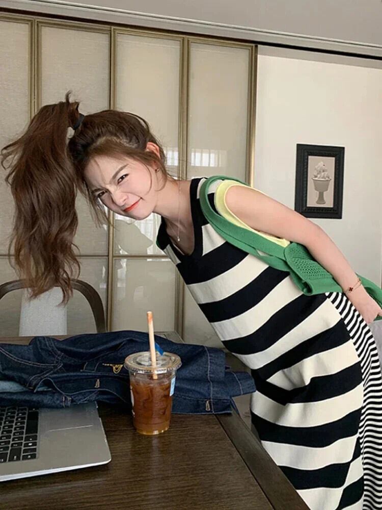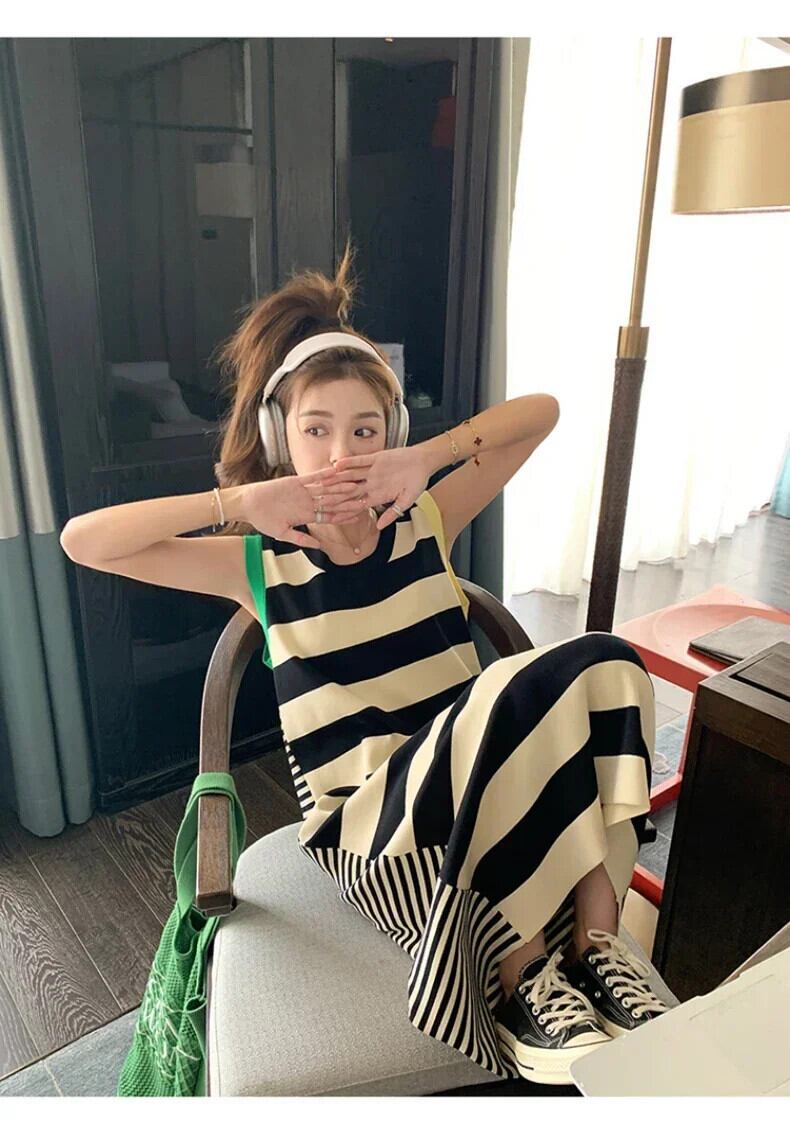送料無料 夏のフレンチストライプの女性のドレスルーズノースリーブドレス女性スイートストリートシックなドレス 大人ガーリー スウィート キュート カジュアル サマー 夏物 AE12188787818813472052