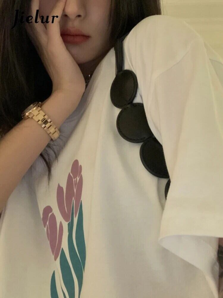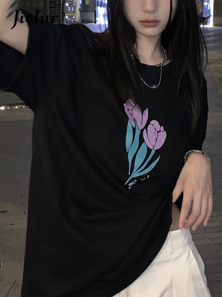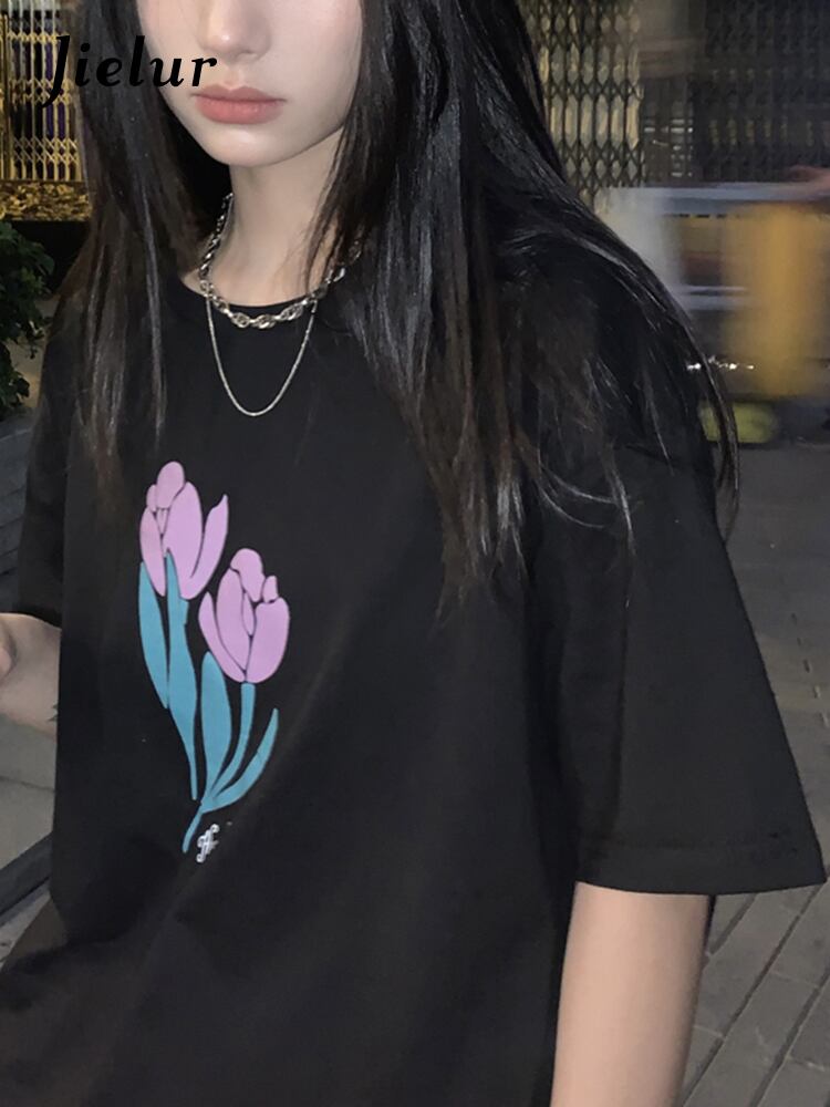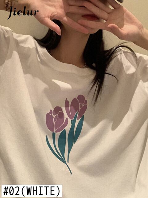 送料無料 Jielur ルース原宿レディース Tシャツ綿黒白 Tシャツトップ人格フラワープリント半袖 Tシャツ ショート ホワイト ブラック コットン ハーフスリーブ かわいい フラワーデザイン AE12188787837615310378