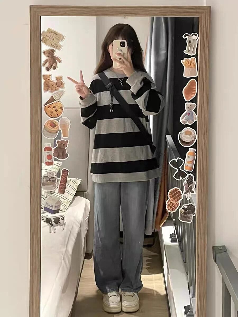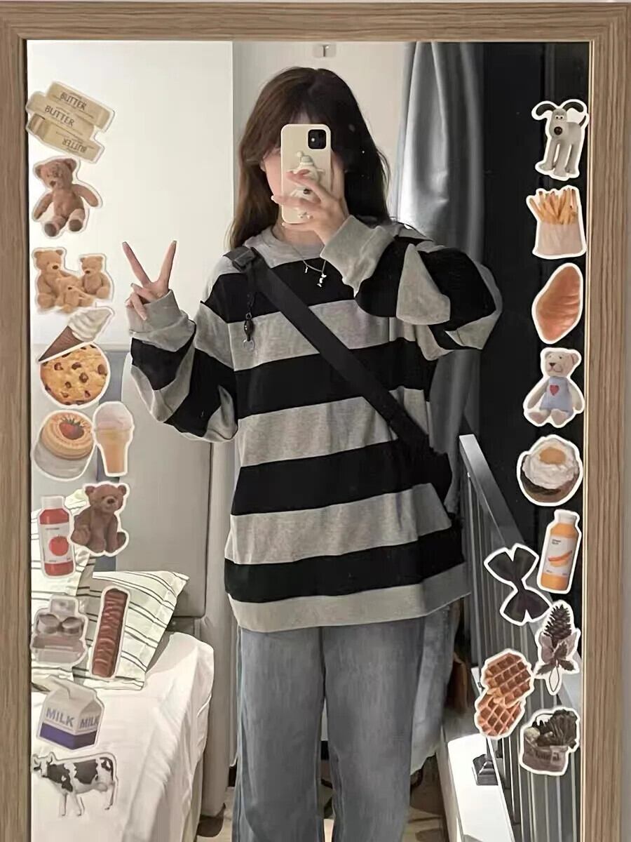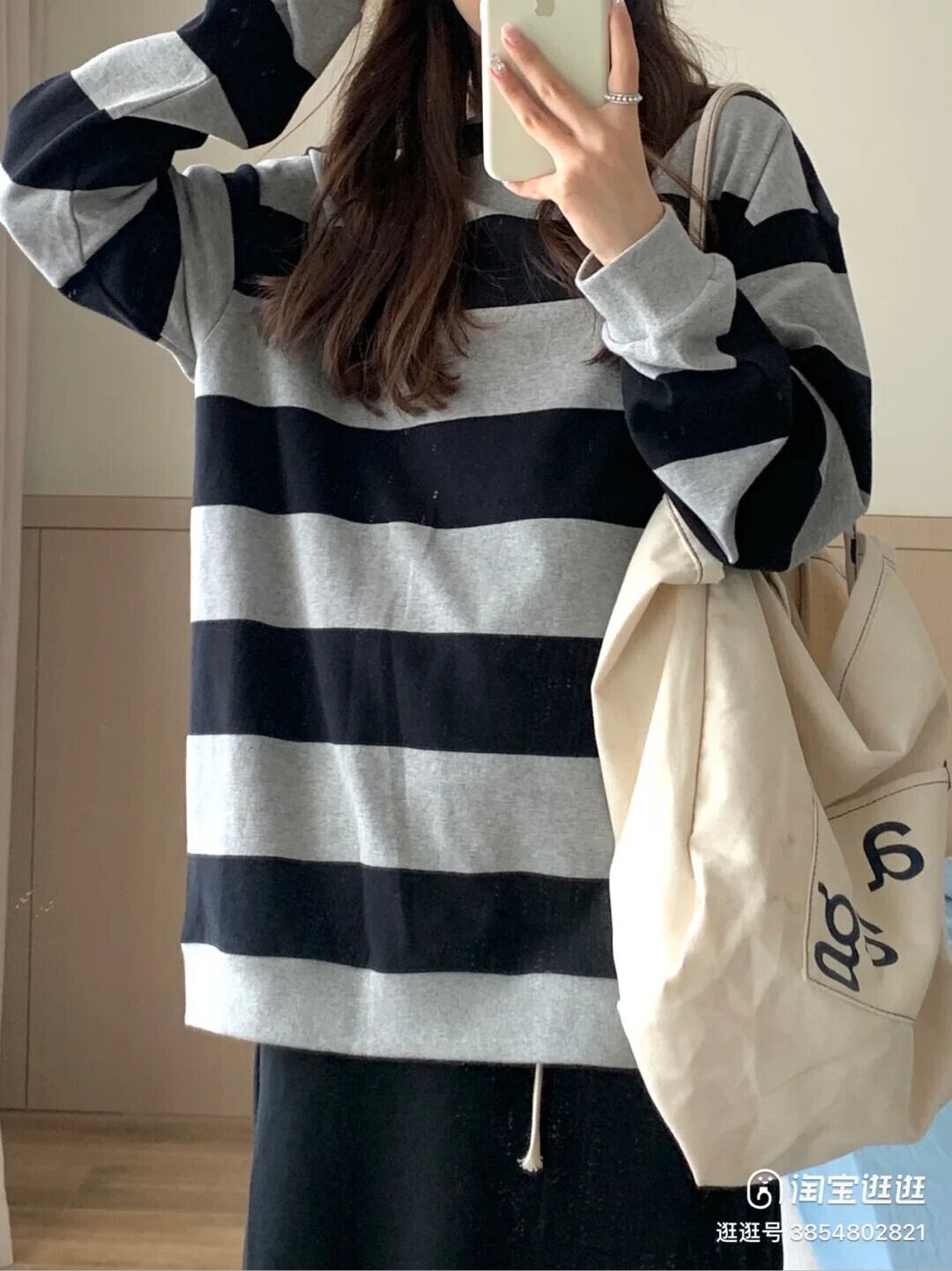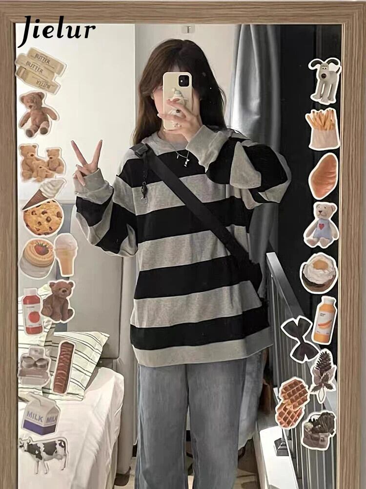 送料無料 Jielur 秋アメリカンヴィンテージスリム女性パーカールーズシックなストライプパーカー女性シンプルなベーシックストリートトップ オータム 秋物 ビンテージ AE12188787845659011340