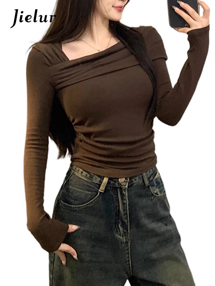 送料無料 Jielur 秋のセクシーなソリッドカラーの女性 Tシャツスリムオフショルダー Tシャツコーヒーホワイトブラックシンプルな長袖トップ ロング オータム 秋物 AE12188787826621896503