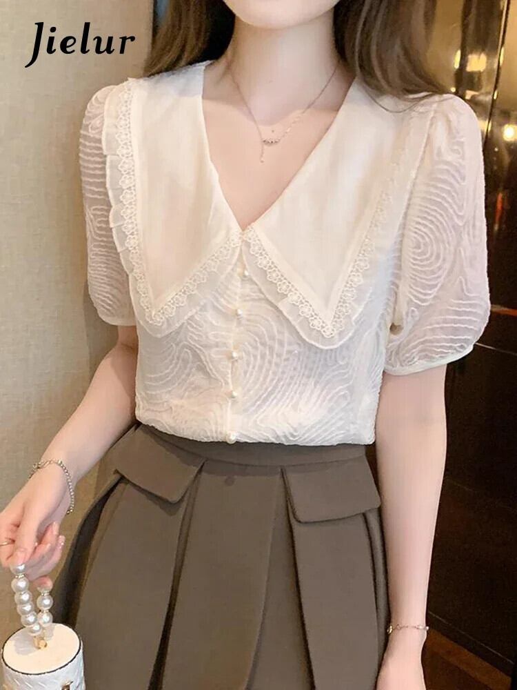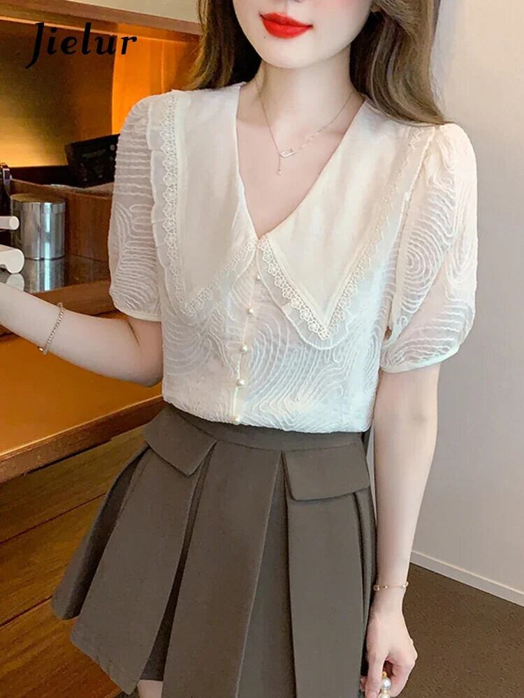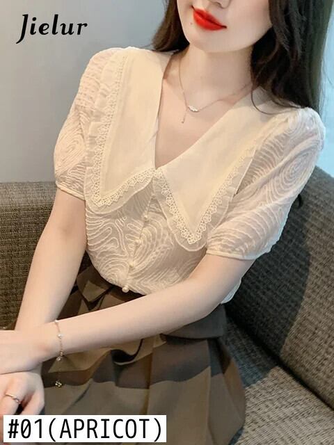 送料無料 Jielur 夏刺繍女性ブラウス無地甘いブラウス女性アプリコットシンプルな V ネックトップ 大人ガーリー スウィート キュート カジュアル サマー 夏物 Vネック ソリッドカラー AE12188787851966577773
