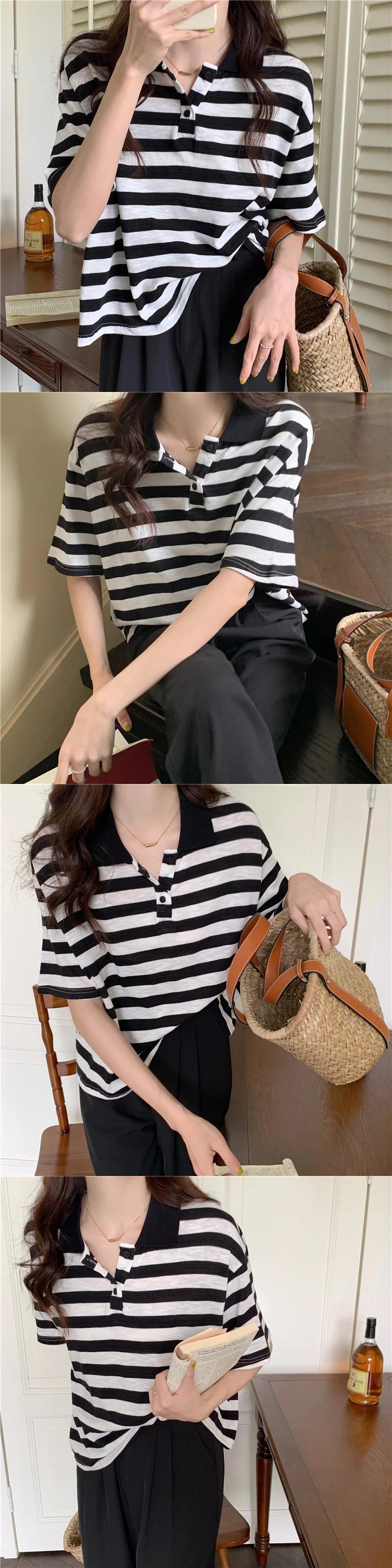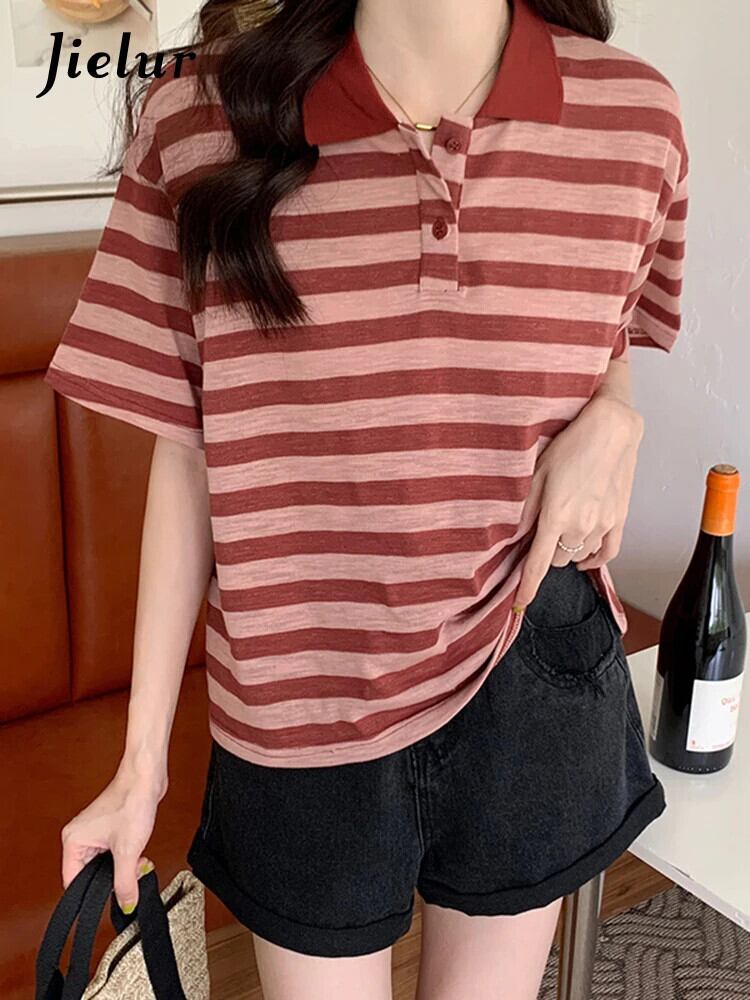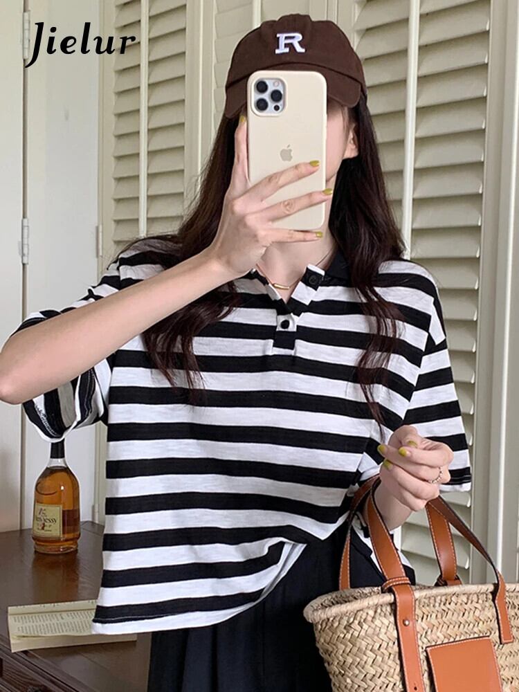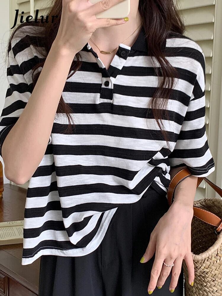 送料無料 Jielur スペルカラーストライプ Tシャツレトロプレッピーポロ Tシャツ女性半袖青黒トップ学生 Tシャツ M-XL ショート ブルー ブラック ハーフスリーブ AE121887878192623108
