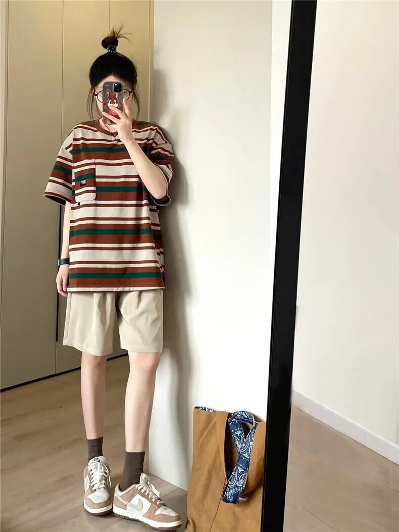 送料無料 Jielur 夏アメリカンヴィンテージ女性の Tシャツルーズコントラストカラー Tシャツ女性ストライプストリートトップ サマー 夏物 ビンテージ AE12188787868164123385