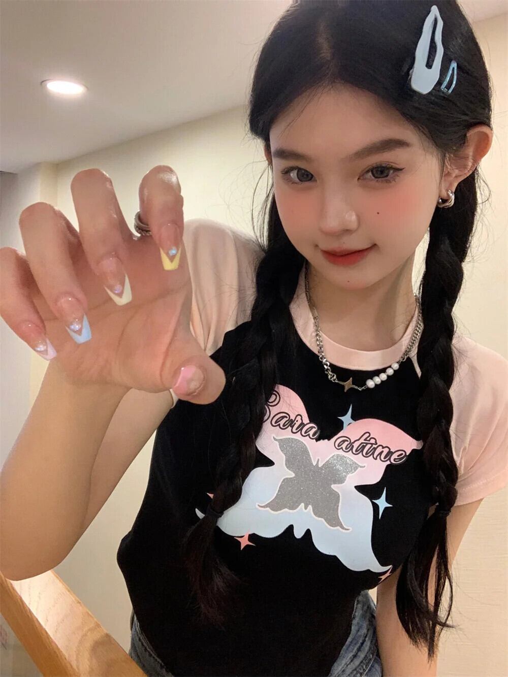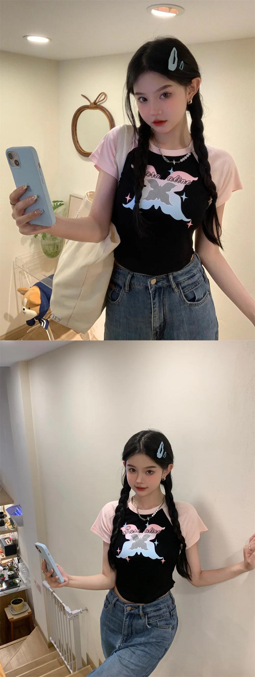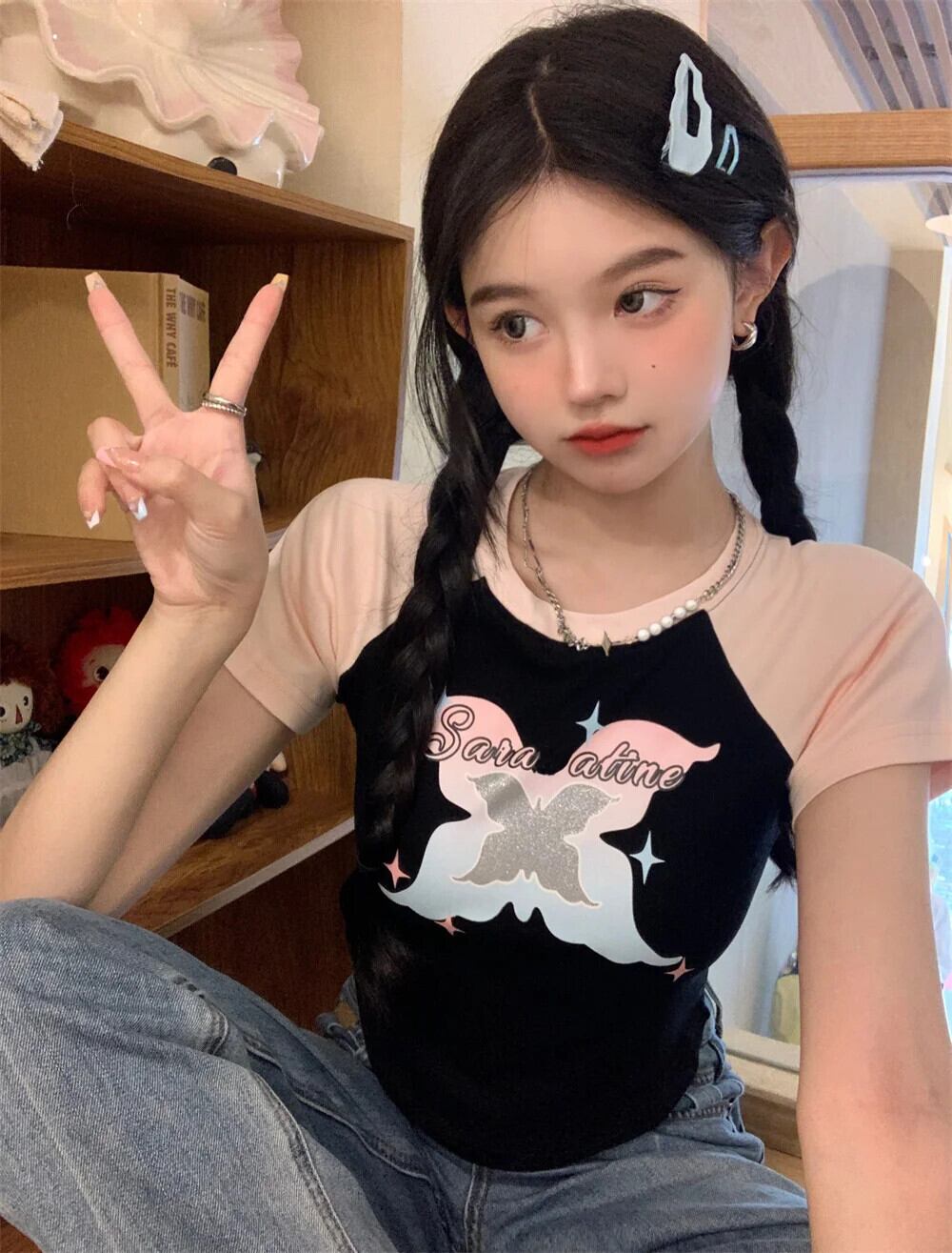 送料無料 Jielur 夏アメリカンコントラストカラーの女性の Tシャツスリム甘い Tシャツ女性白黒 O ネックトップ ホワイト ブラック 大人ガーリー スウィート キュート カジュアル サマー 夏物 Oネック AE12188787820032666393