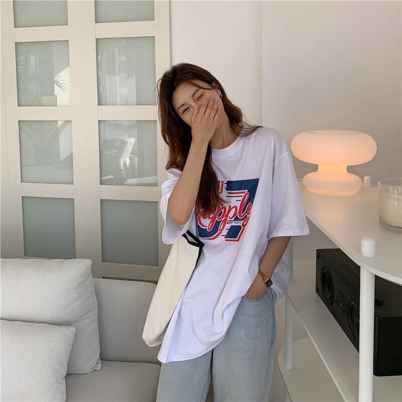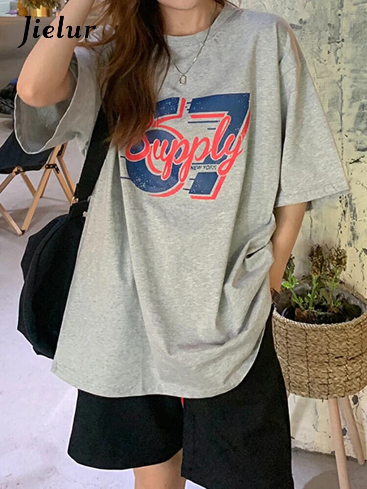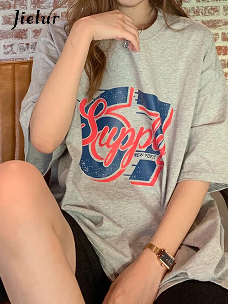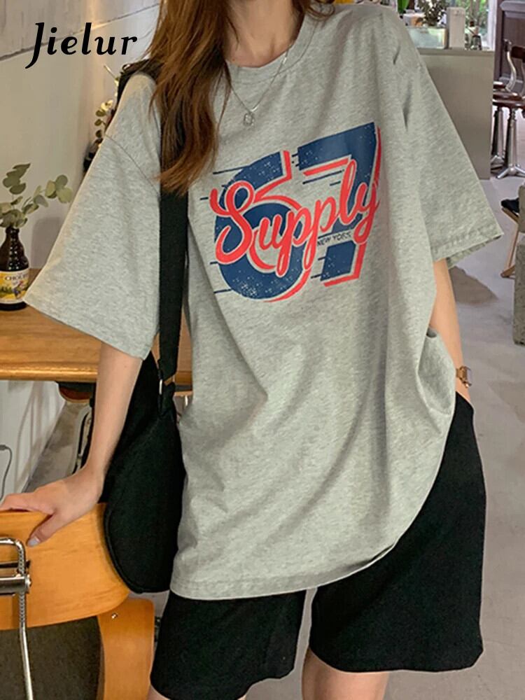 送料無料 Jielur 夏緩いレトロストリート女性の Tシャツシンプルなベーシックシックな Tシャツ女性白ライトグレートップ ホワイト サマー 夏物 AE12188787858478337093