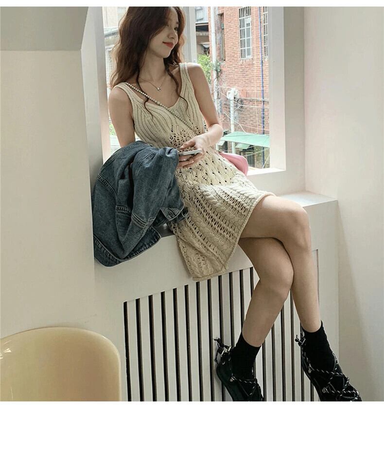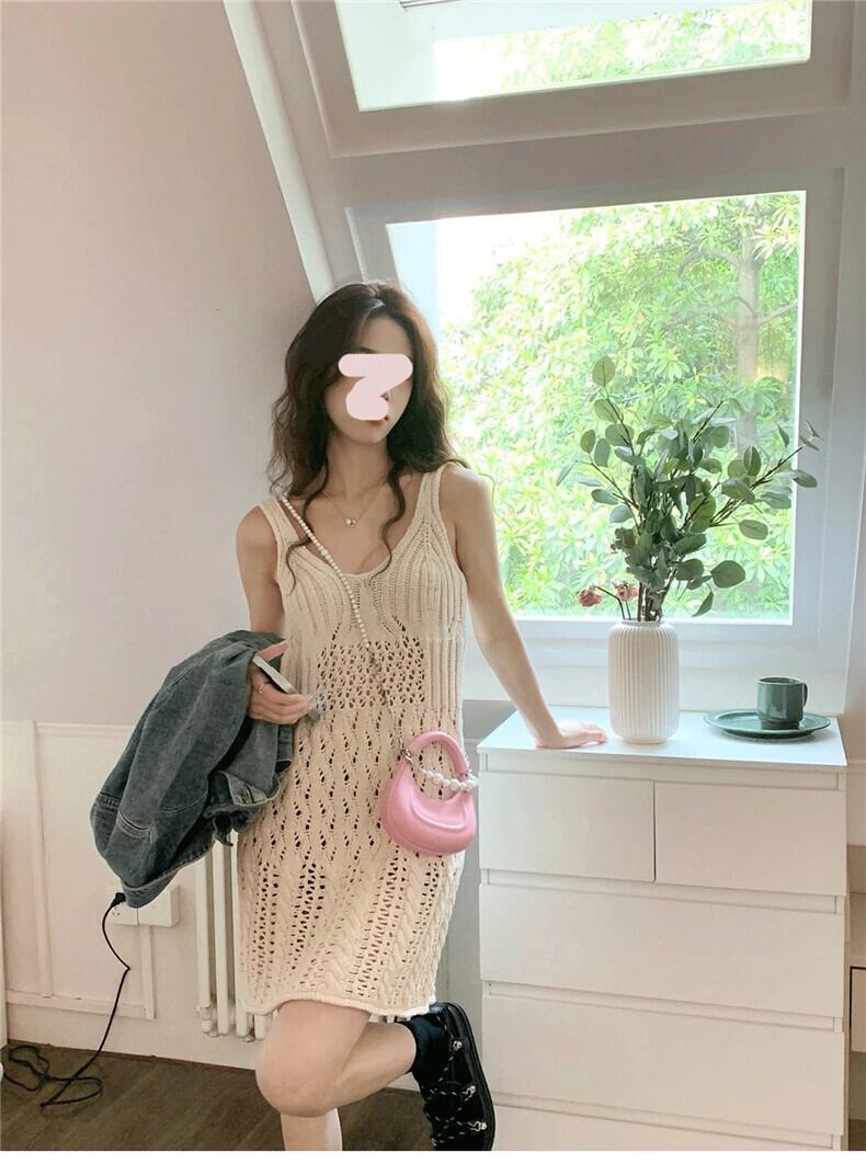 送料無料 Jielur 夏フレンチ中空アウト Y2K ドレス女性甘いストラップレスの女性のドレスルーズノースリーブドレス 大人ガーリー スウィート キュート カジュアル サマー 夏物 AE12188787838728464639