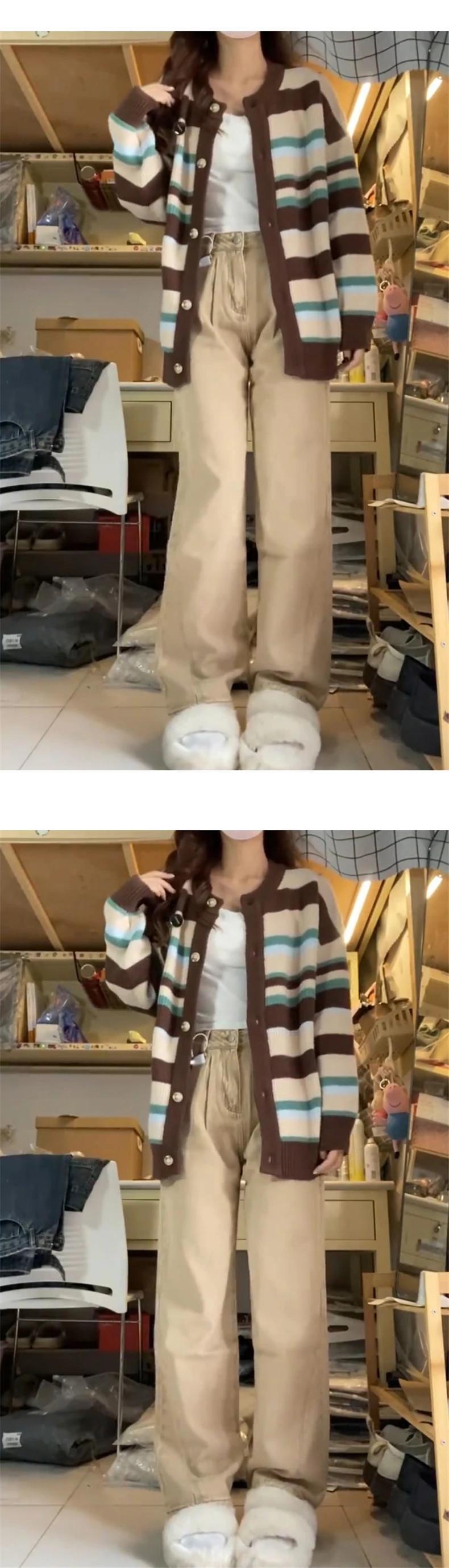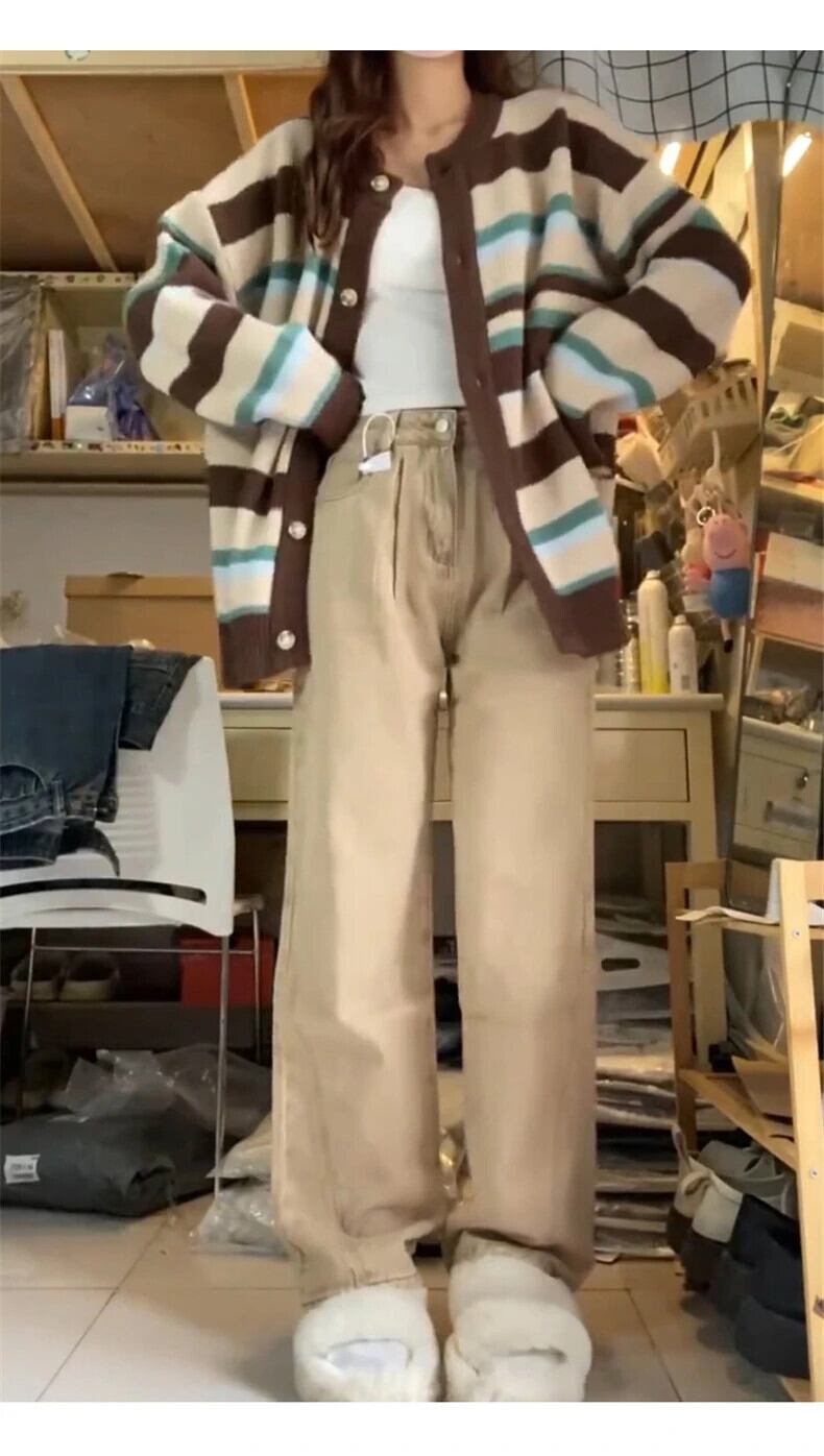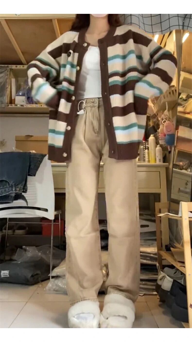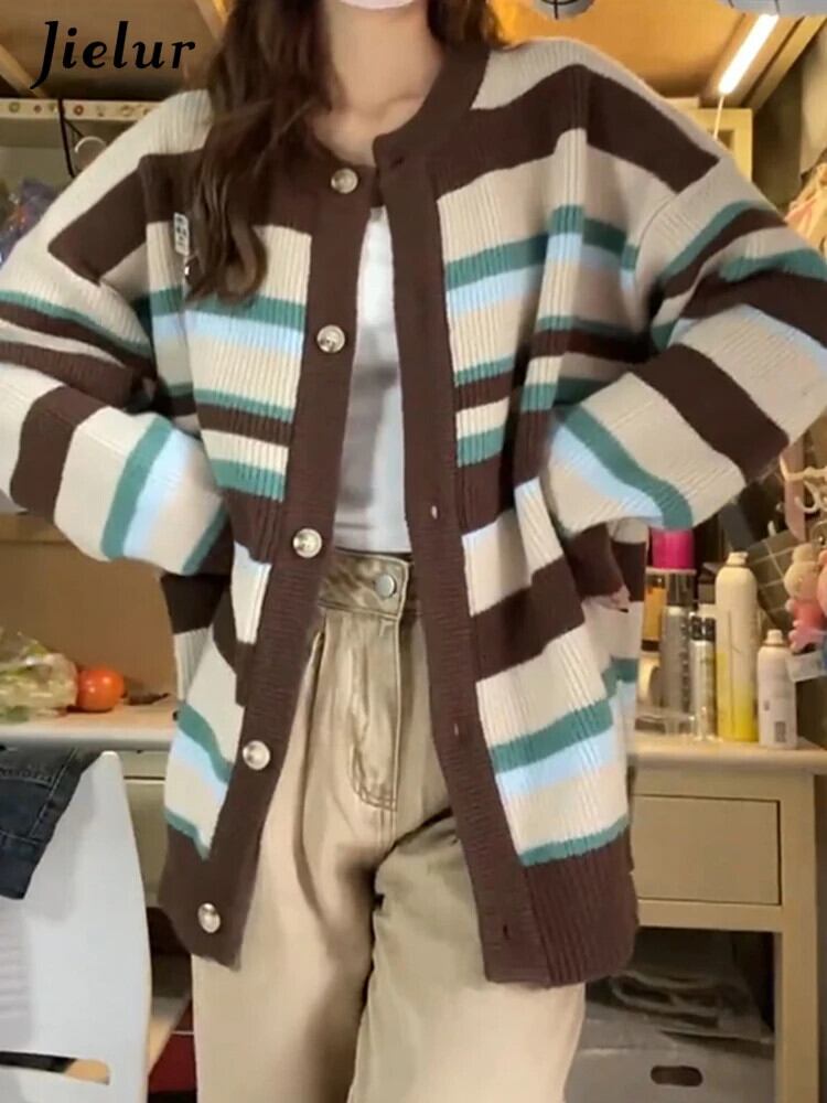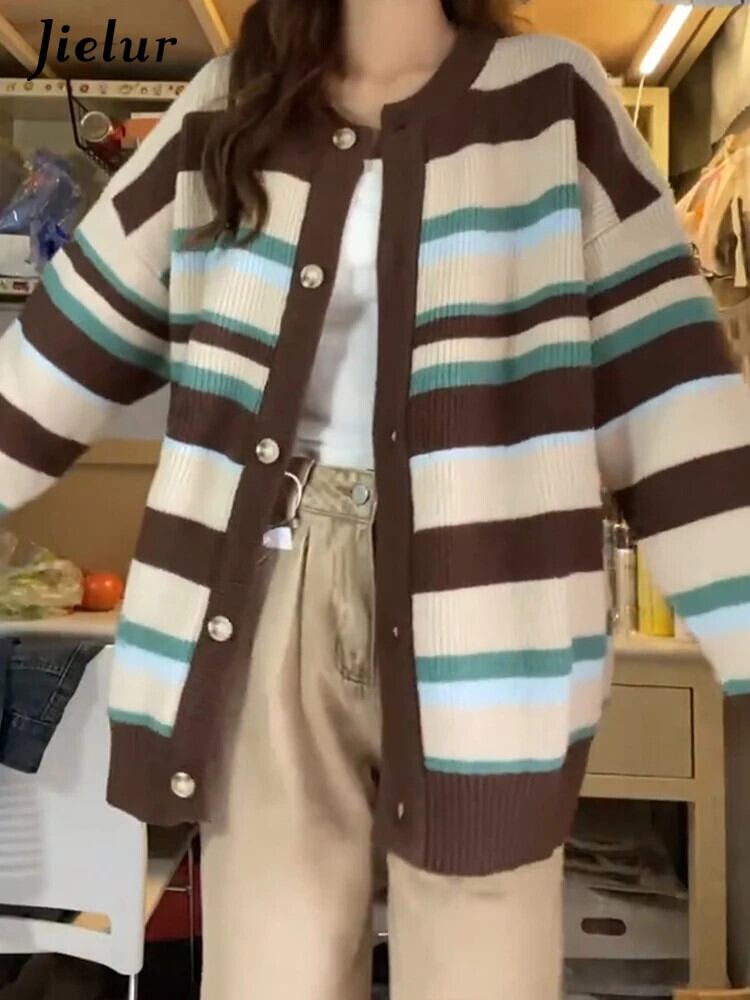 送料無料 Jielur ヴィンテージストライプコントラストカラールーズシンプルな女性カーディガン秋シックなボタンニットスリムカーディガン オータム 秋物 ビンテージ AE12188787856037910746