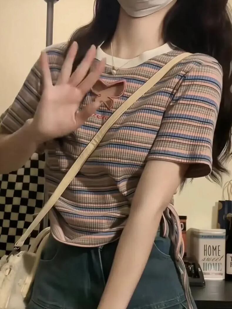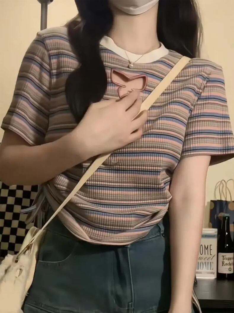 送料無料 Jielur 夏ヴィンテージスリム女性の Tシャツルーズストライプ Tシャツ女性のセクシーな Chicly ベーシックトップ サマー 夏物 ビンテージ AE12188787883867833534