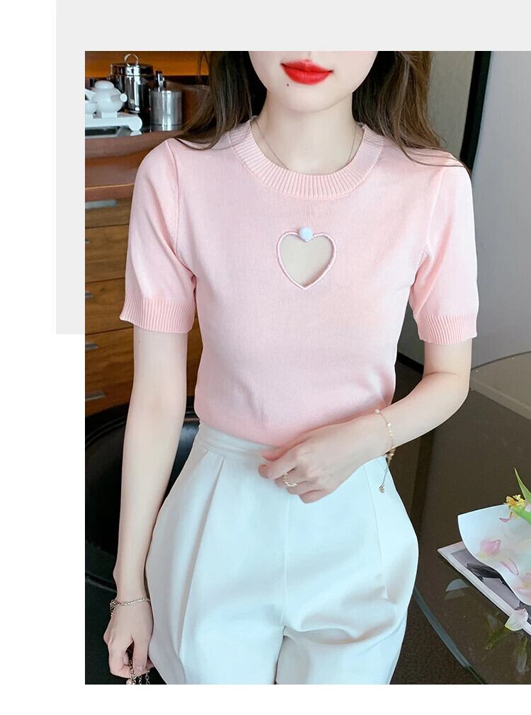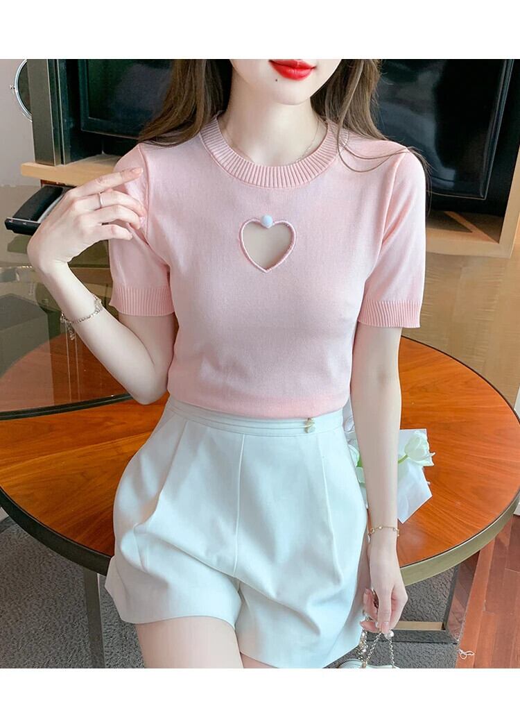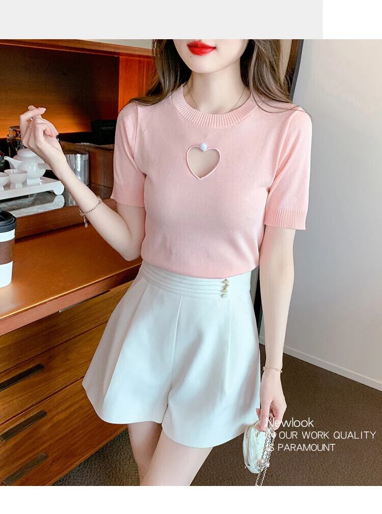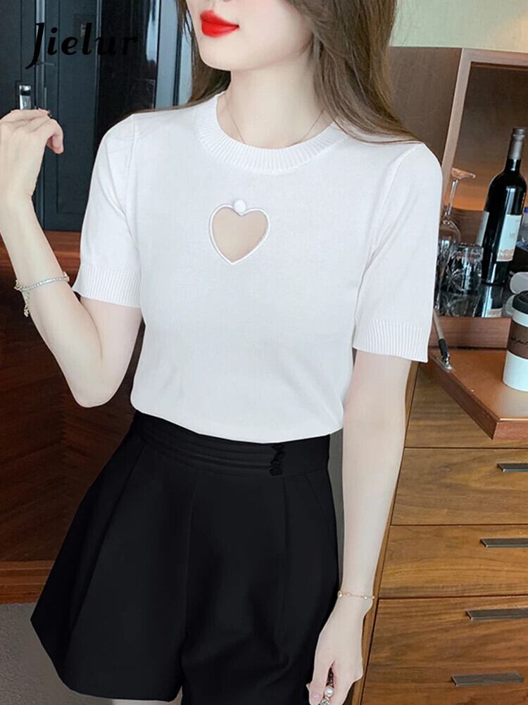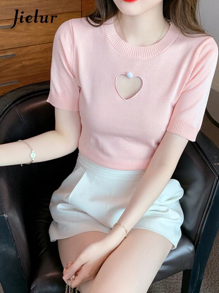 送料無料 Jielur 夏中空アウトニット女性の Tシャツ甘い無地 Tシャツピンク白 O ネックトップ女性 ホワイト 大人ガーリー スウィート キュート カジュアル サマー 夏物 Oネック ソリッドカラー AE12188787816537385745