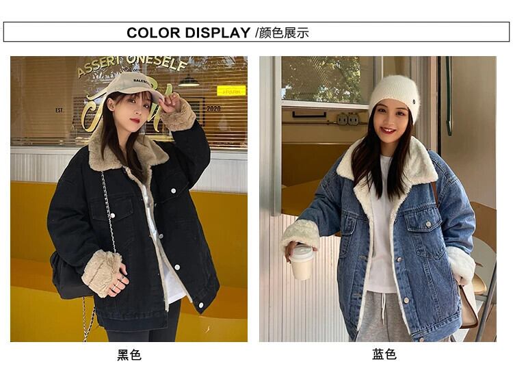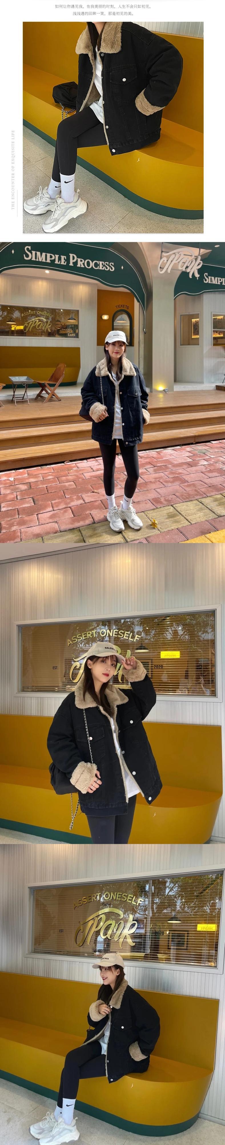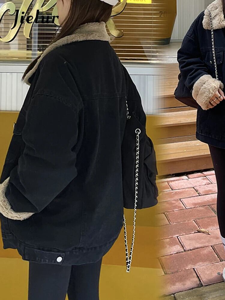 送料無料 Jielur 女性の冬のデニムジャケットターンダウン襟シングルブレストポケット厚く暖かいレトロなルーズコート ウィンター 冬物 AE12188787877414758856