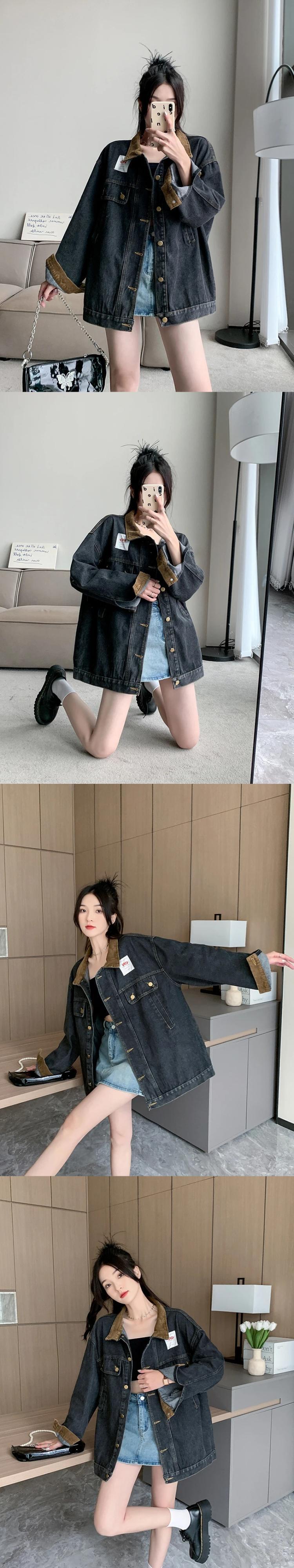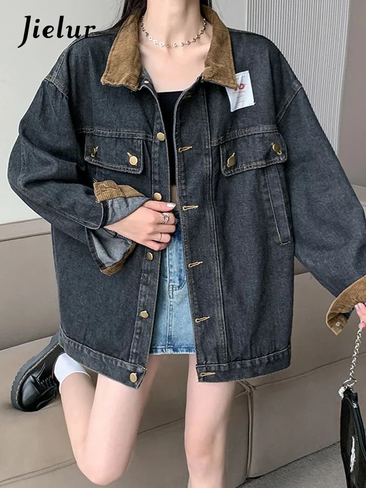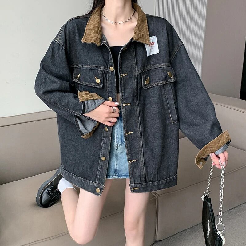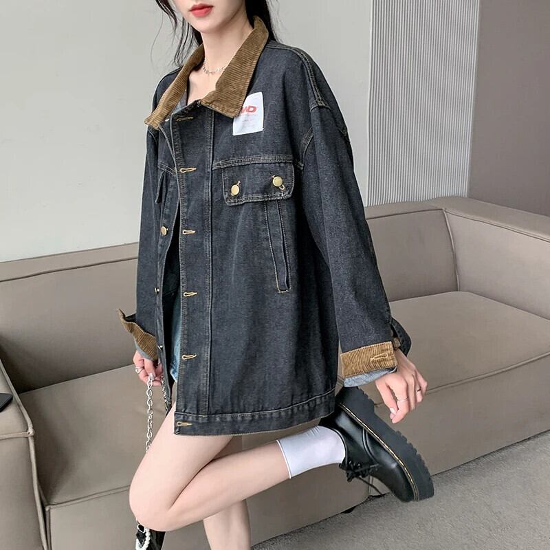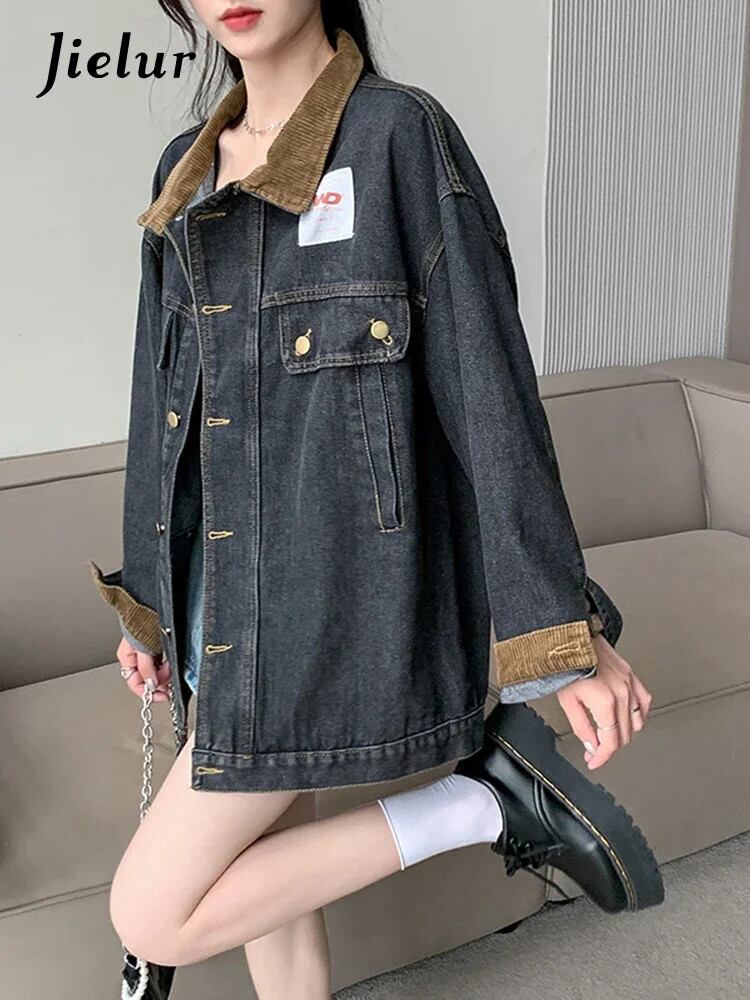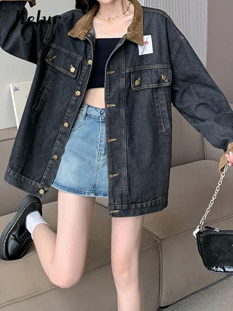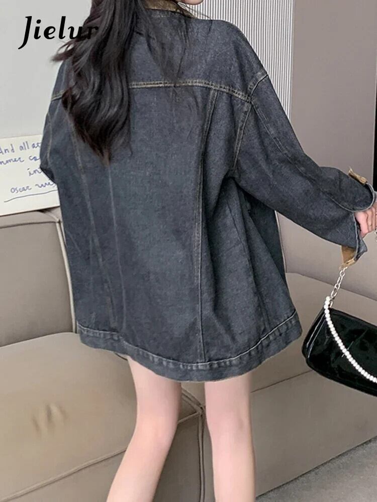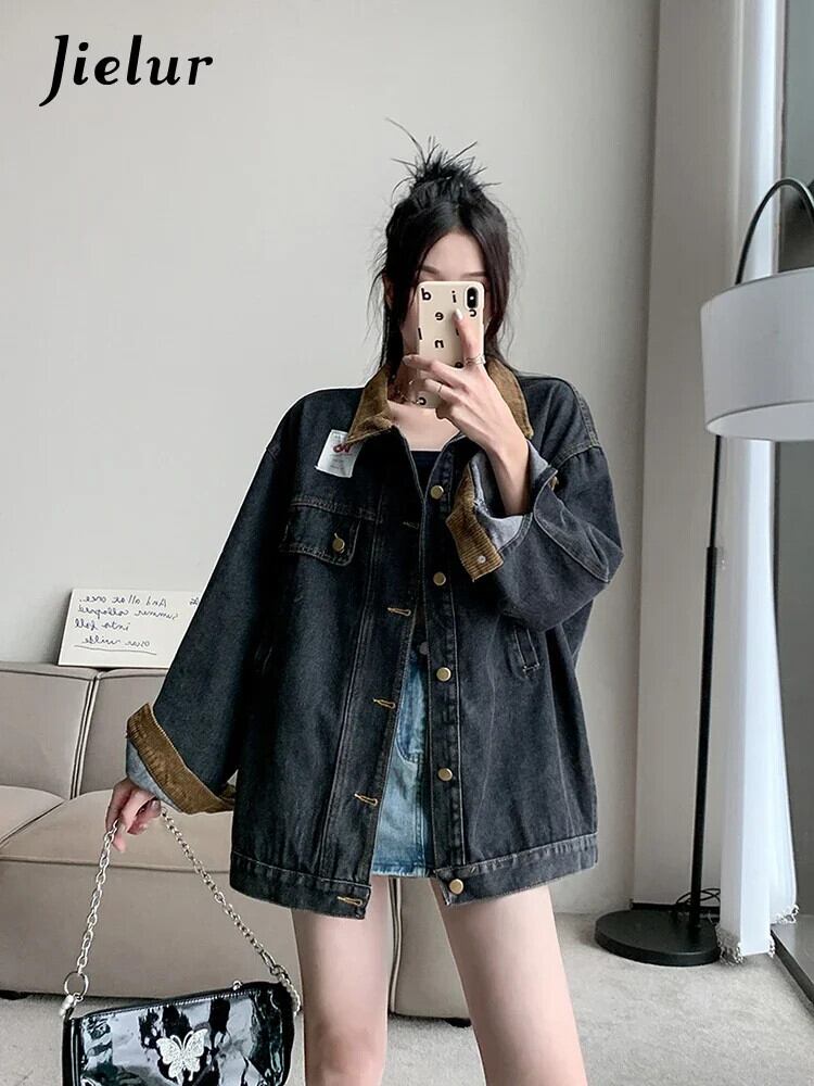送料無料 Jielur 夏ヴィンテージデニム女性シャツルーズスリムストリートシックな若いシャツ女性黒長袖トップ ロング ブラック サマー 夏物 ビンテージ AE1218878782464888964