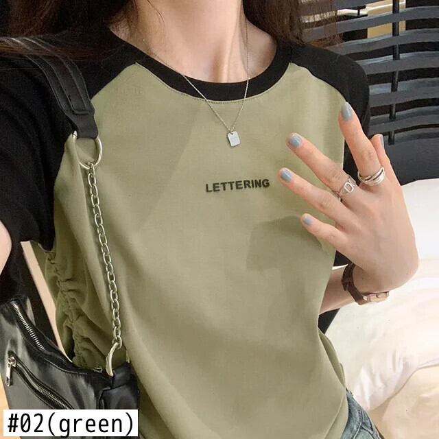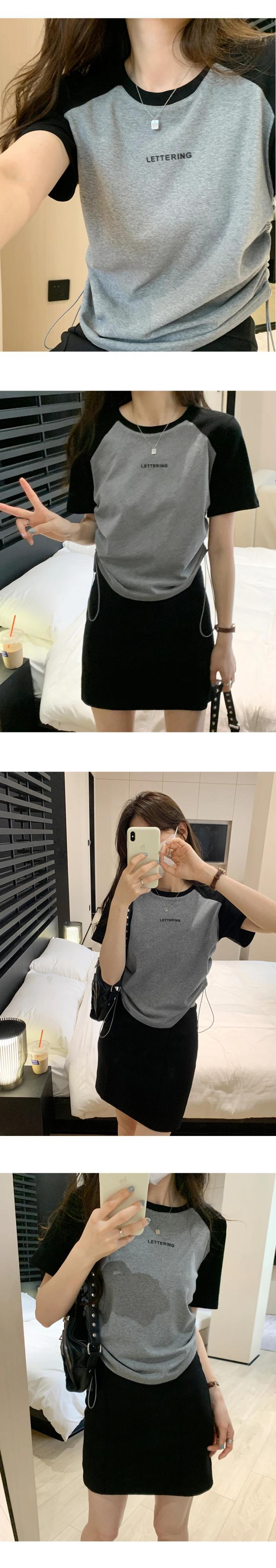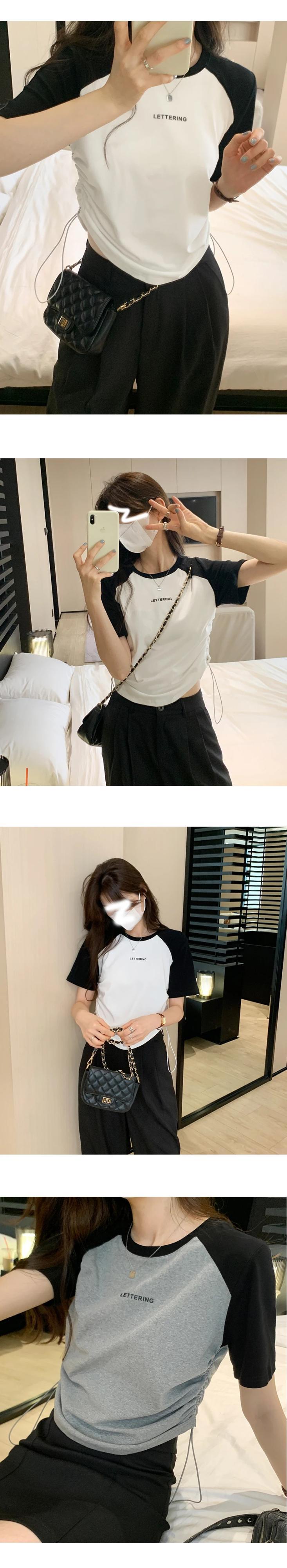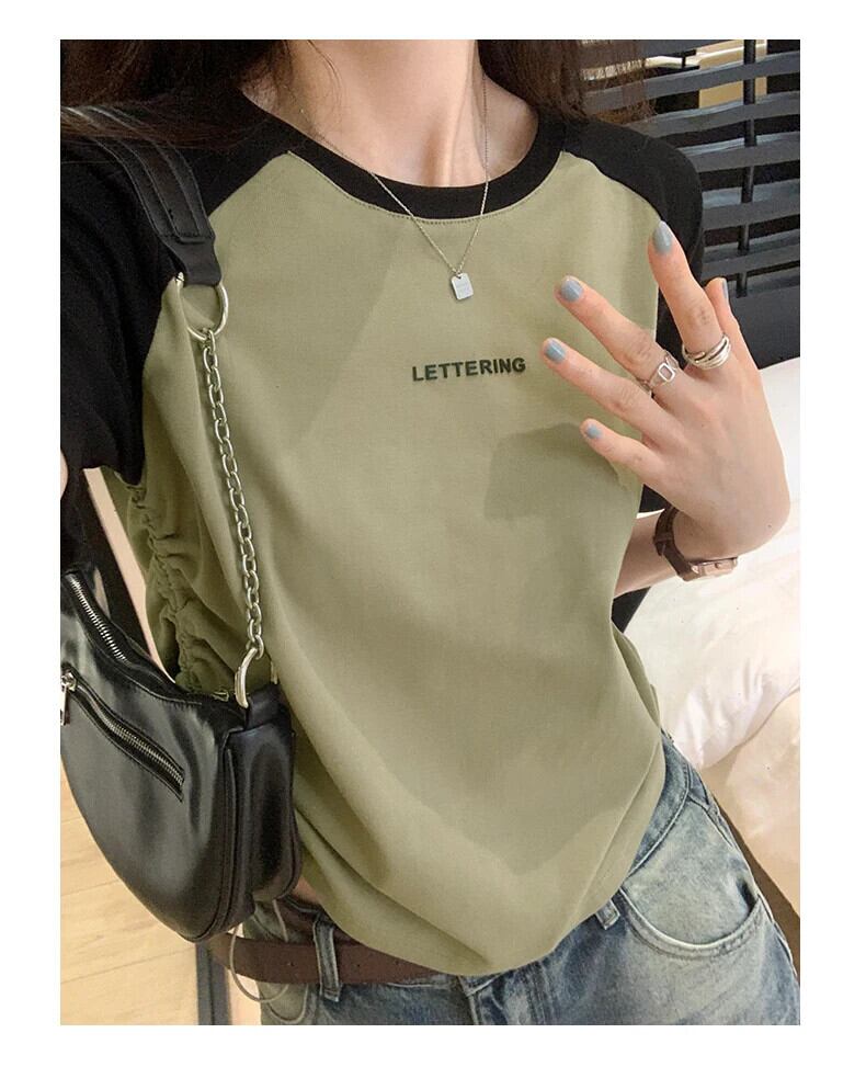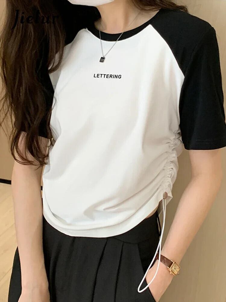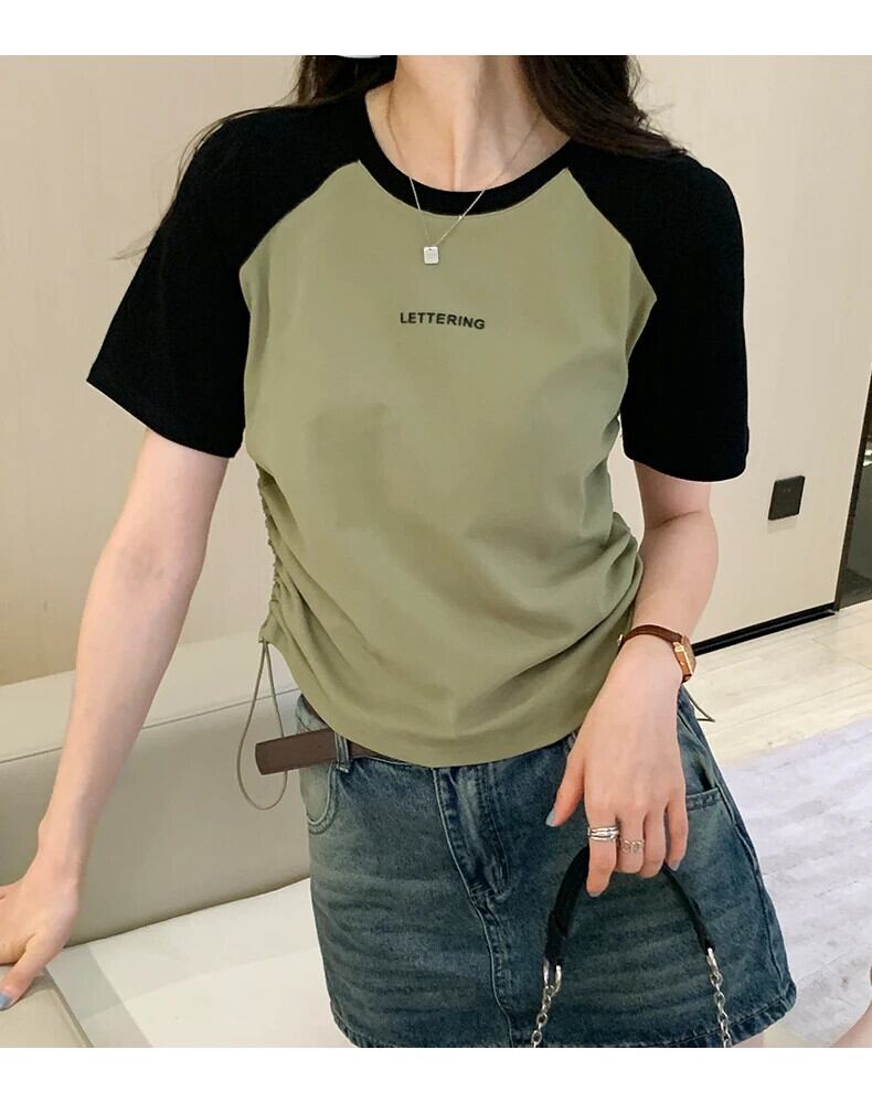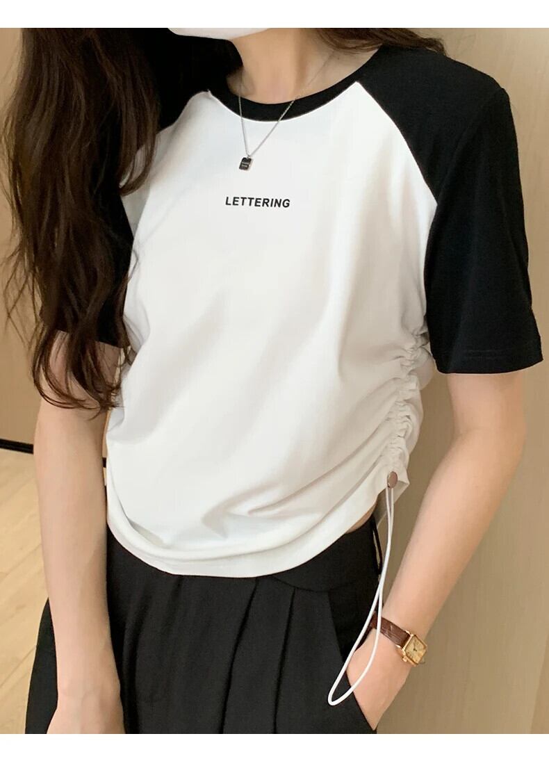 送料無料 Jielur 夏巾着女性の Tシャツコントラストカラールーズ Tシャツ女性白グレーグリーン O ネックトップ ホワイト サマー 夏物 Oネック AE12188787883057163415