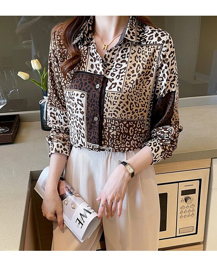 送料無料 ヒョウ Y2K スリム女性シャツストリートルーズ長袖シャツシンプルなレトロシフォンインシックな女性トップ ロング AE12188787845617062979