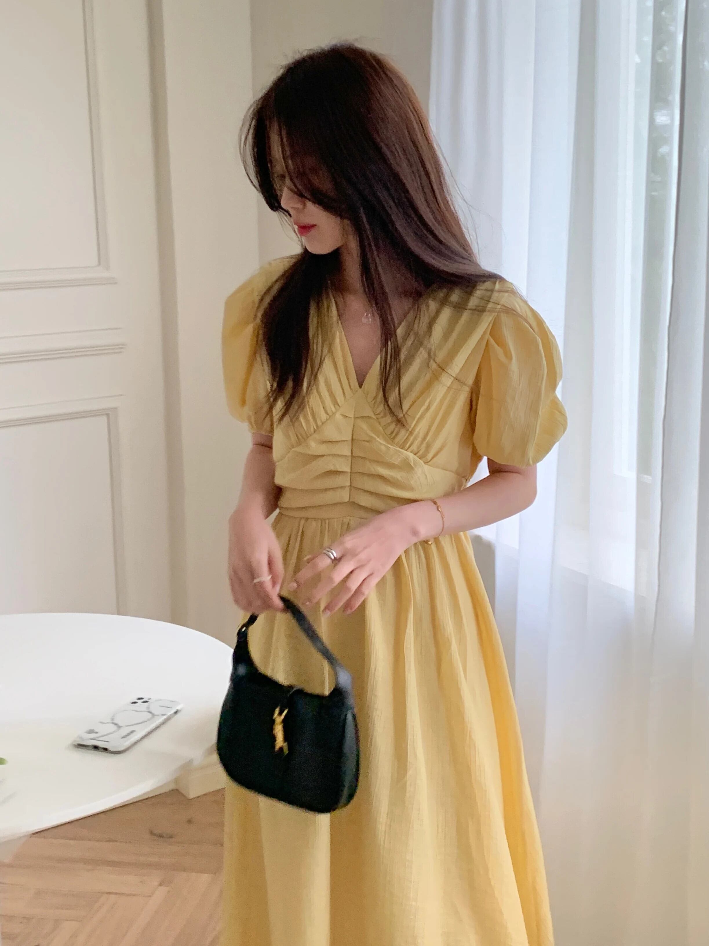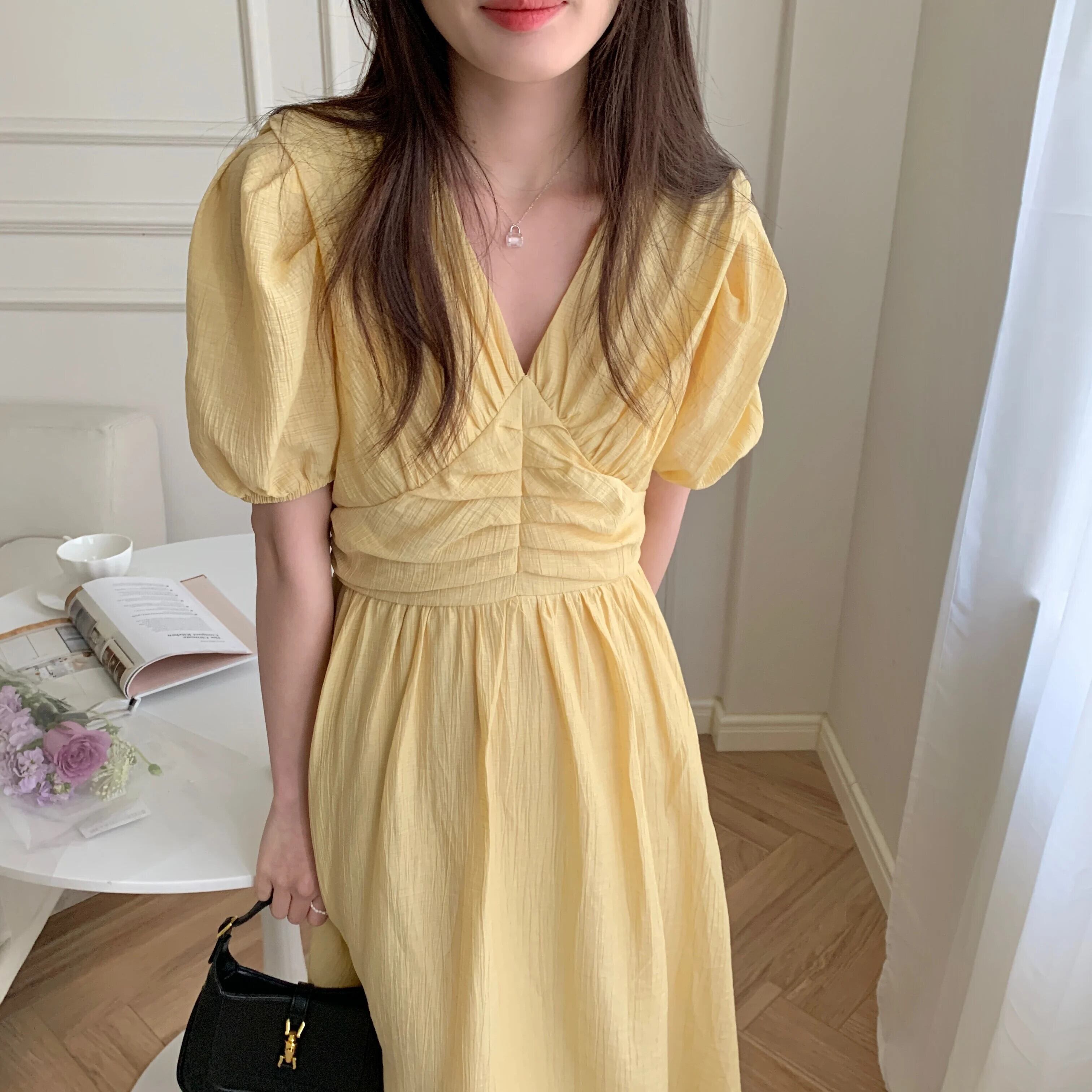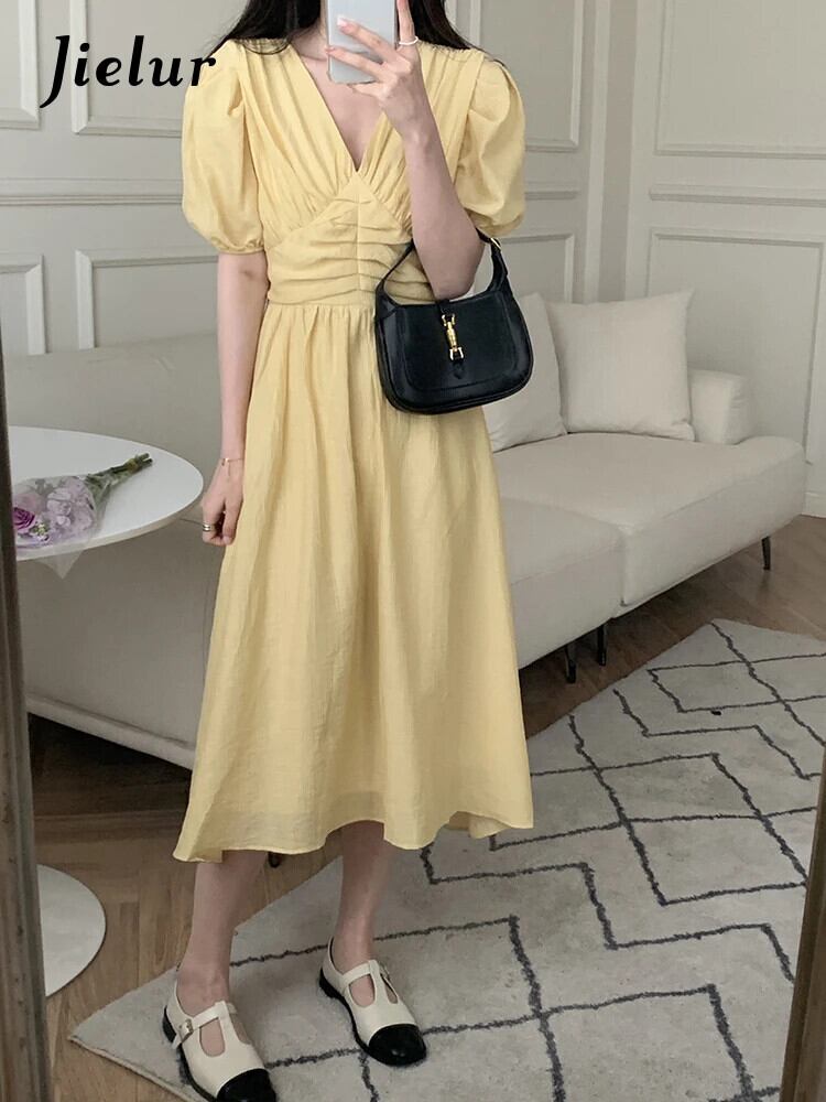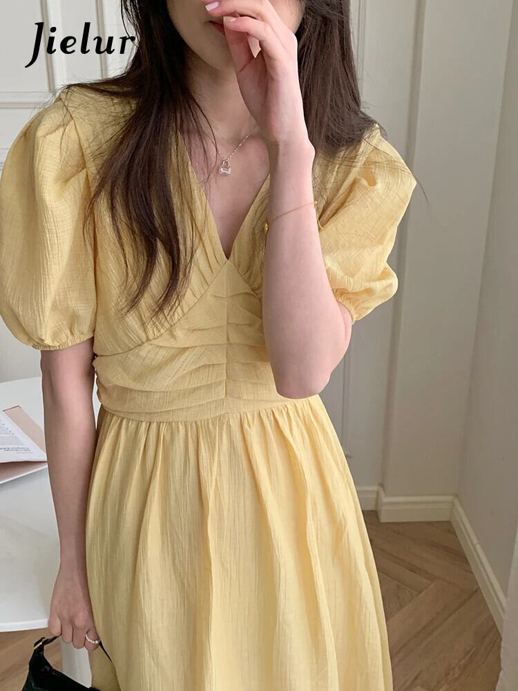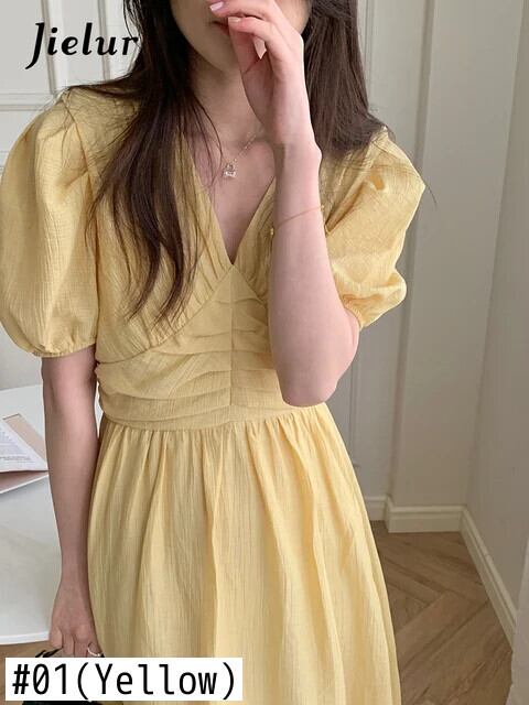 送料無料 Jielur 夏ルーズ V ネックスリムウエストパフスリーブレディースドレススリムレディドレス甘い無地ドレス 大人ガーリー スウィート キュート カジュアル サマー 夏物 Vネック ソリッドカラー AE12188787884768478154
