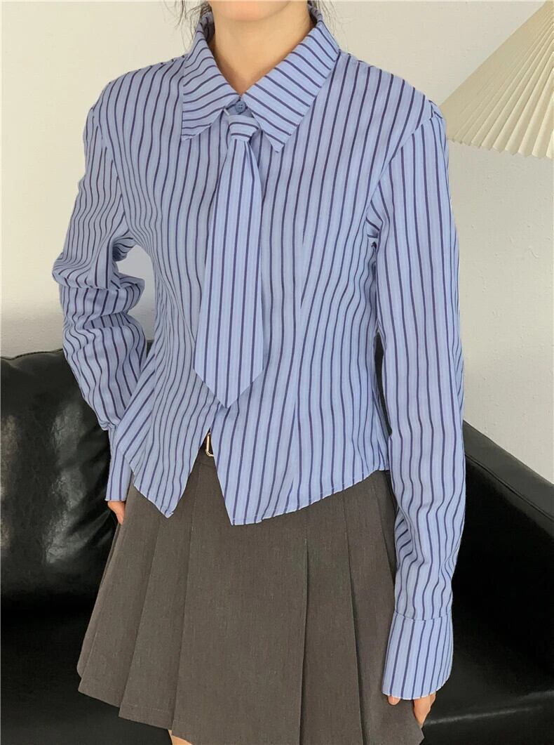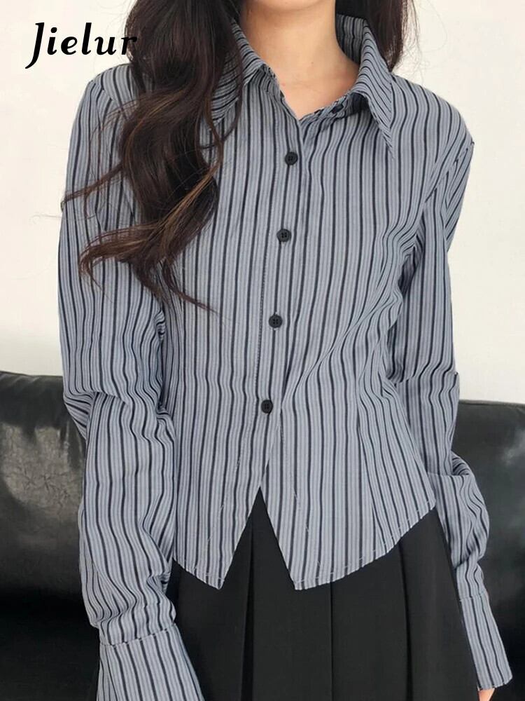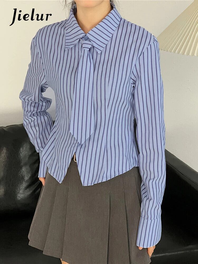 送料無料 Jielur 春ストライプスリム女性シャツストリートルーズシックな女性シャツブルーブラックシンプルなベーシック長袖トップ ロング スプリング 春物 AE12188787859874273679
