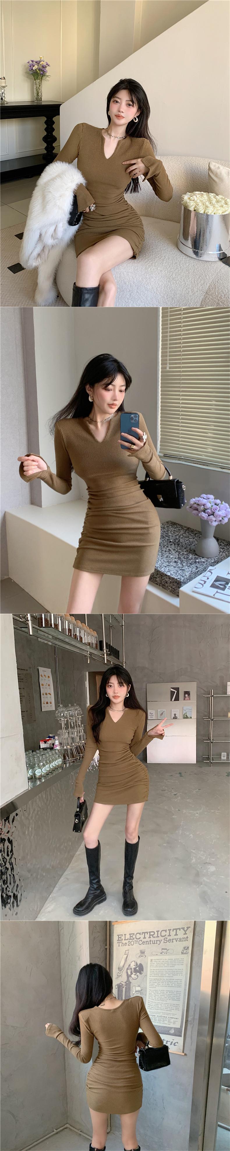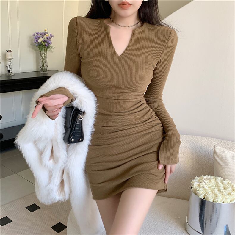 送料無料 Jielur 秋ソリッドカラー V ネックの女性のドレスセクシーなスリムウエストの女性のドレスブラックコーヒーシックなニットドレス オータム 秋物 Vネック AE12188787870985675500