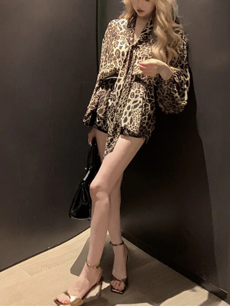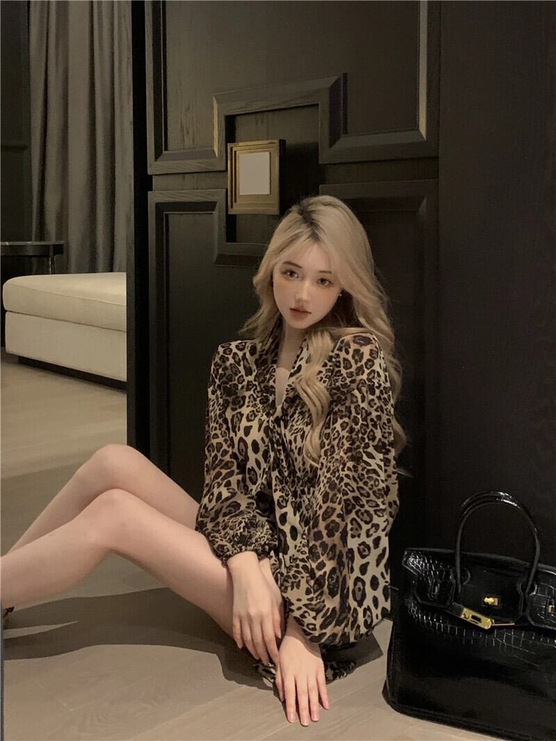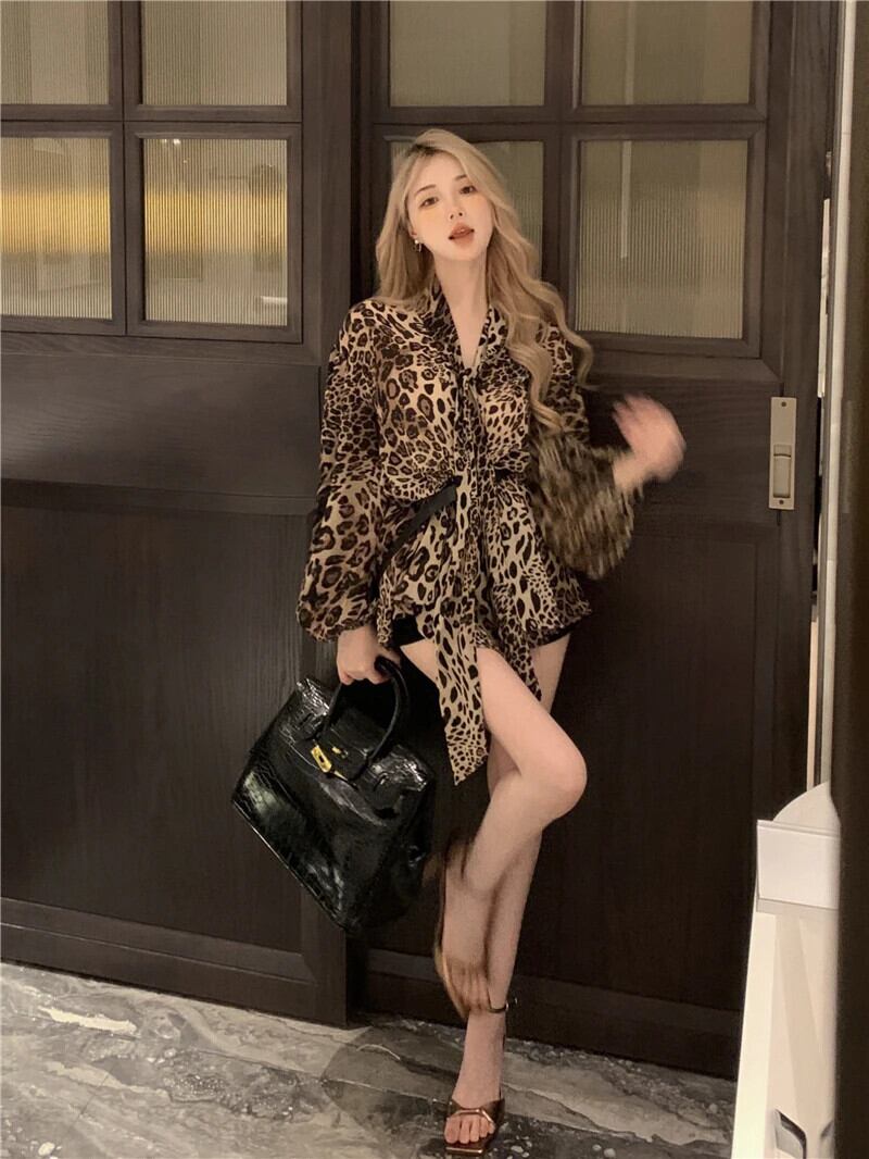 送料無料 レトロルーズ女性シャツスリムヒョウレースアップセクシーな女性シャツストリートシックな長袖トップ ロング AE12188787841366953741