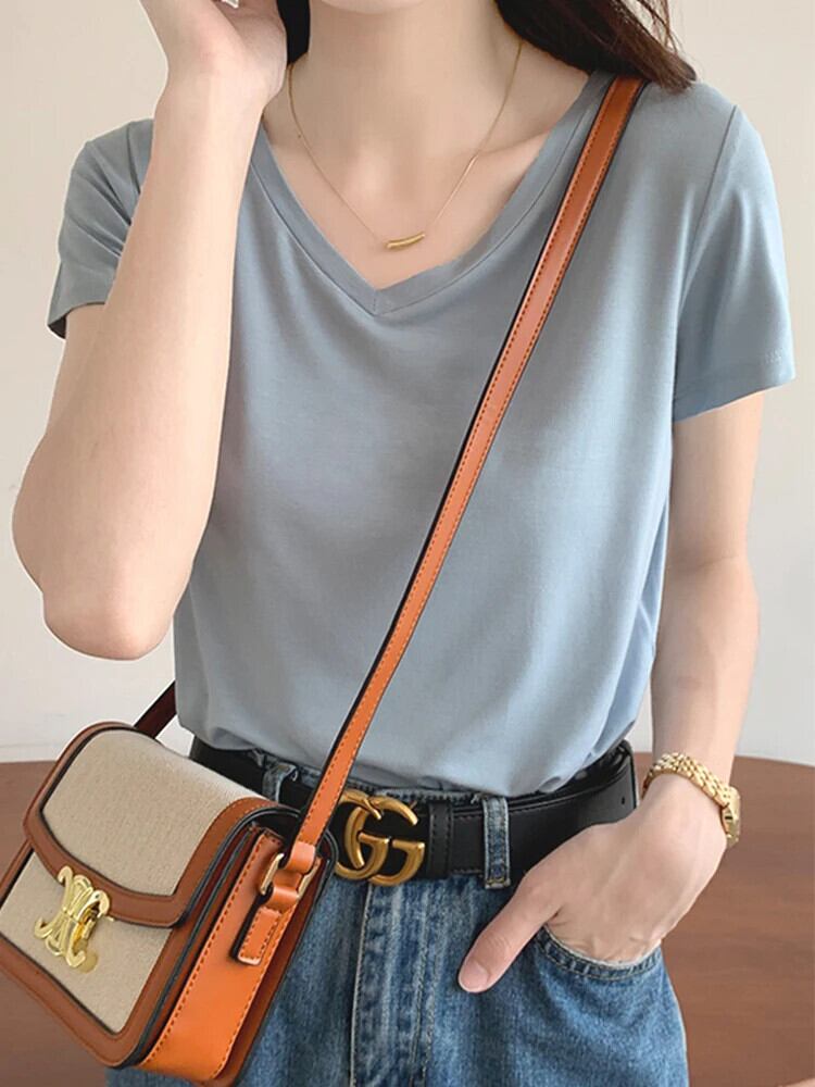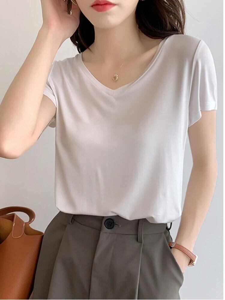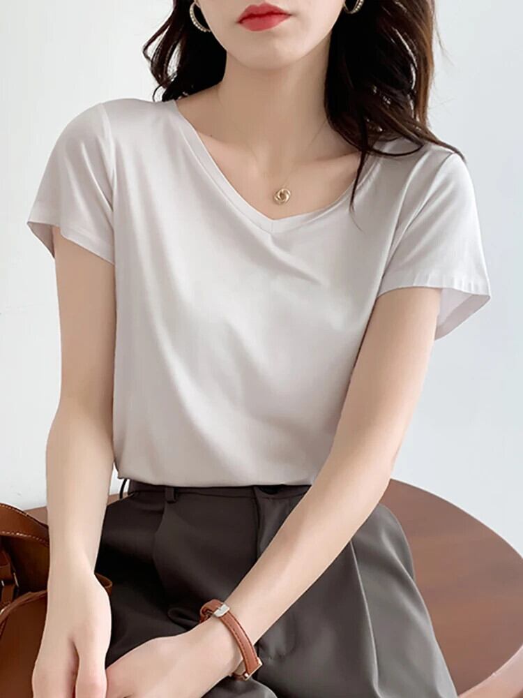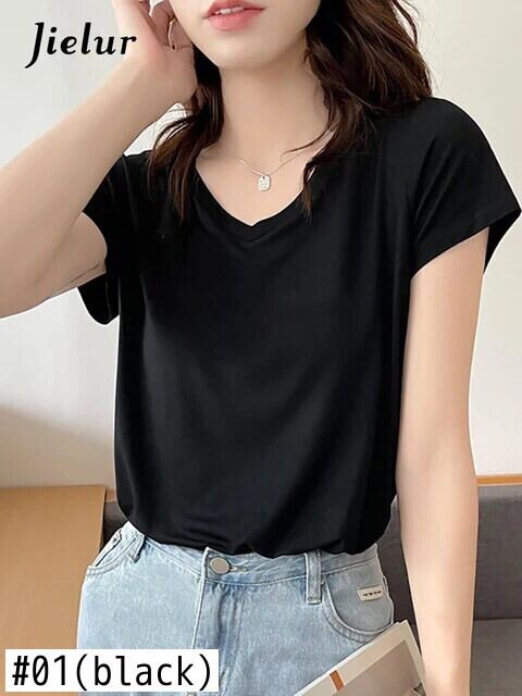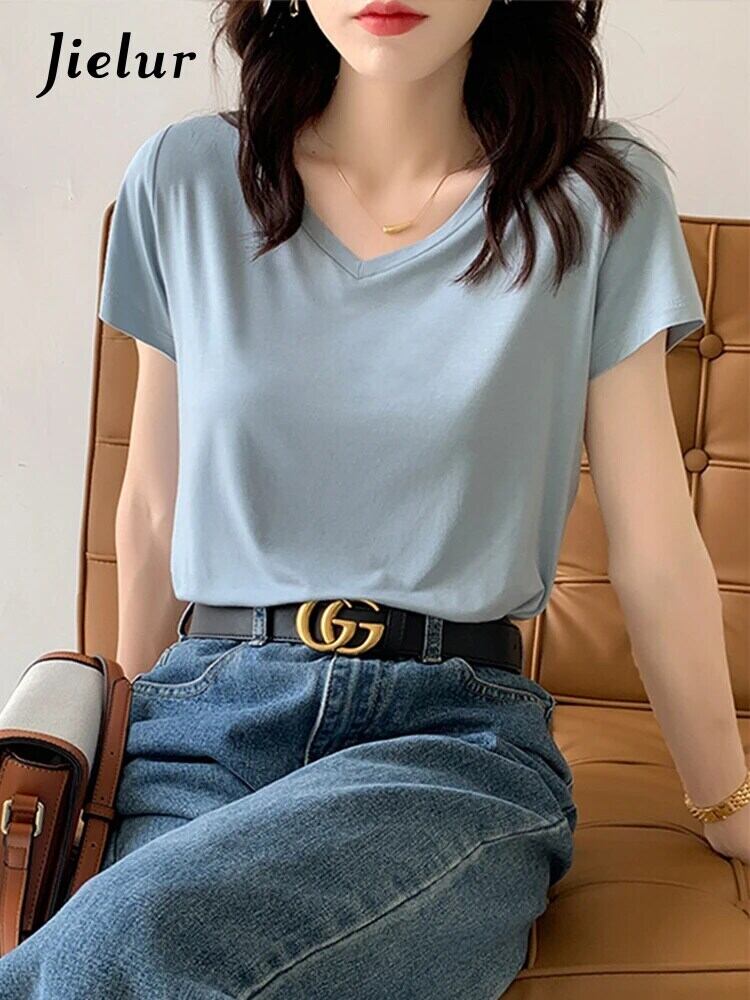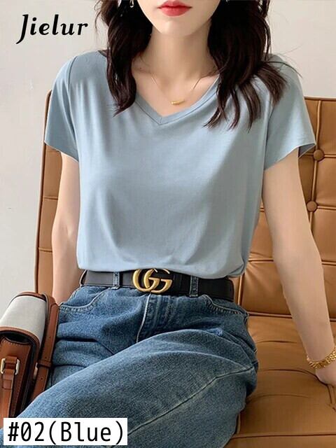 送料無料 Jielur 2022 夏薄い綿 Tシャツ女性ルーズ V ネックブルー Tシャツ居心地の良い Clic トップス コットン サマー 夏物 Vネック AE1218878781552505537
