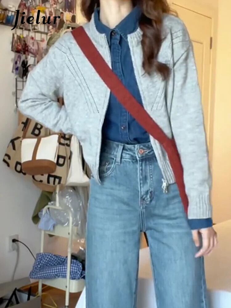 送料無料 Jielur グレー O ネックセーターニット女性カーディガン無地シックなジッパースリムベーシックシンプルなカーディガン Oネック ソリッドカラー AE12188787880786183190