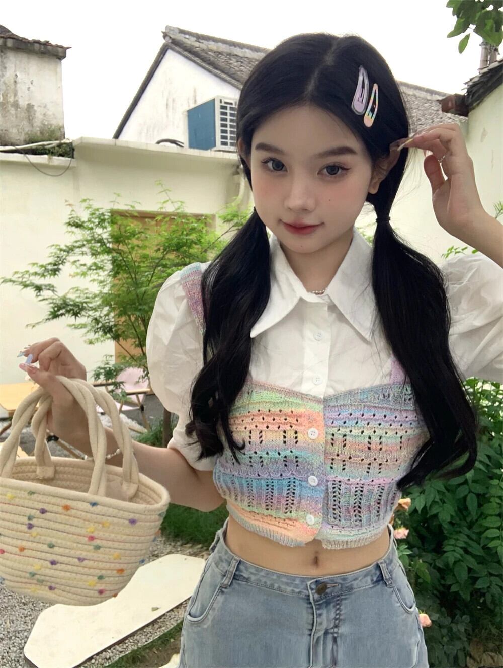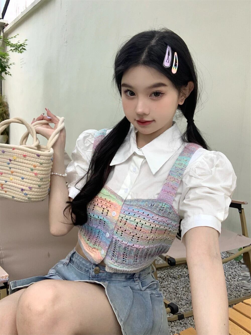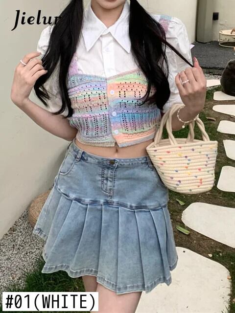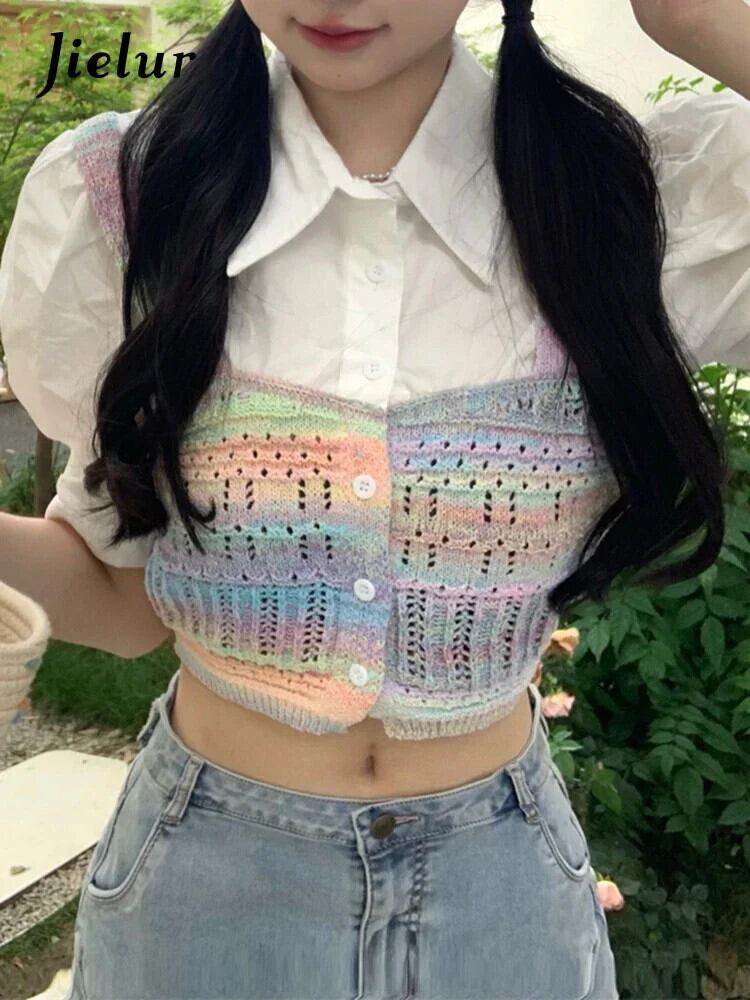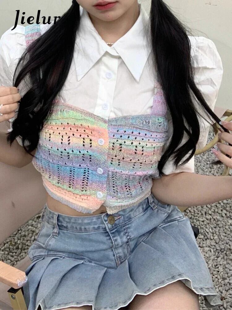 送料無料 Jielur 夏ストライプニット女性ブラウス偽ツーピーススリム甘いブラウス女性白ルーズシックなトップ ホワイト 大人ガーリー スウィート キュート カジュアル サマー 夏物 AE12188787821919315369