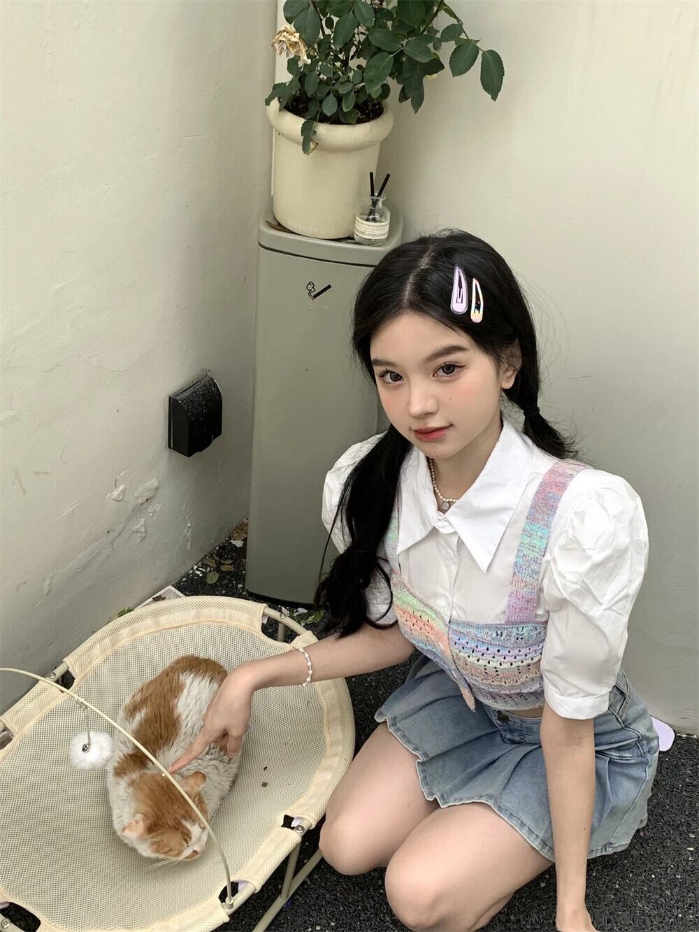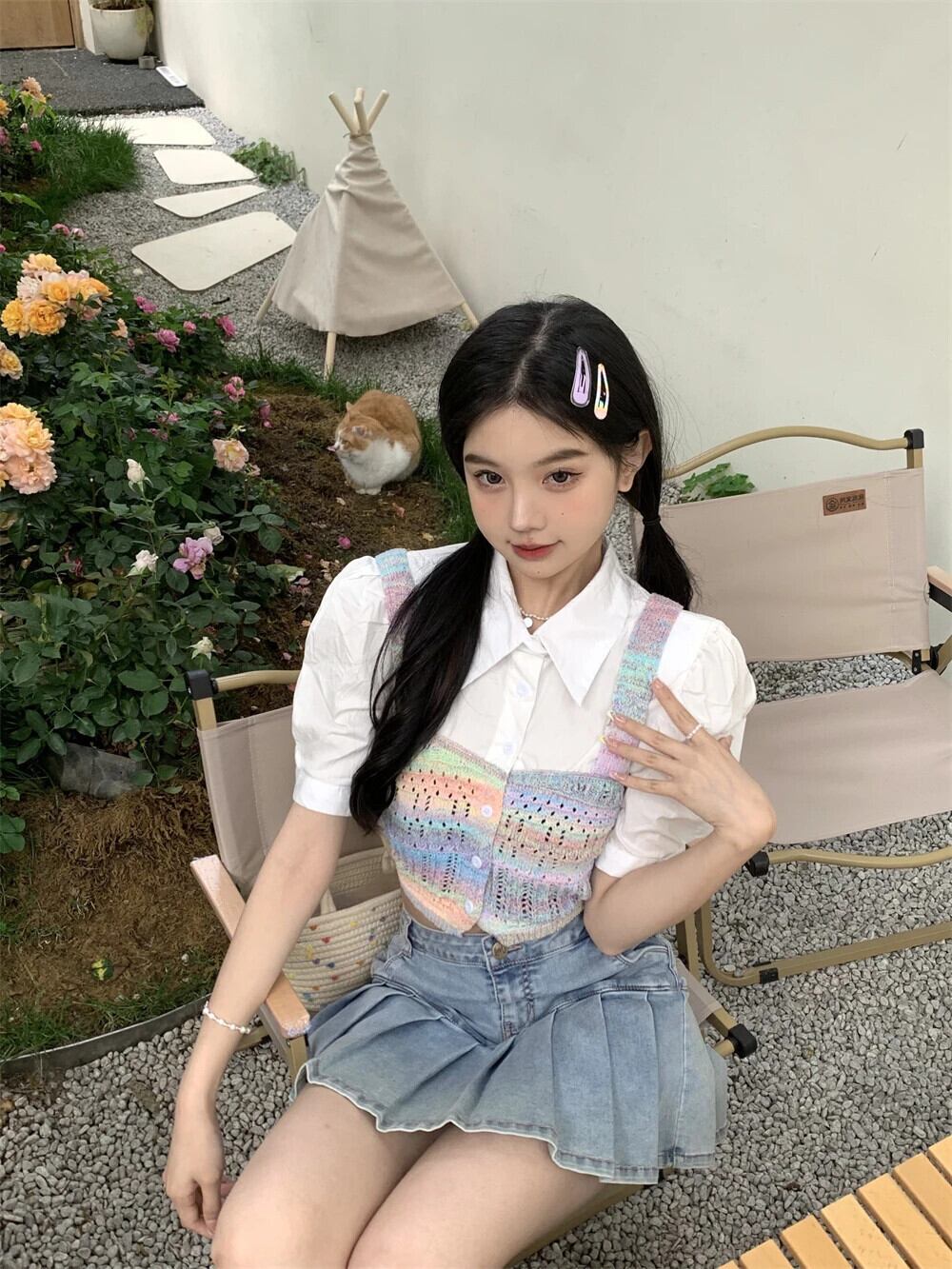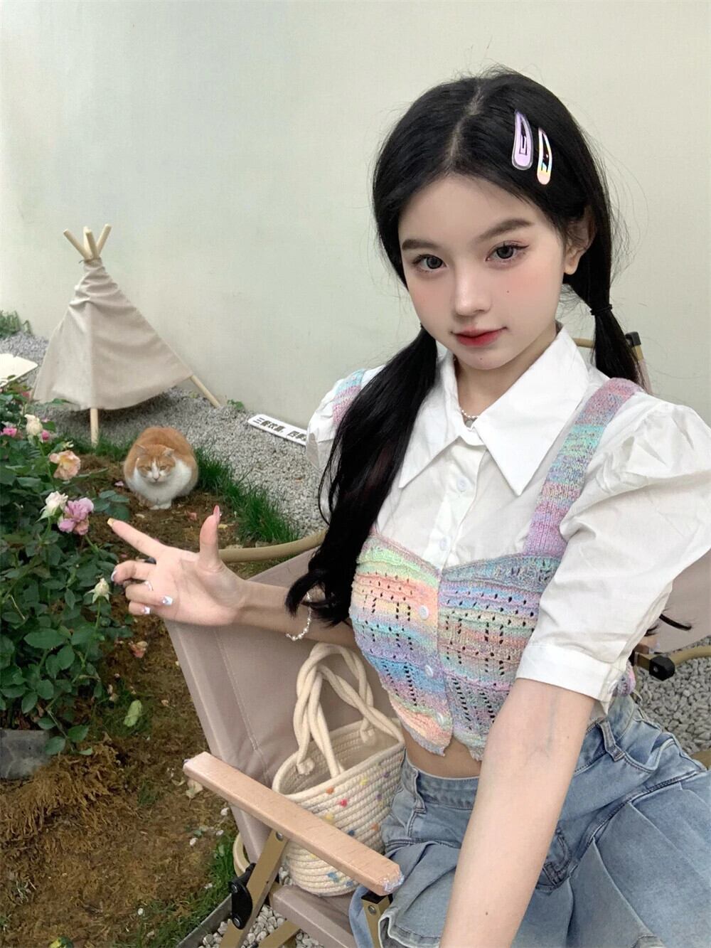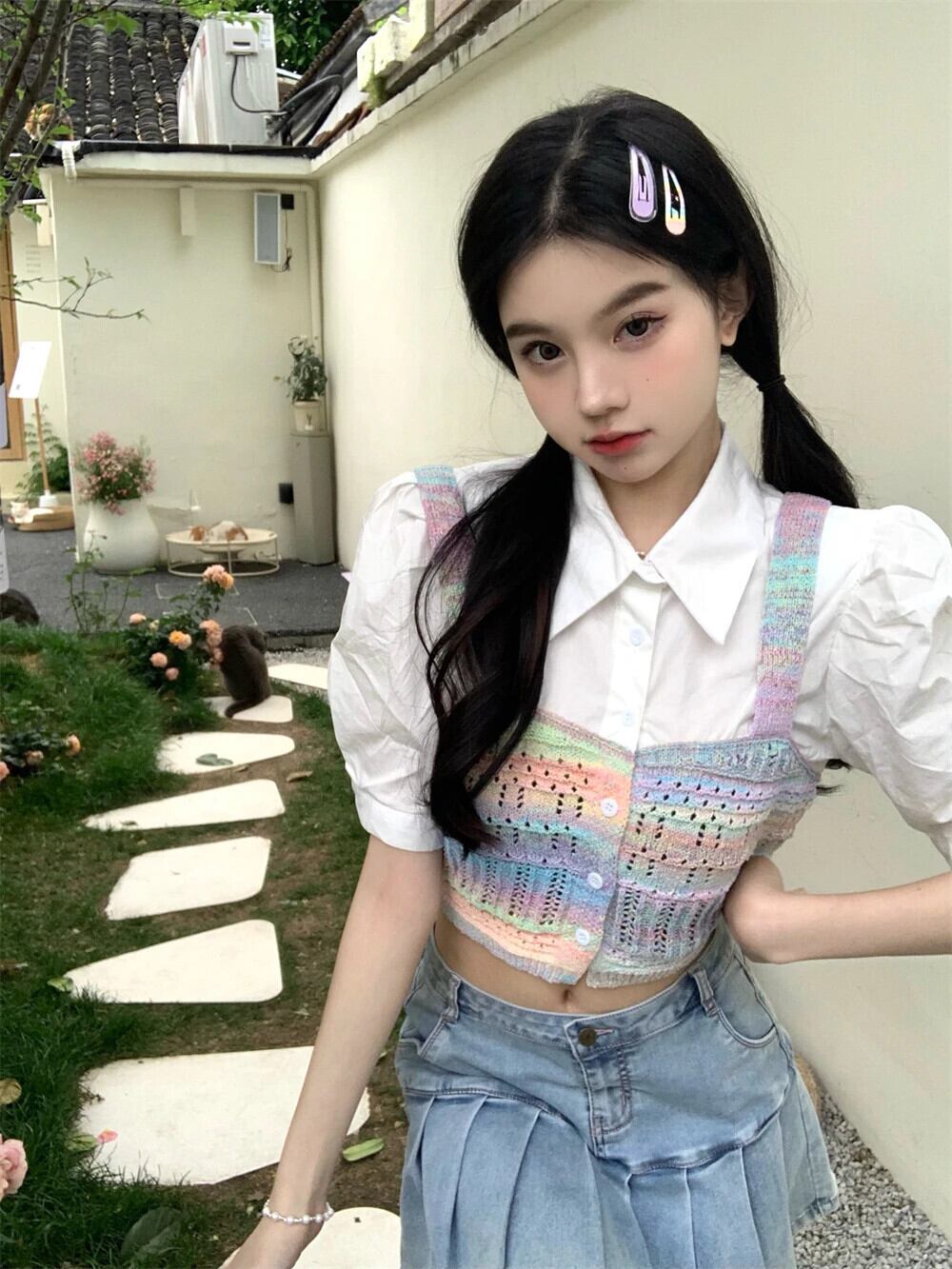 送料無料 Jielur 夏ストライプニット女性ブラウス偽ツーピーススリム甘いブラウス女性白ルーズシックなトップ ホワイト 大人ガーリー スウィート キュート カジュアル サマー 夏物 AE12188787821919315369