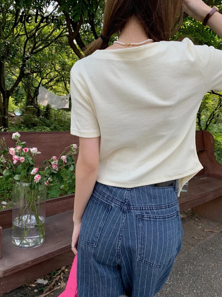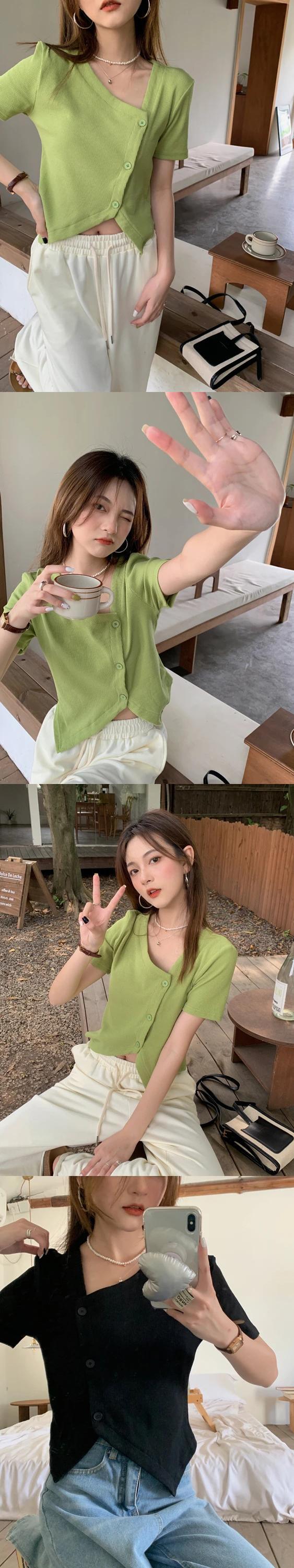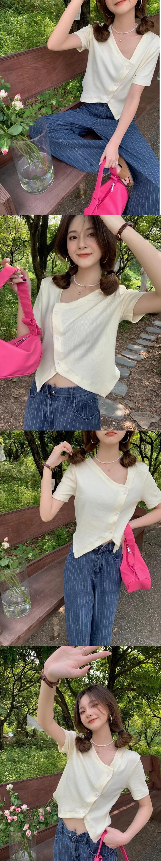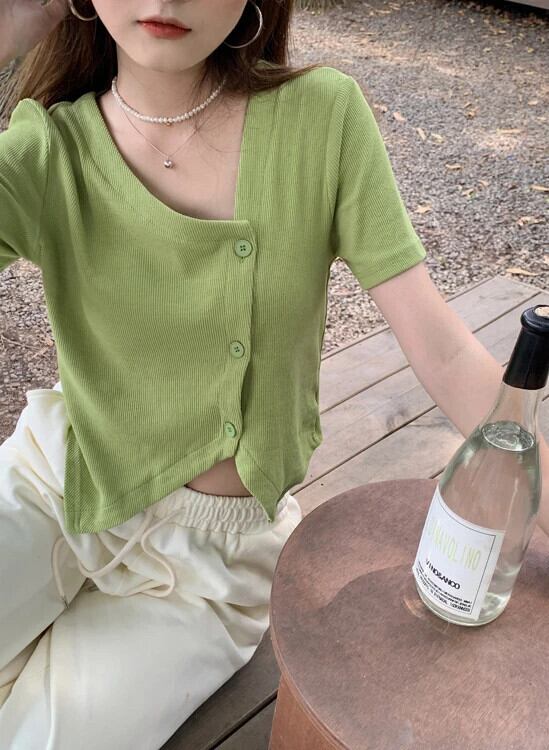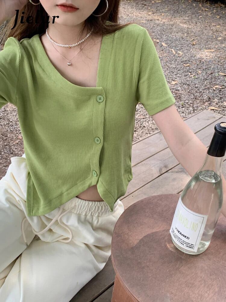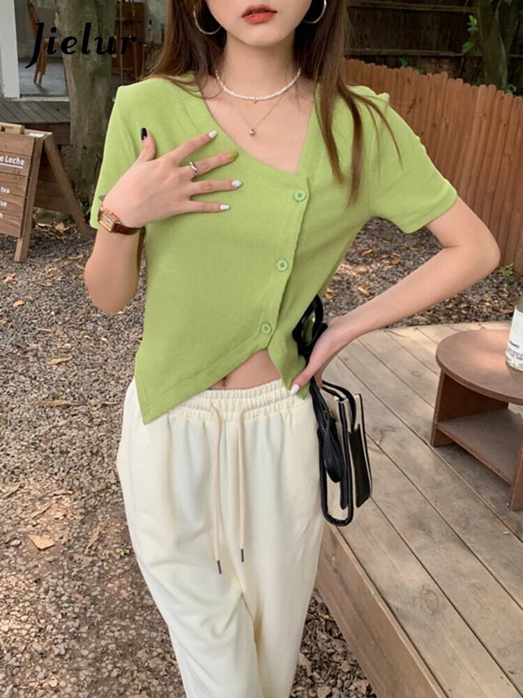 送料無料 Jielur 無地斜め襟ボタン半袖 Tシャツ女性の夏のクリエイティブスリムクロップトップ Tシャツグリーン ショート ハーフスリーブ サマー 夏物 ソリッドカラー AE12188787863944414695