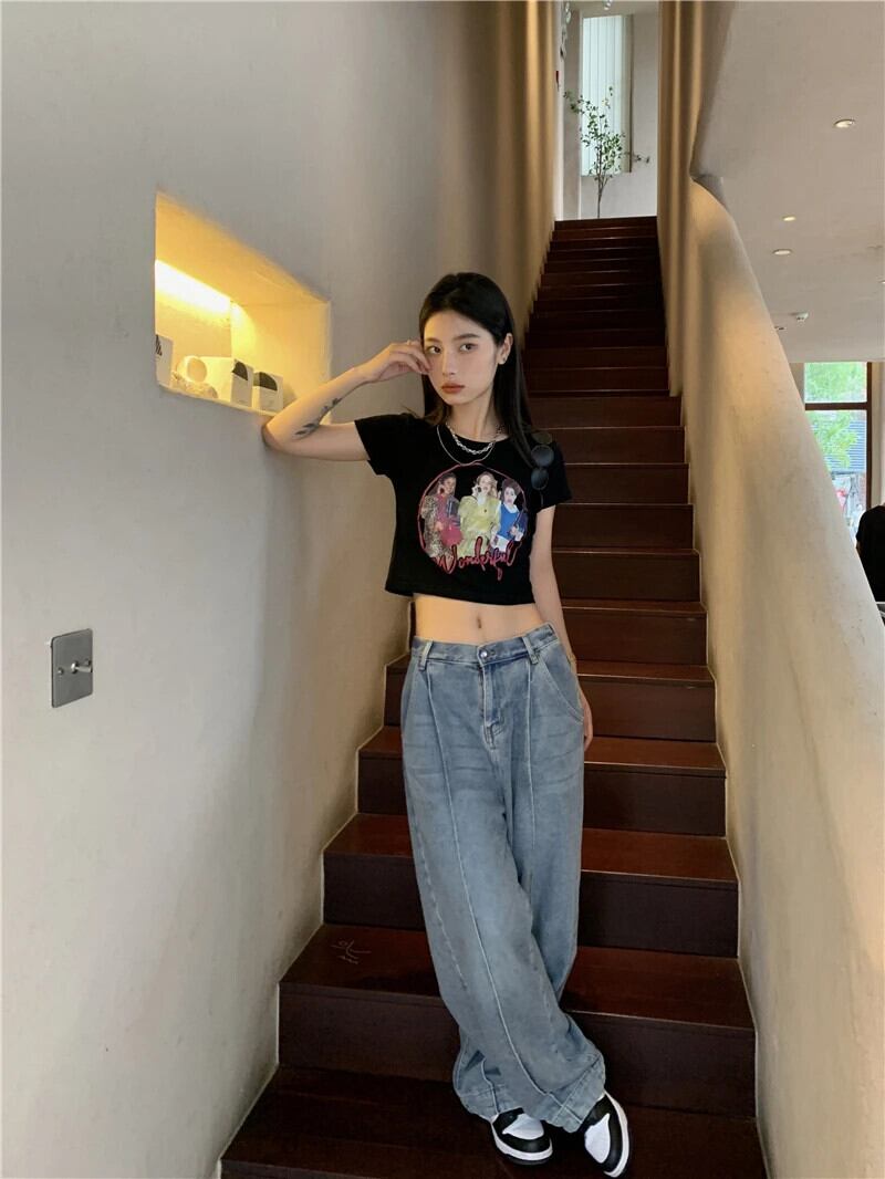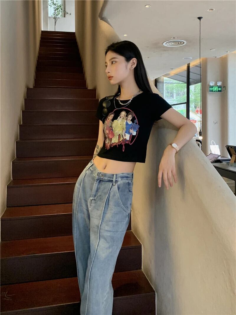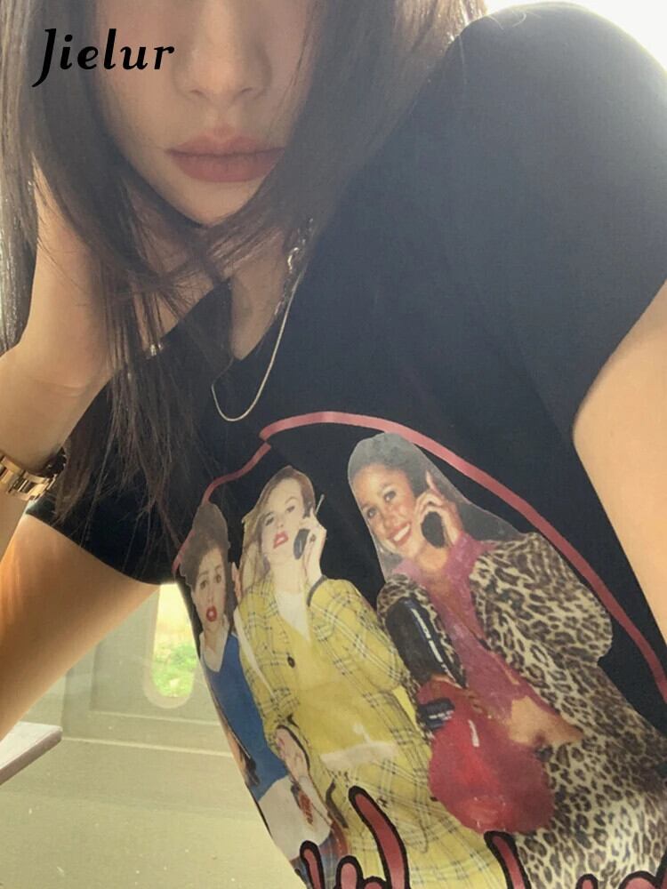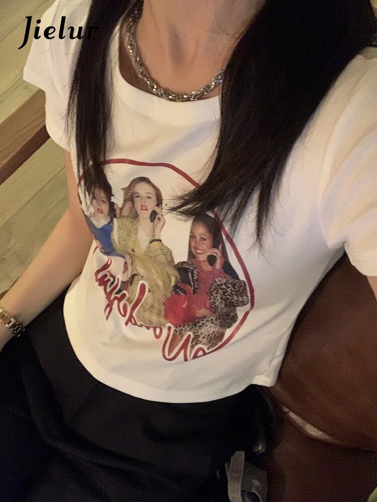 送料無料 Jielur キャラクタープリントクロップトップ半袖女性 Tシャツ O ネックスリムブラックホワイト Tシャツ夏のストリートショートトップス Tシャツ ハーフスリーブ サマー 夏物 Oネック AE12188787834374386141