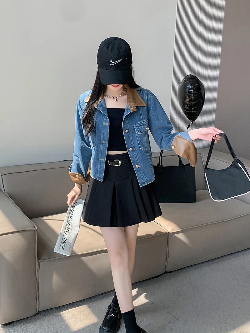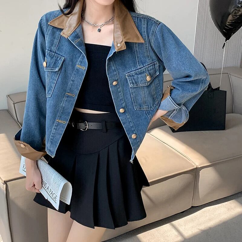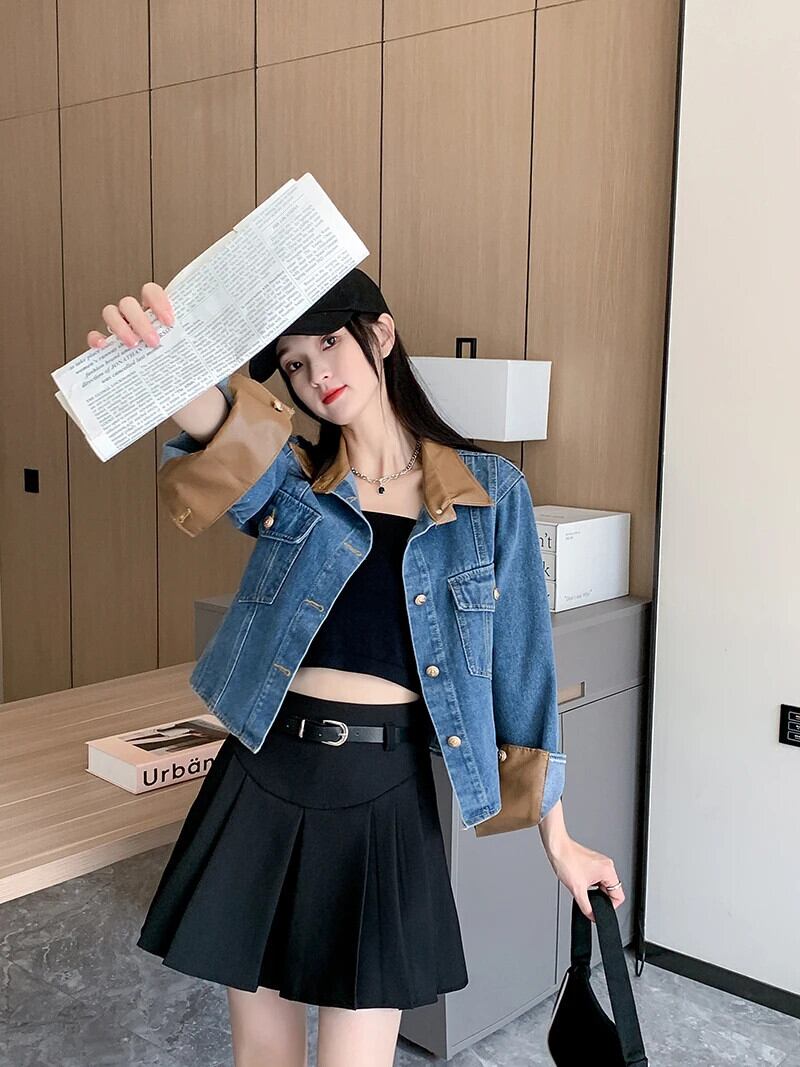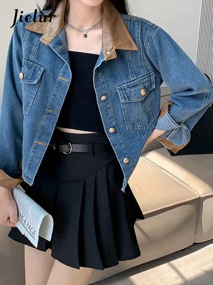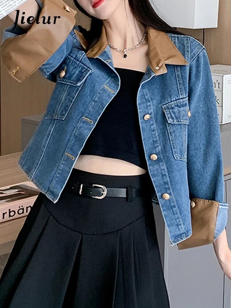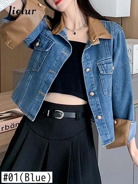 送料無料 Jielur 夏ヴィンテージデニム女性シャツコントラストカラールーズシャツ女性ブルーストリート長袖トップ ロング サマー 夏物 ビンテージ AE12188787855994030118