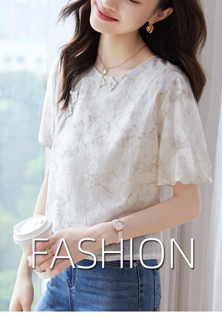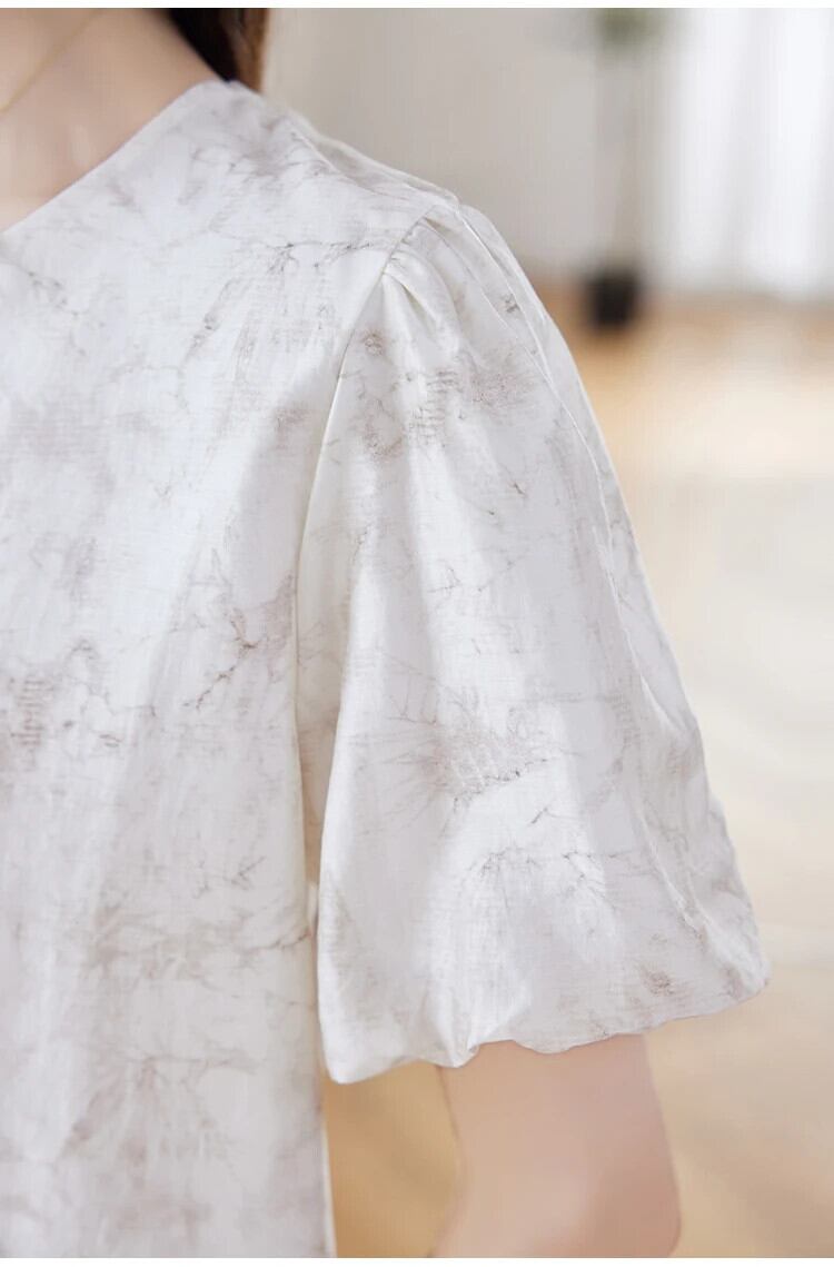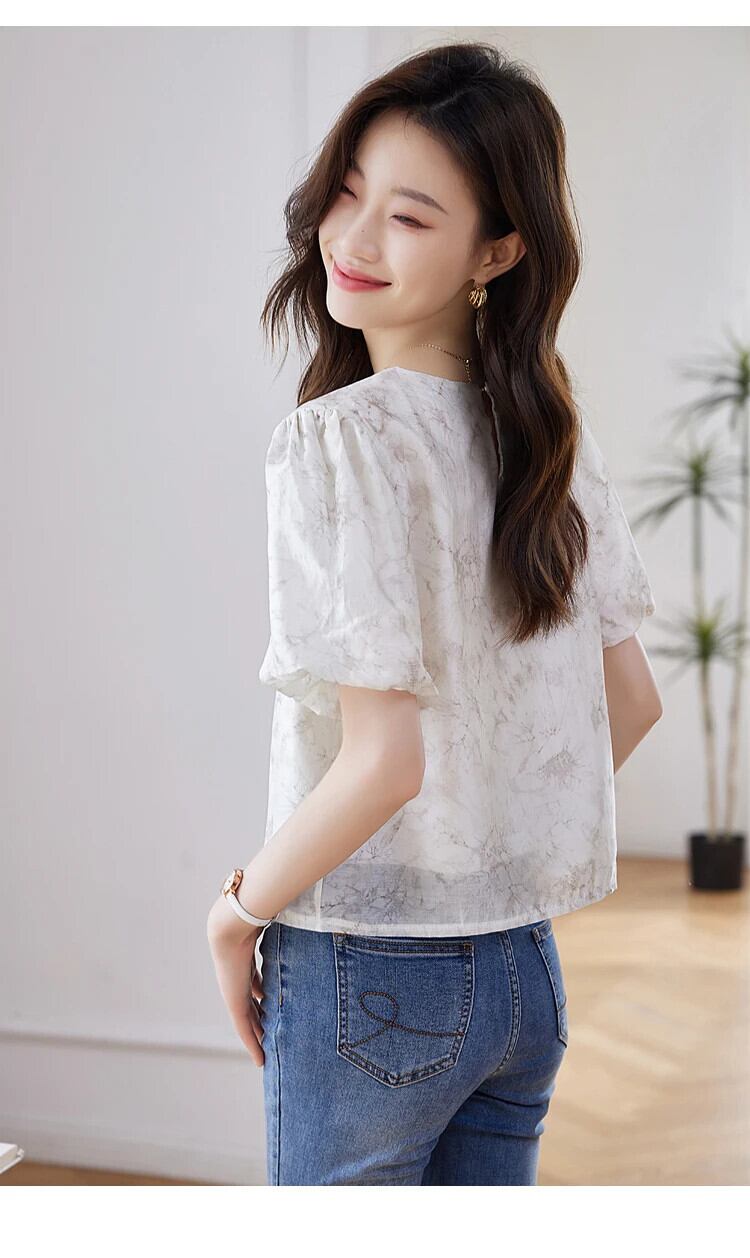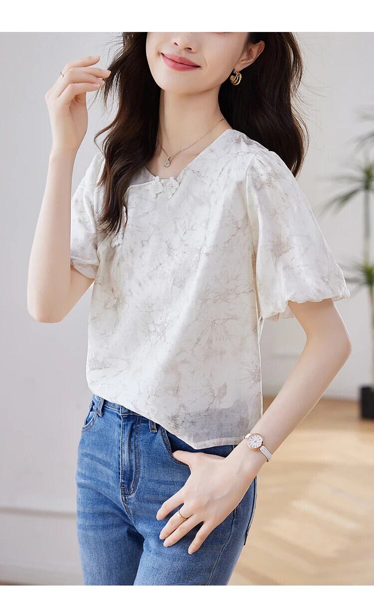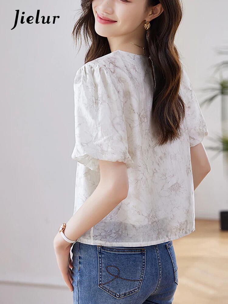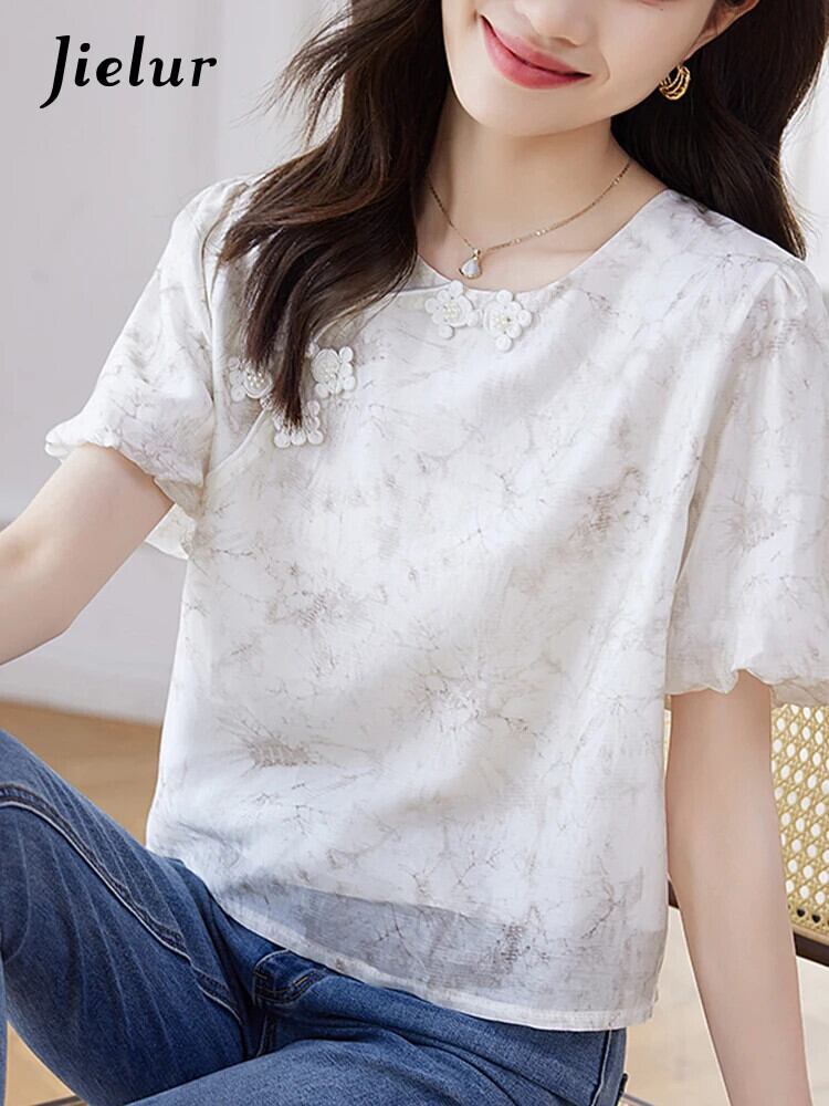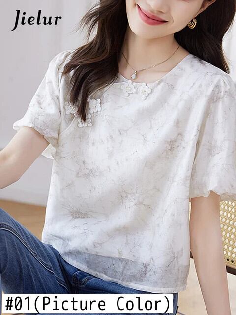 送料無料 Jielur 夏中国シックな女性ブラウス甘いブラウス女性ルーズ O ネックパフスリーブトップ 大人ガーリー スウィート キュート カジュアル サマー 夏物 Oネック AE12188787848927213366
