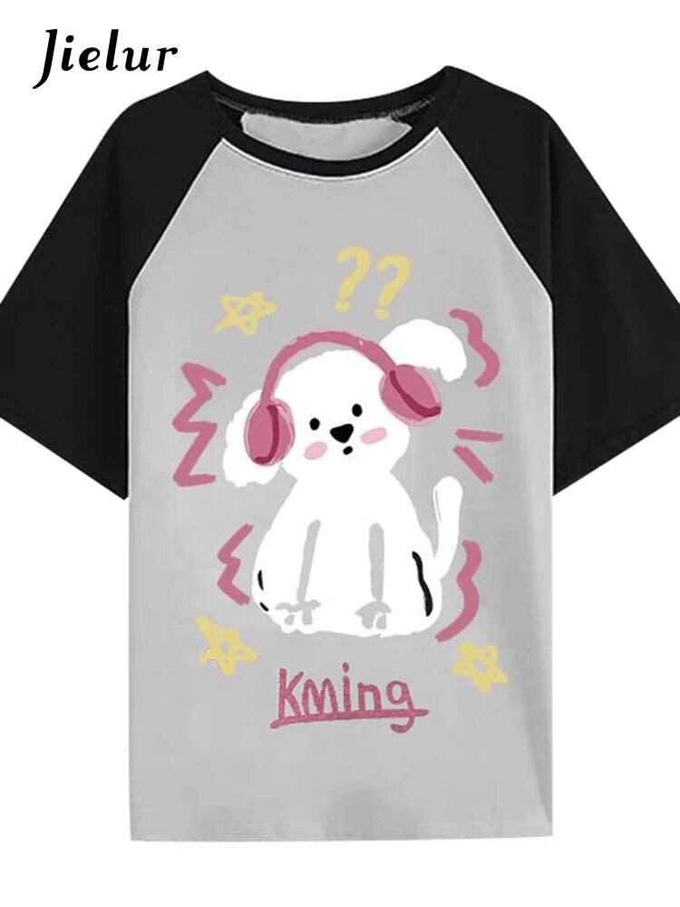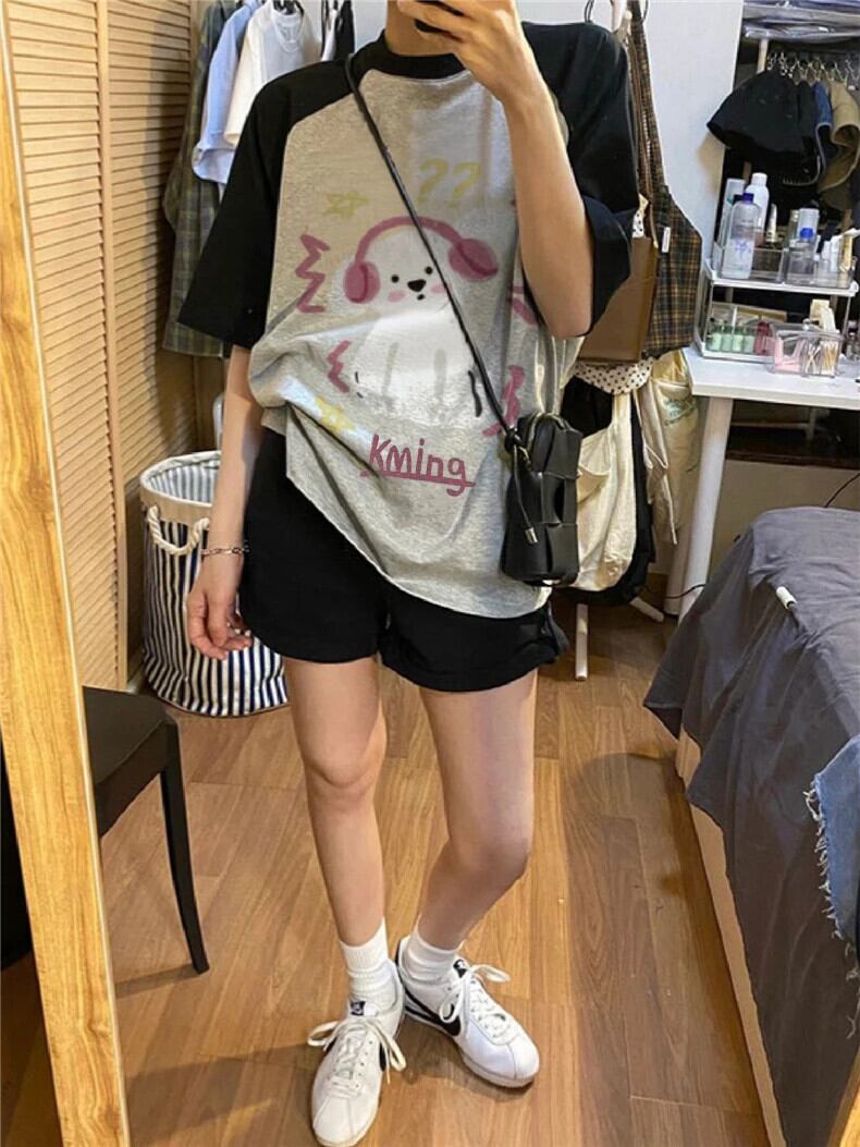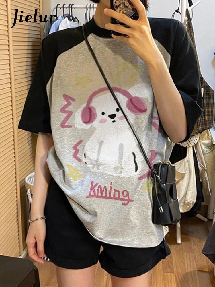 送料無料 Jielur 夏アメリカンヴィンテージ女性の Tシャツスリムルーズフィット Tシャツ女性黒グレーストリートトップ ブラック サマー 夏物 ビンテージ AE12188787899908010360