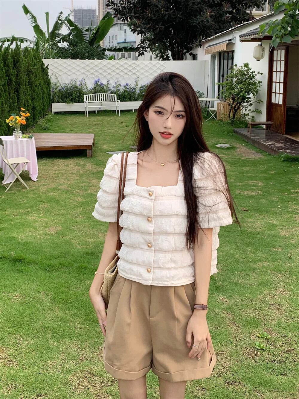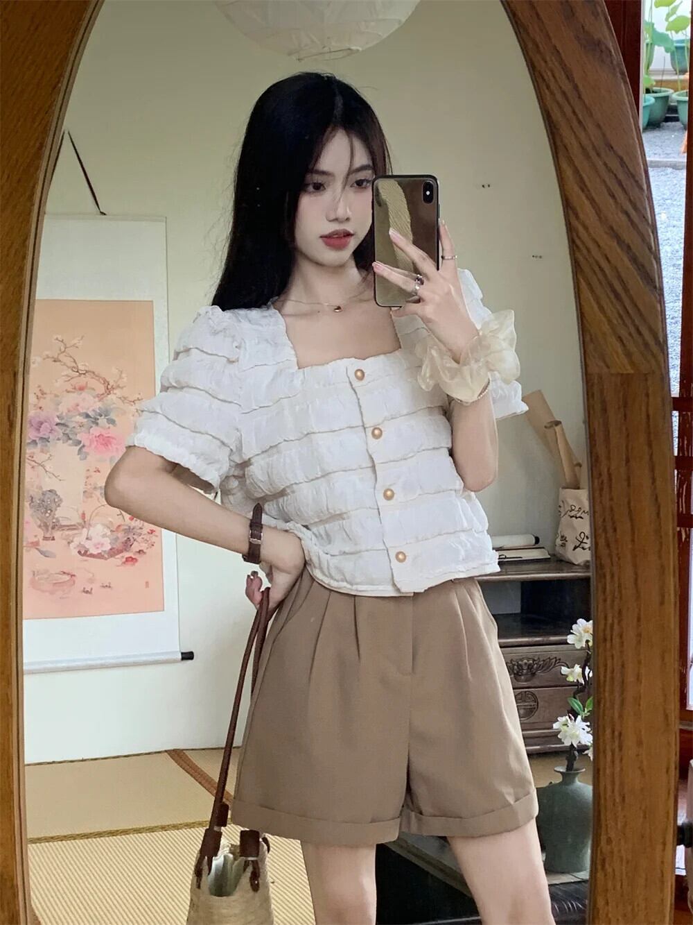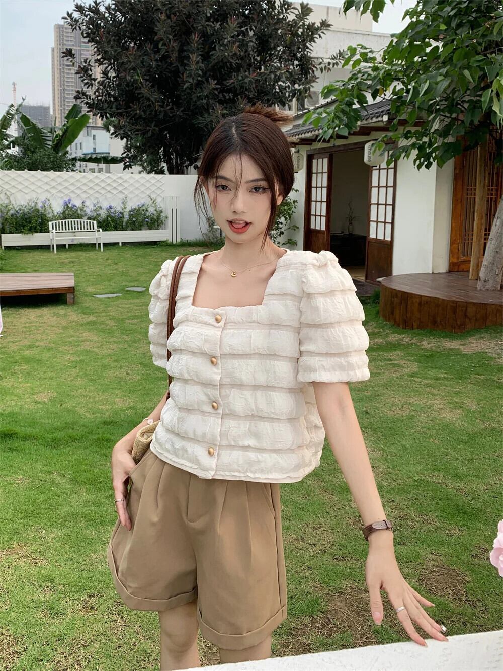 送料無料 Jielur 夏ソリッドカラーの女性のシャツスウィートレディシックなシャツ女性カーキウエストスリムストリートショーツ 大人ガーリー キュート カジュアル サマー 夏物 ブルマー AE12188787892655812927