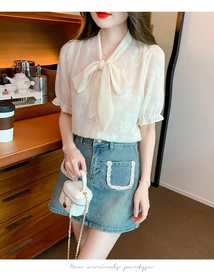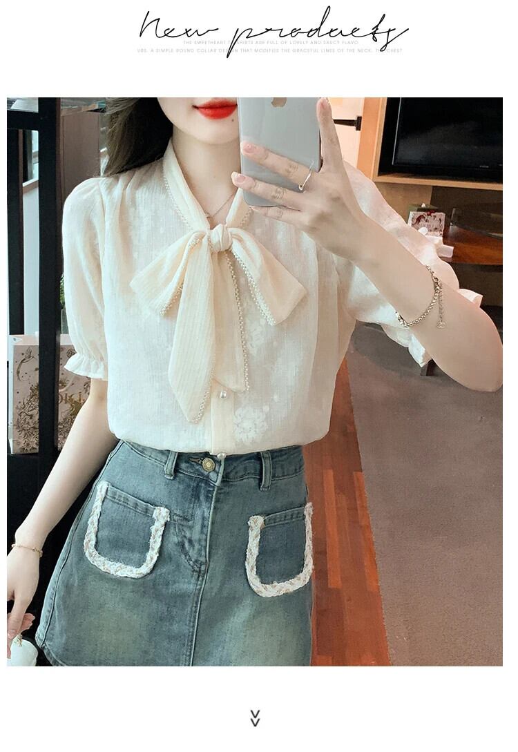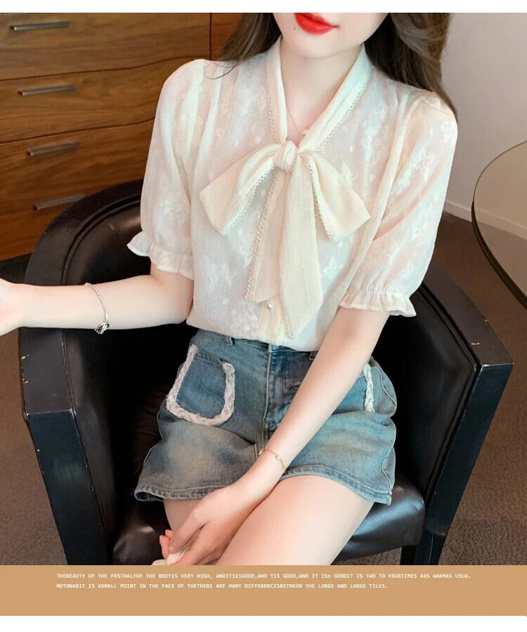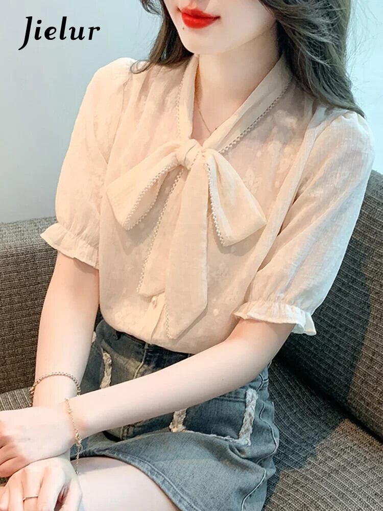 送料無料 Jielur 夏ソリッドカラーの女性ブラウス甘いルーズブラウス女性アプリコットちょう結びレーストップ リボン 大人ガーリー スウィート キュート カジュアル サマー 夏物 AE12188787861878319674