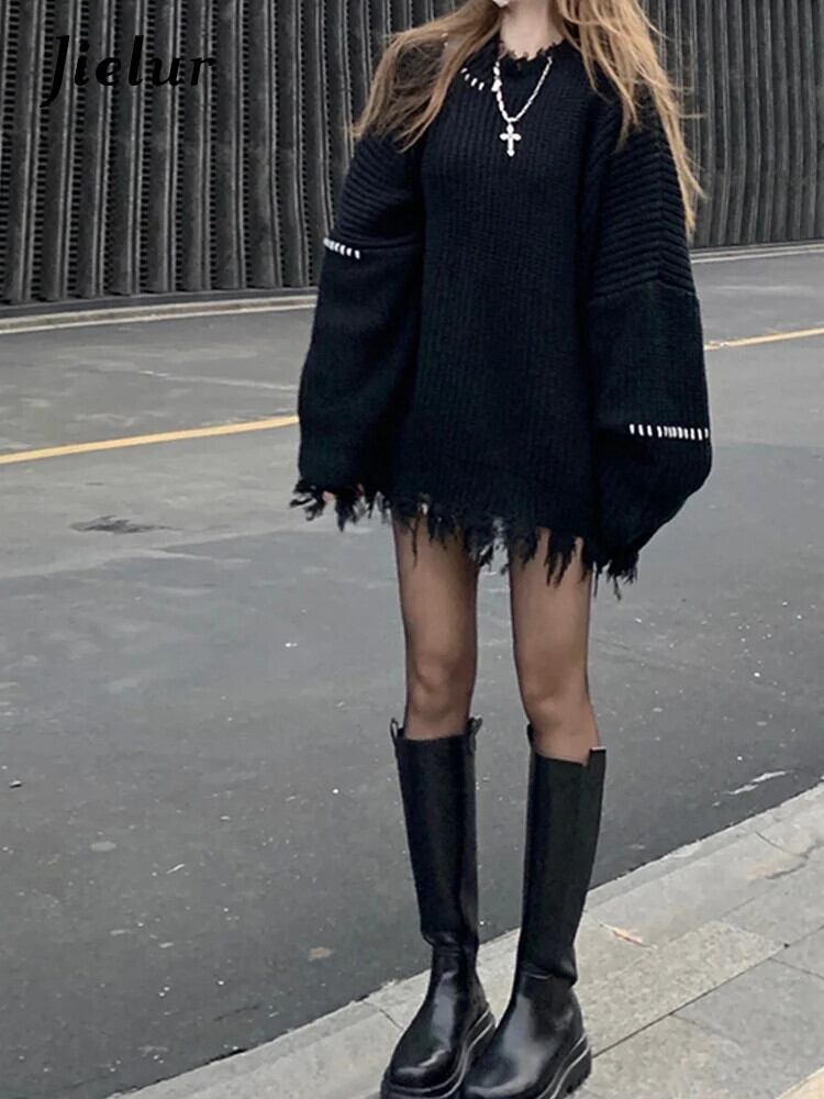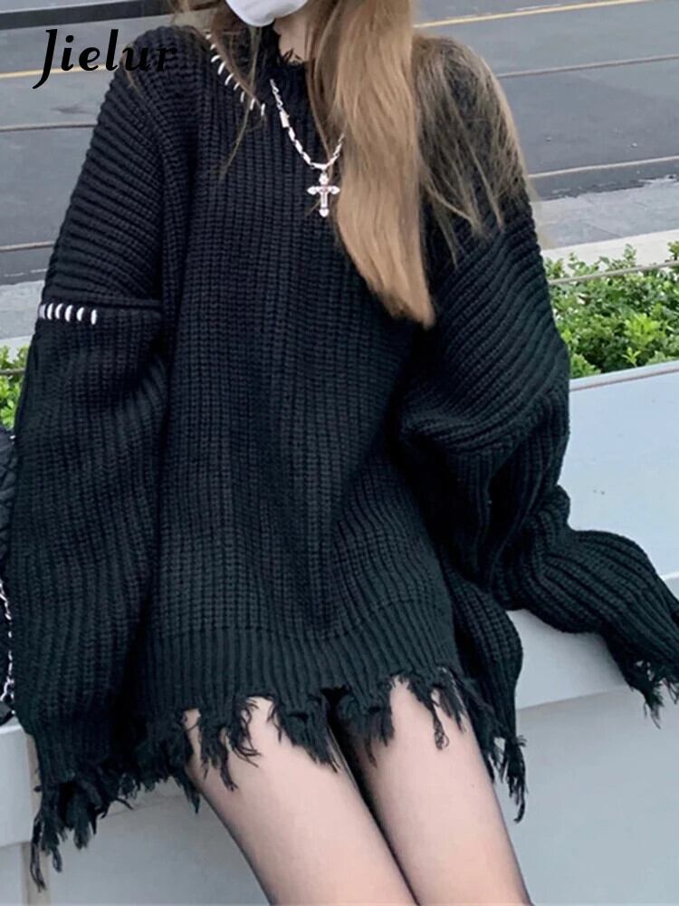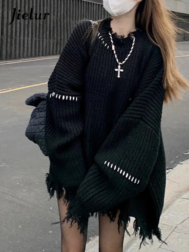 送料無料 Jielur 秋ルーズコントラストカラープルオーバー女性シンプルなスリムソリッドカラートップニットベーシックストリートニットトップ オータム 秋物 AE12188787818183109940