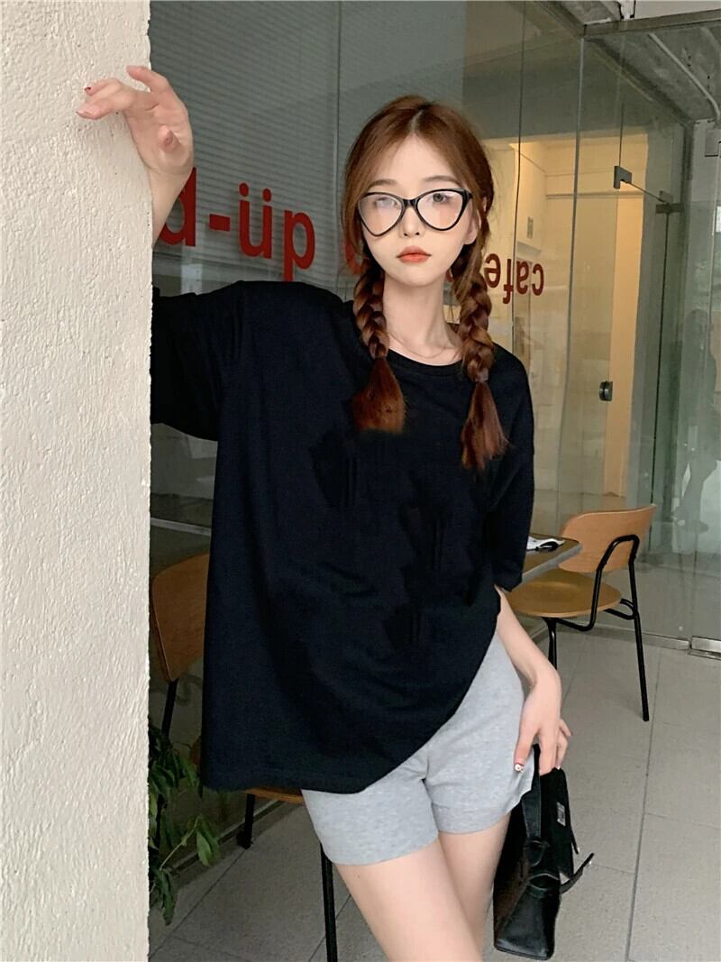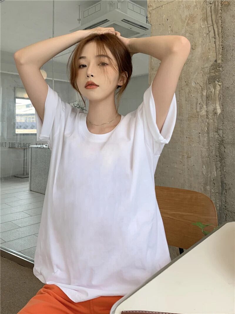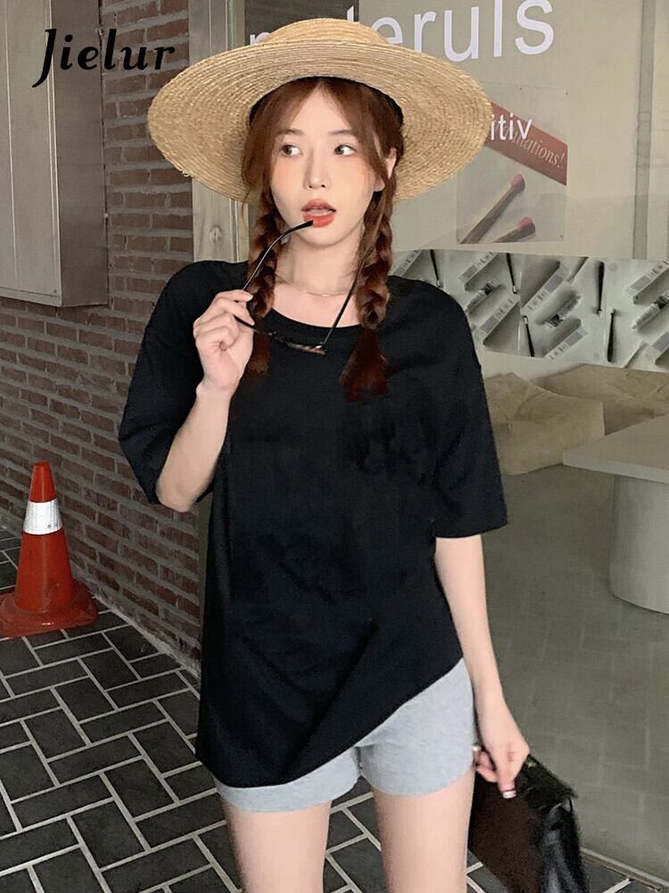 送料無料 Jielur 夏ルーズホワイト Tシャツ女性黒綿の基本半袖 Tシャツ女性の純粋なカラー Tシャツシンプルな O ネックトップス ブラック コットン サマー 夏物 Oネック ピュア AE12188787888053161039